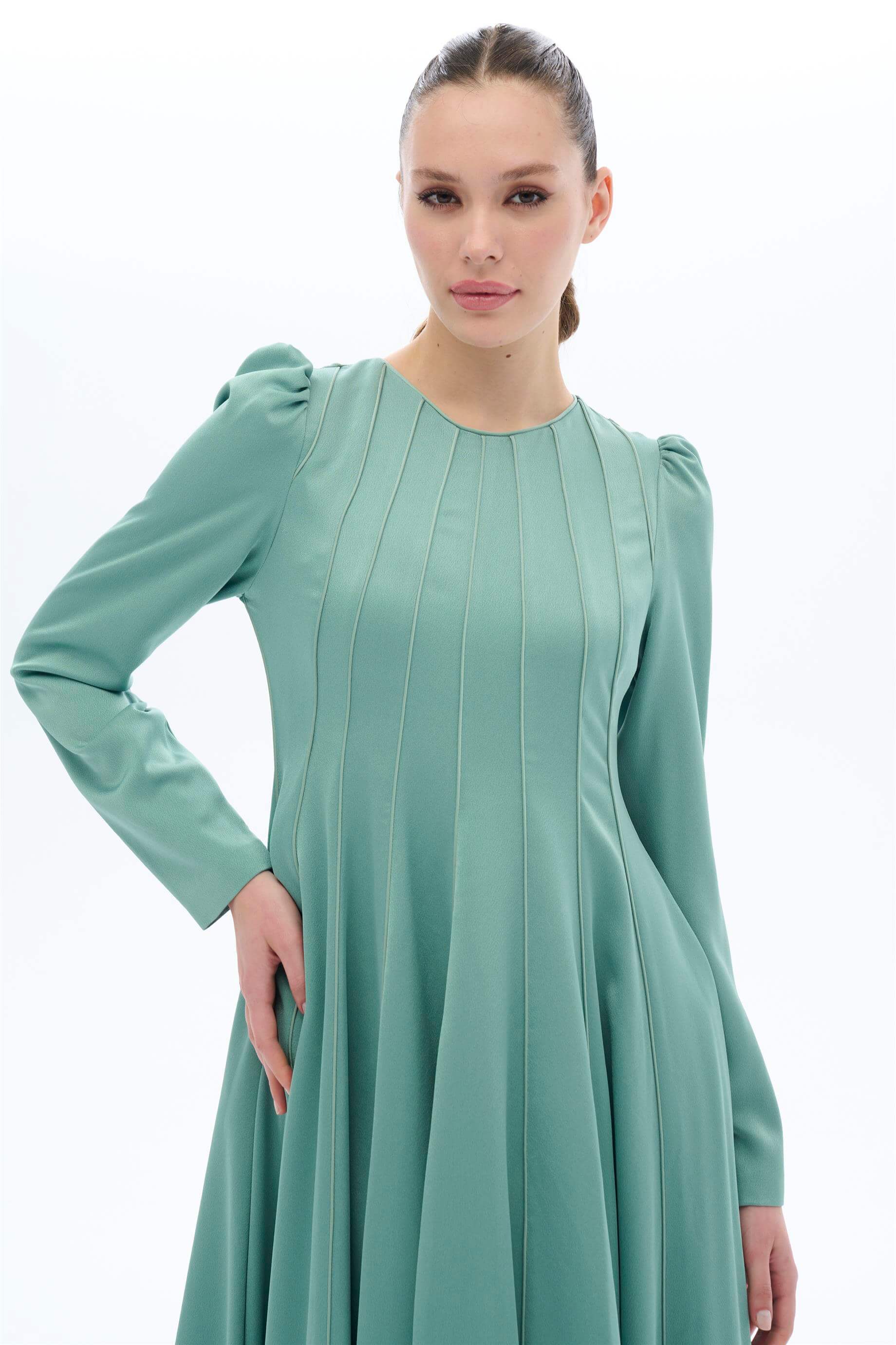 A structured full-length dress crafted from textured jacquard fabric and refined with satin piping that visually elongates the bodice. The clean round neckline, softly shaped shoulders, and vertical panel construction create an elegant tailored upper line, while the gently flared skirt provides balanced volume and controlled movement. Designed for cooler seasons, the fabric blend offers warmth, stability, and comfortable stretch for all-day wear.