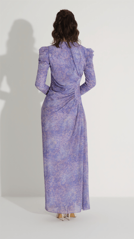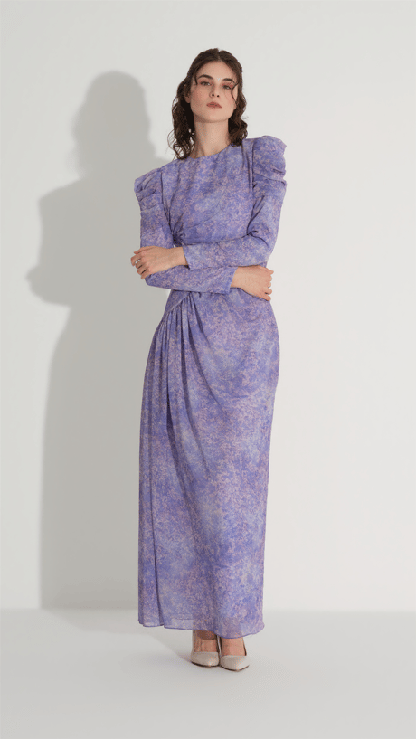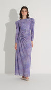 A sleek and contemporary silhouette defined by sculptural draping and refined structure. This dress features a fitted shape enhanced by circular-inspired side ruching, creating depth and dimension around the waist. The clean neckline and long sleeves balance the design, while the fluid fabric ensures a smooth, elegant fall - ideal for sophisticated evening looks.