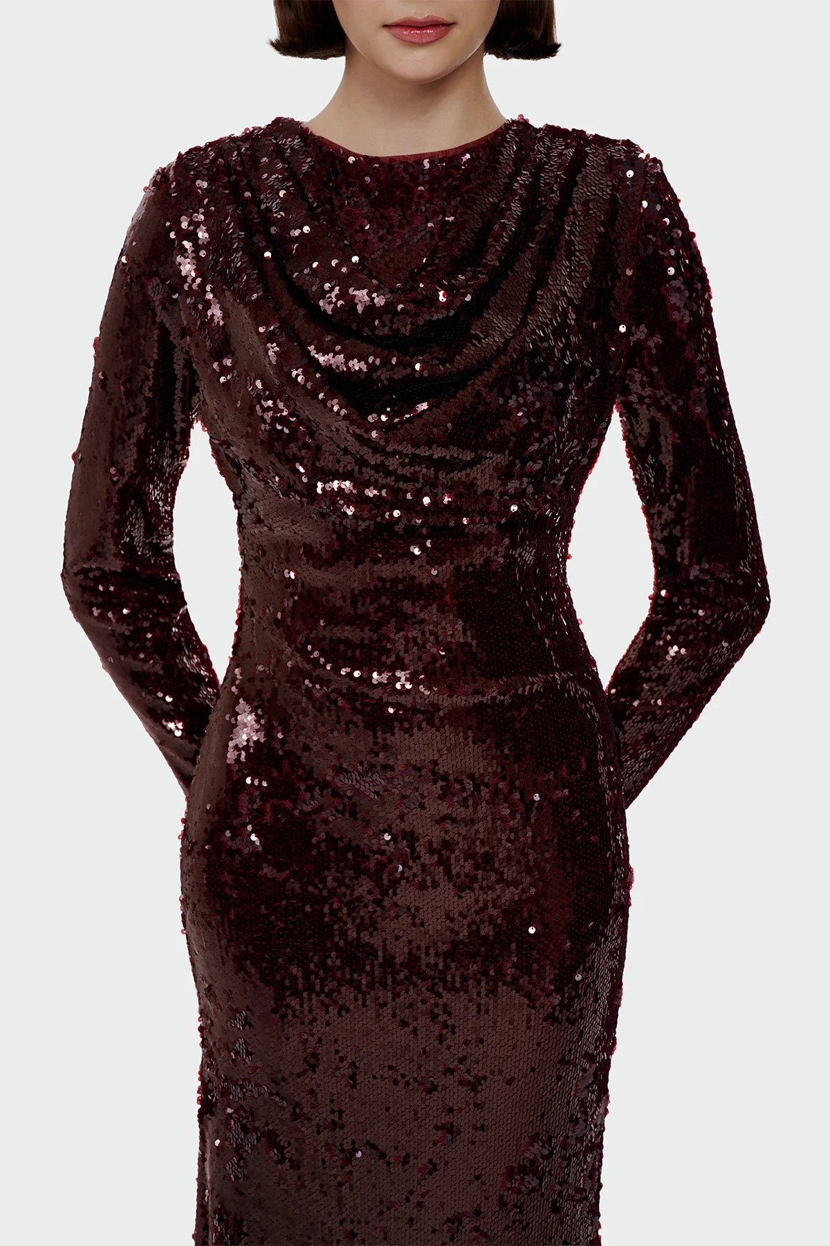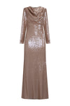 This long-sleeve sequin gown features a draped neckline that adds fluid dimension to the structured silhouette. The fully embellished surface creates a subtle, luminous sheen, while the clean lines and elongated form maintain an elegant, modern balance suitable for formal occasions.