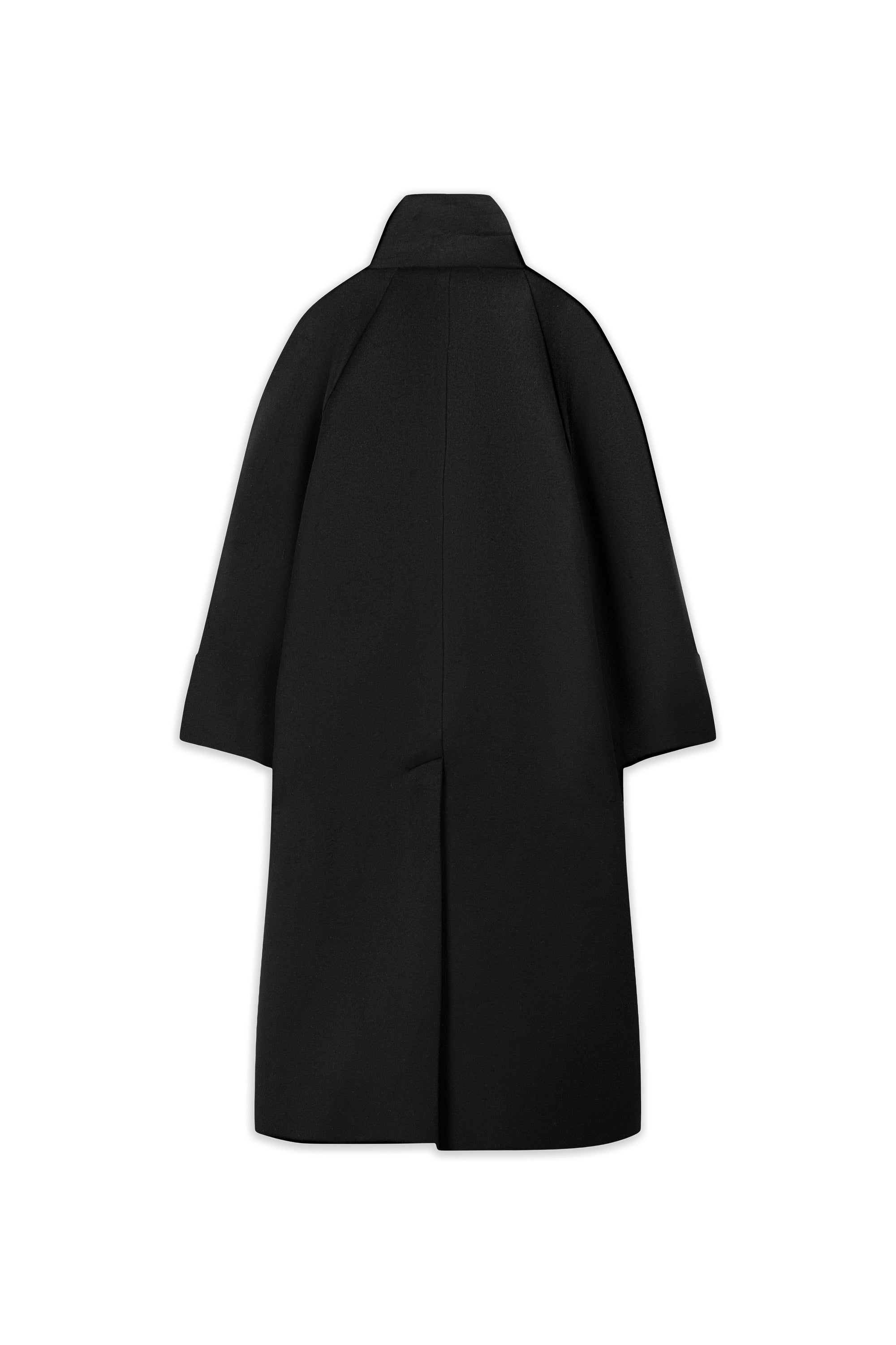 This long coat is defined by a strong, oversized silhouette and a sculptural high neckline that frames the look with modern elegance. Designed with a front button closure, raglan sleeves, and a back vent for ease of movement, it balances structure with comfort. Adjustable sleeve epaulettes and a fully lined interior complete this refined outerwear piece.