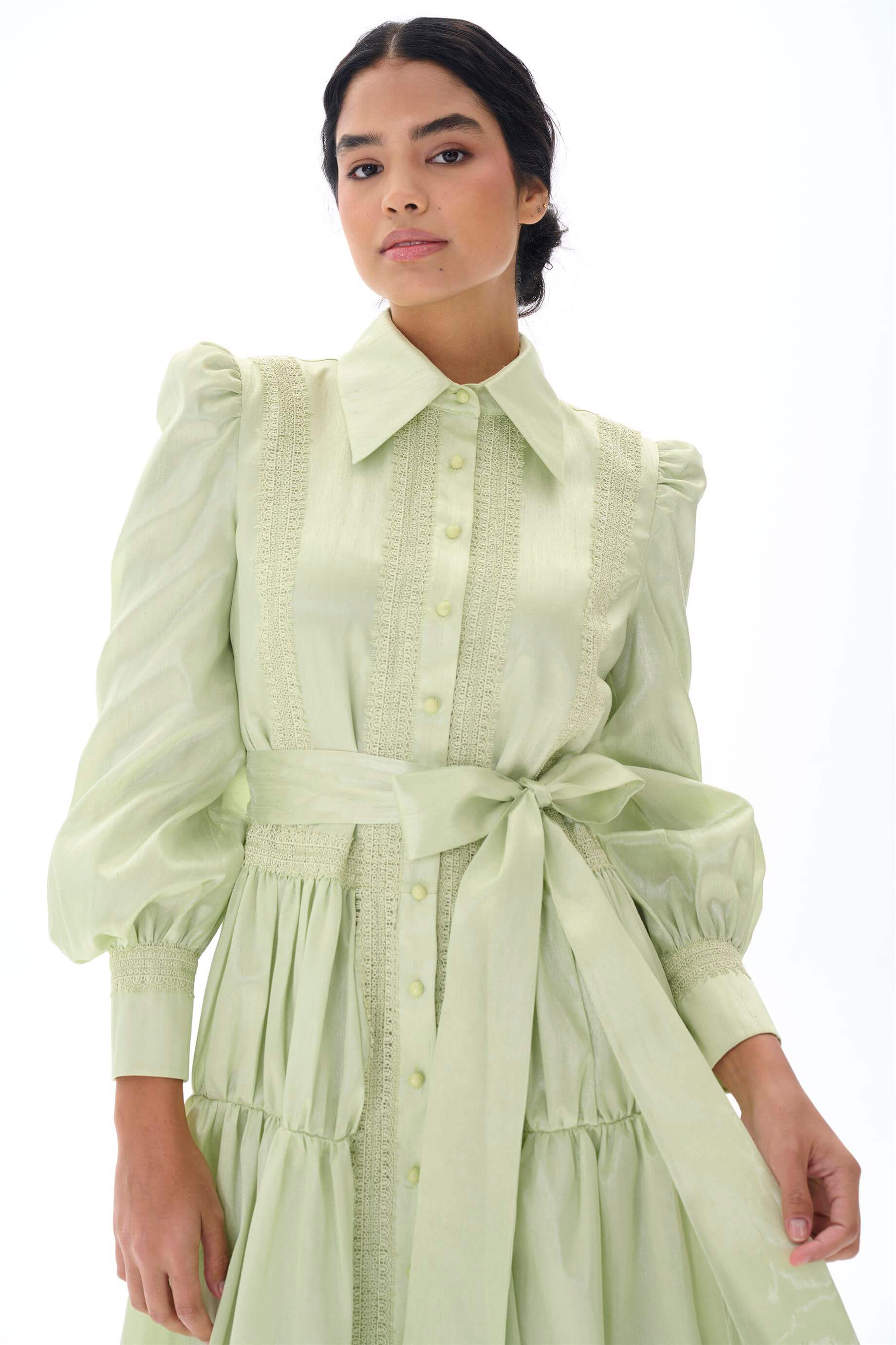 This refined shirt-style maxi dress is crafted from a lightweight structured fabric with a subtle sheen, creating an elegant balance between tailoring and fluid movement. The button-front bodice is framed with delicate lace panel inserts, while softly puffed sleeves and detailed cuffs enhance its feminine structure. A self-tie waist belt defines the silhouette, and the full gathered skirt adds graceful volume for a timeless formal look.