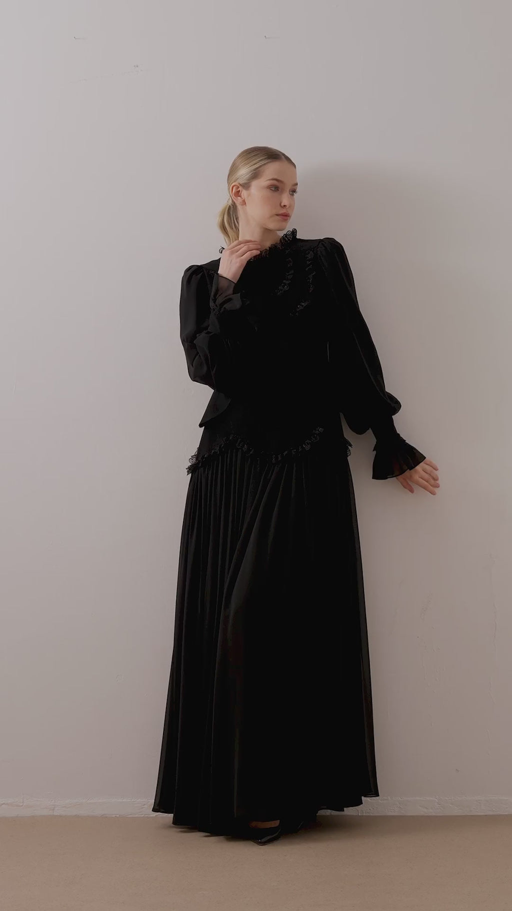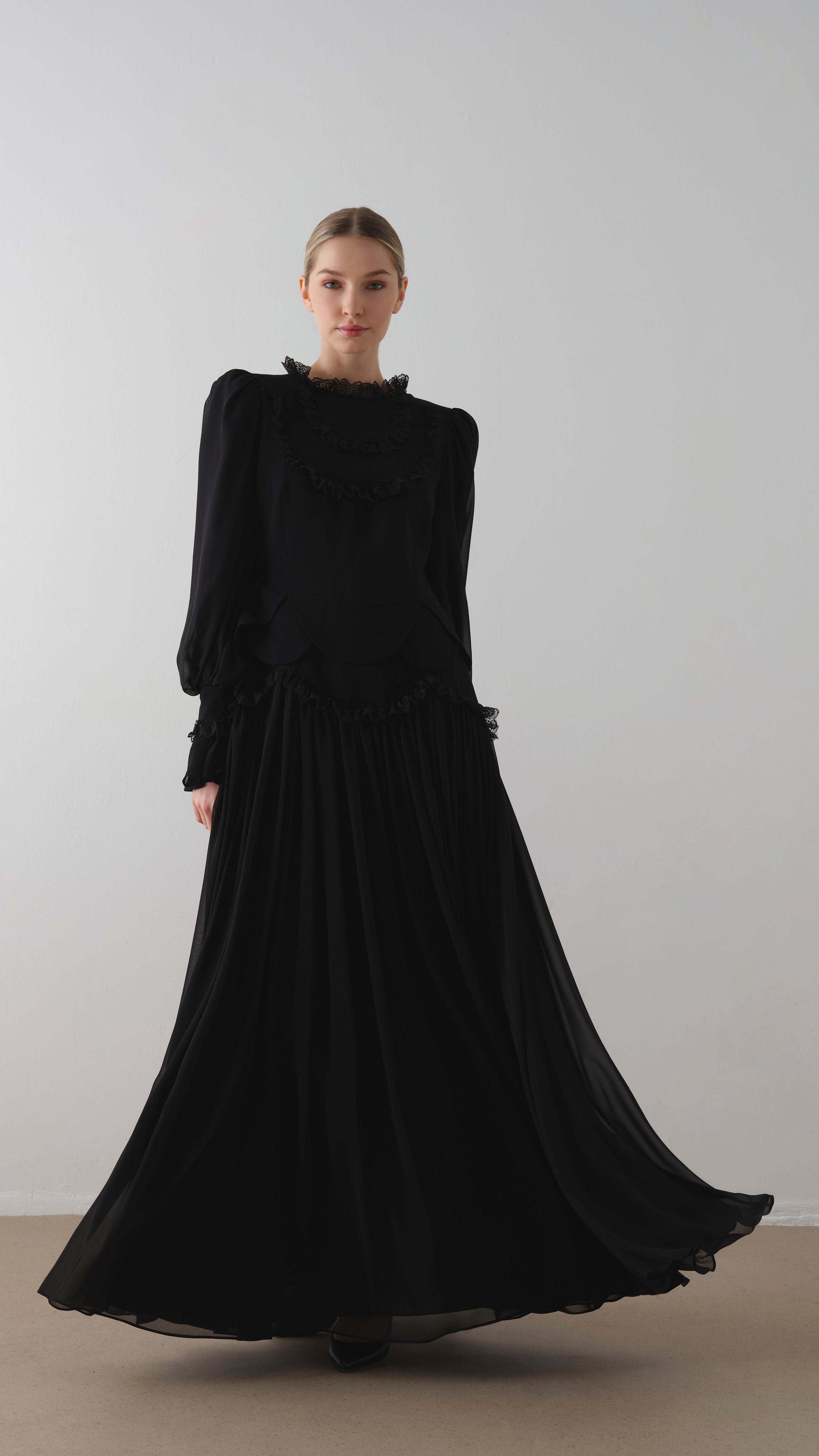 A romantic and graceful design that captures timeless femininity. This mint green maxi dress features a fitted crepe bodice with layered detailing at the waist and cuffs, accented by delicate lace trims. The chiffon skirt flows elegantly with every movement, offering a soft and ethereal look perfect for formal occasions or evening gatherings.