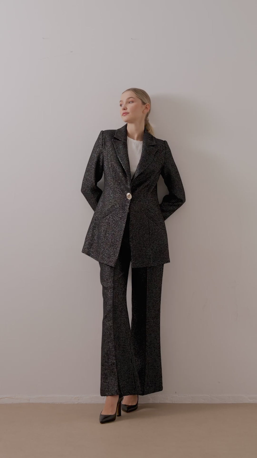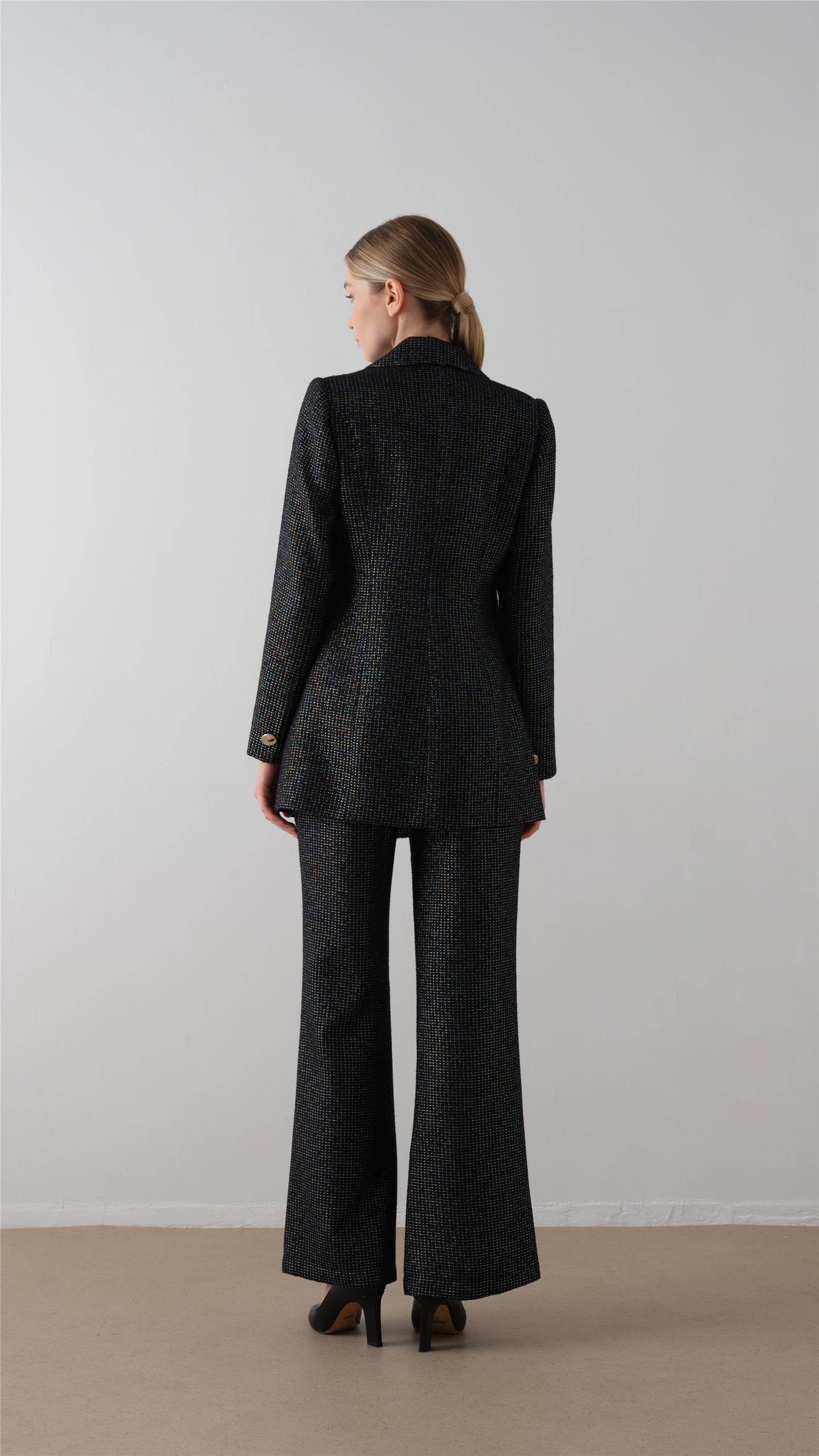 A modern reinterpretation of classic Chanel-inspired tailoring, this two-piece suit blends sophistication with subtle shimmer. The blazer features a broad lapel, pleated sleeve detail, and a single gold-tone button, while the matching flared trousers add a refined elongation to the silhouette. Perfect for elevated business looks or elegant evening occasions.