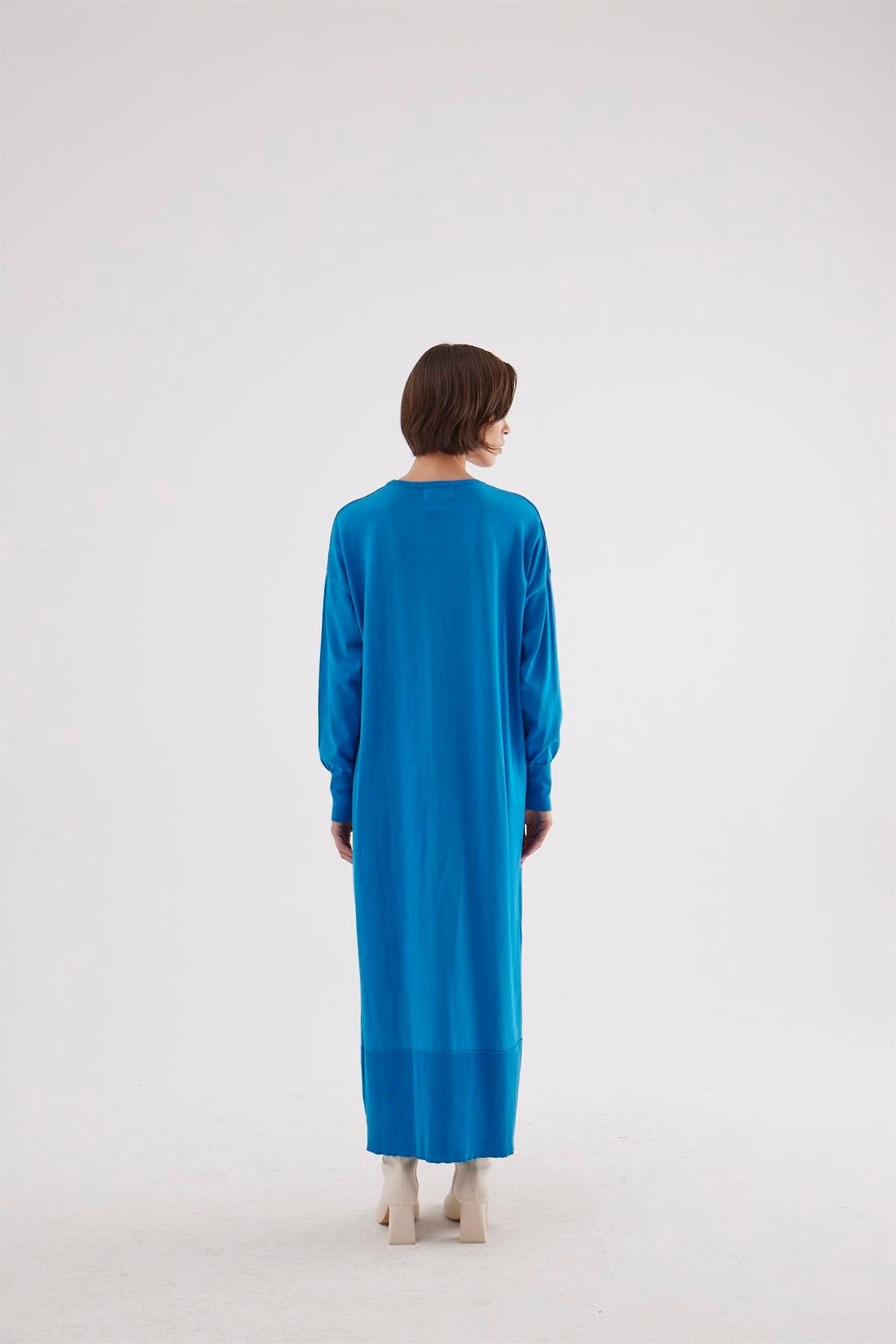 Designed for cooler seasons, the Nalia dress presents a refined balance of minimalism and comfort. Crafted from mercerized knit fabric, this maxi silhouette offers a smooth, softly lustrous surface with a fluid drape that falls elegantly along the body. The relaxed straight cut, long sleeves, and clean round neckline create a timeless, understated look suitable for everyday wear, work styling, or elevated casual occasions. Finished with a subtle hem panel detail, the design emphasizes simplicity while maintaining a polished, contemporary feel.