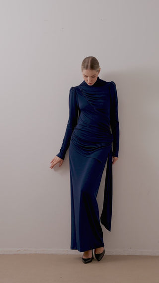 An effortlessly elegant piece designed to make a statement. Crafted from a soft stretch fabric with a subtle shimmer, this dress features a ruched bodice and side draping that beautifully enhance the silhouette. The high neckline and long sleeves add a touch of sophistication, making it ideal for formal gatherings or evening events.