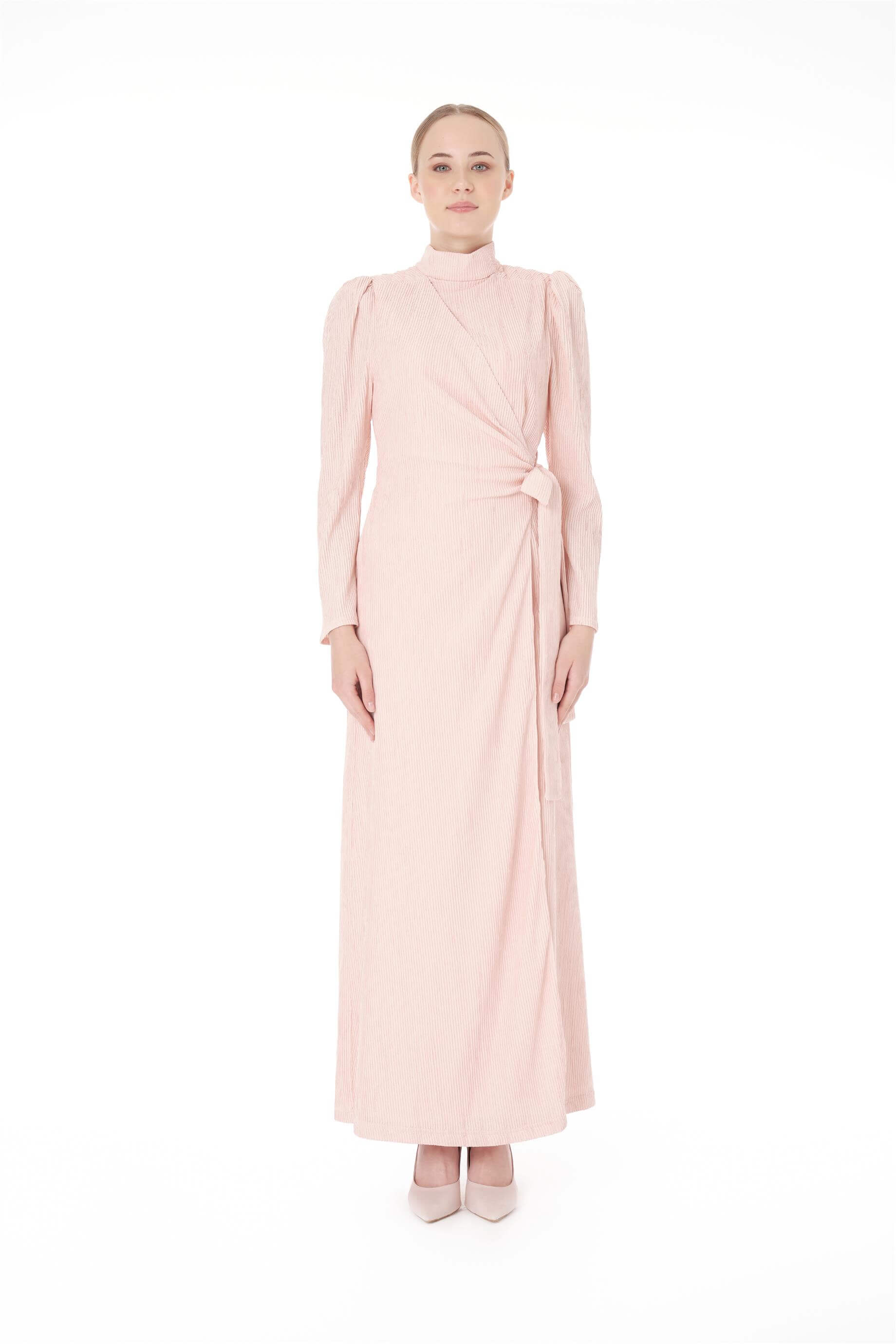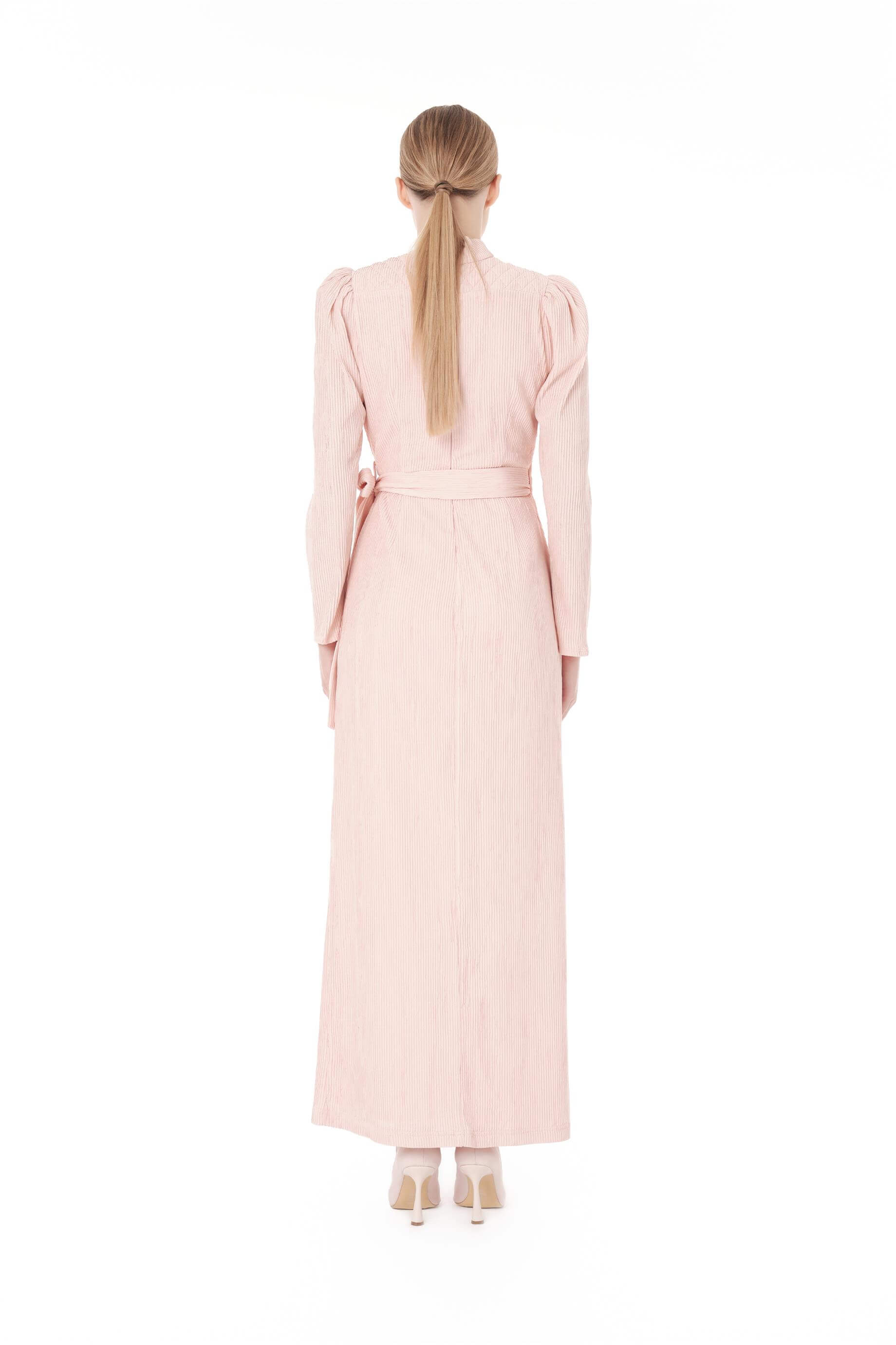 This refined maxi dress is tailored with a clean architectural silhouette and a softly textured fabric that enhances structure while maintaining comfort. The wrap-style front with waist tie defines the figure, while the high neckline, quilted yoke detailing, and subtle shoulder structure lend a polished, contemporary finish. Designed for elegant day-to-evening wear with a balanced, feminine line.