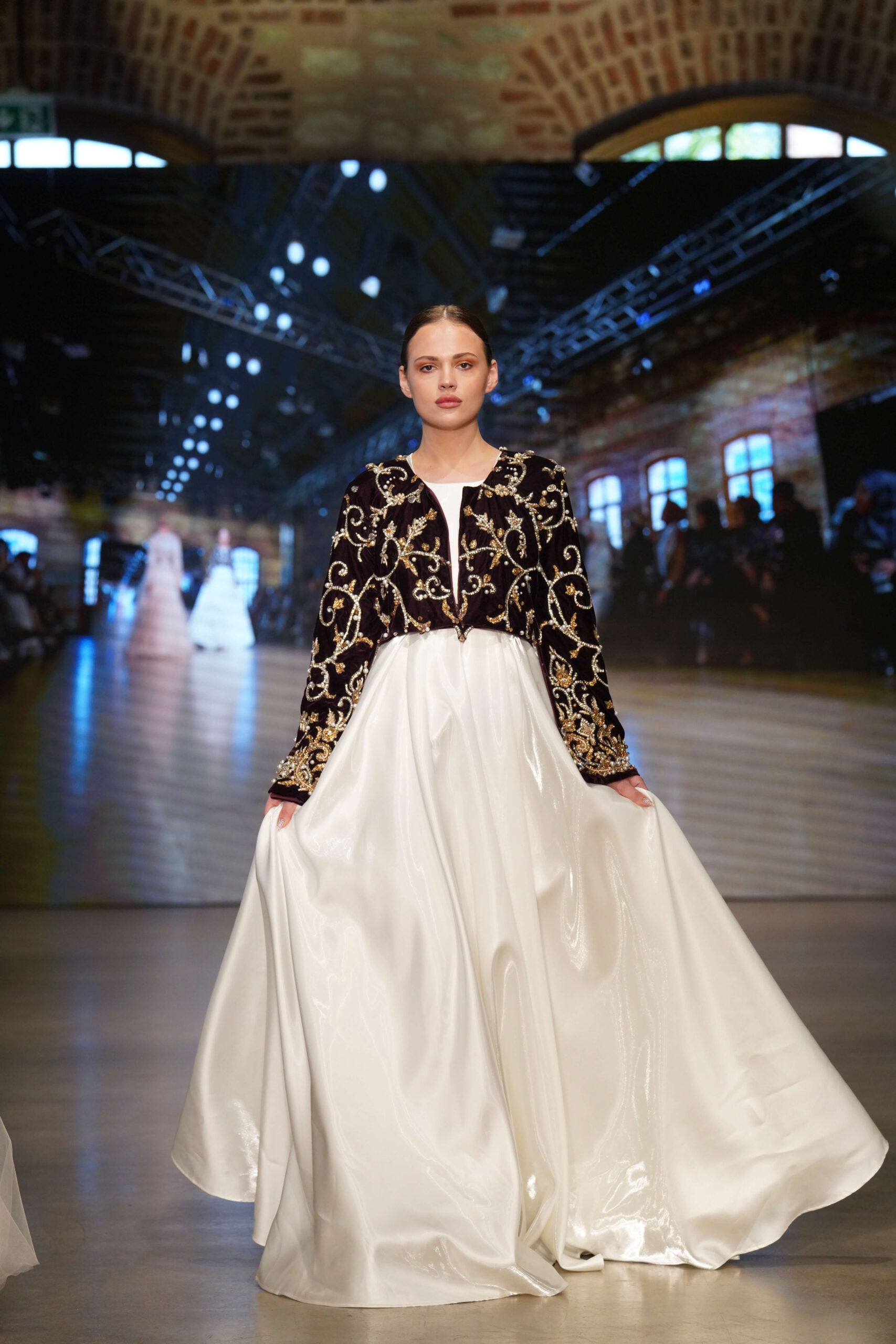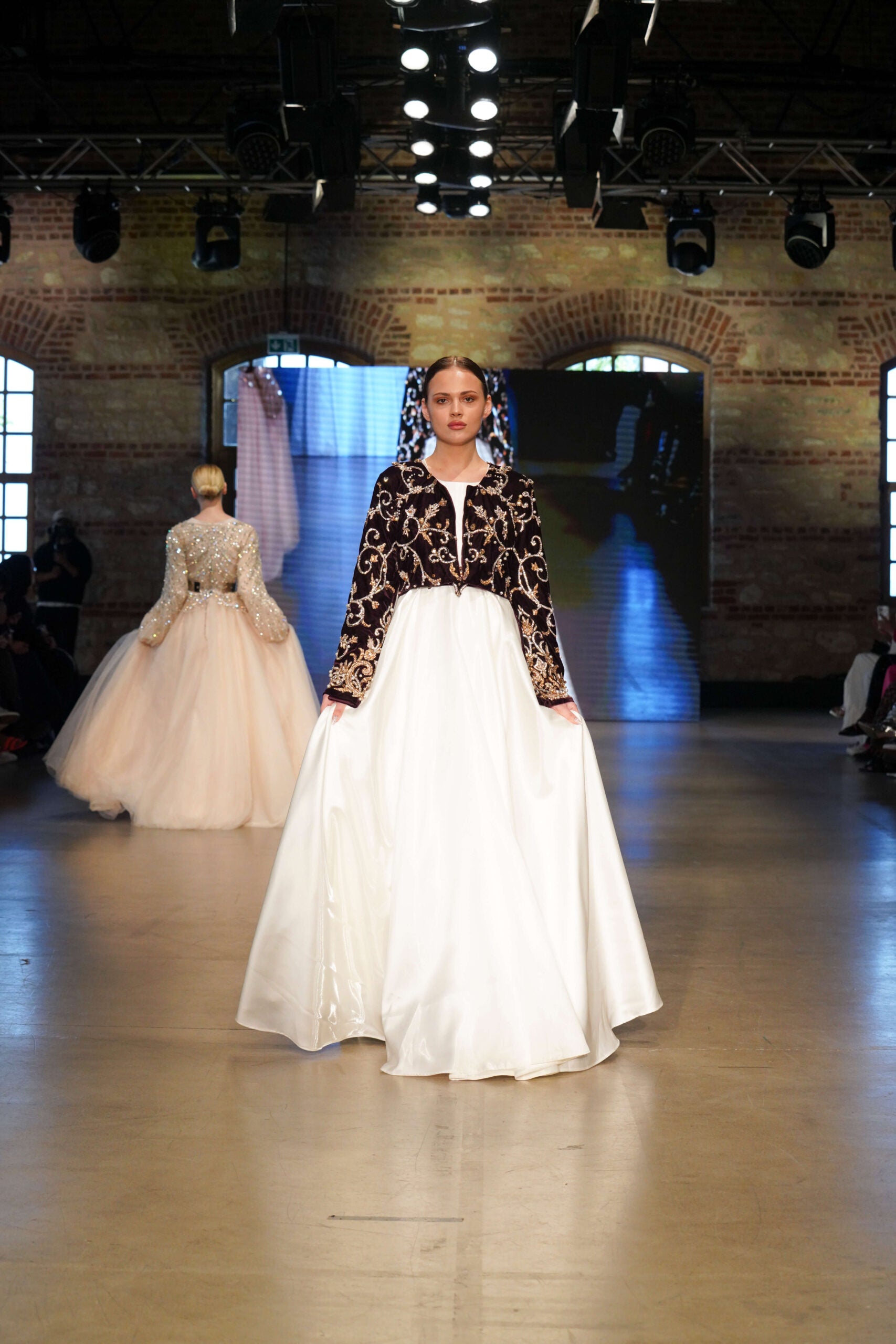 A ceremonial vision of heritage and modern refinement, this ensemble pairs a luminous flowing undergown with a richly adorned vest, celebrating the elegance of Balkan craftsmanship. The contrast between the fluid satin base and the ornate velvet vest creates a striking balance of softness and structure. Hand-embroidered with shimmering crystals and metallic threads, each motif draws inspiration from Ottoman and Balkan ornamental traditions, lending the design a sense of timeless grandeur and quiet authority.