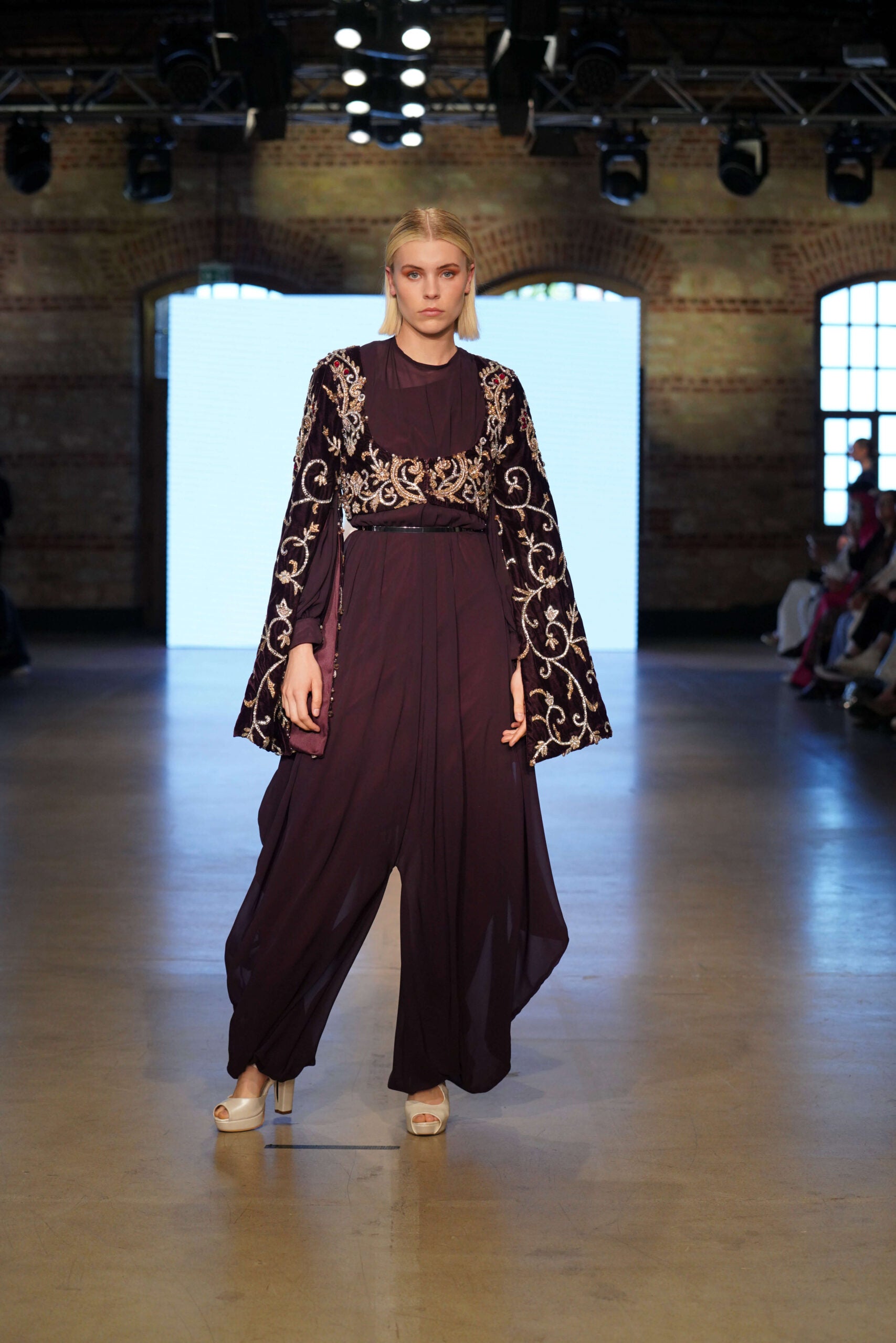 A contemporary interpretation of Balkan heritage, this refined ensemble unites a richly hand-embroidered vest with flowing traditional Bosniak šalvare. The vest is meticulously adorned with gold and silver threadwork, forming intricate motifs that echo centuries of craftsmanship while embracing a modern silhouette. The softly draped šalvare balance structure with ease, creating graceful movement and effortless elegance. Designed for a woman who honors tradition yet defines it on her own terms, this piece embodies cultural pride through elevated couture.