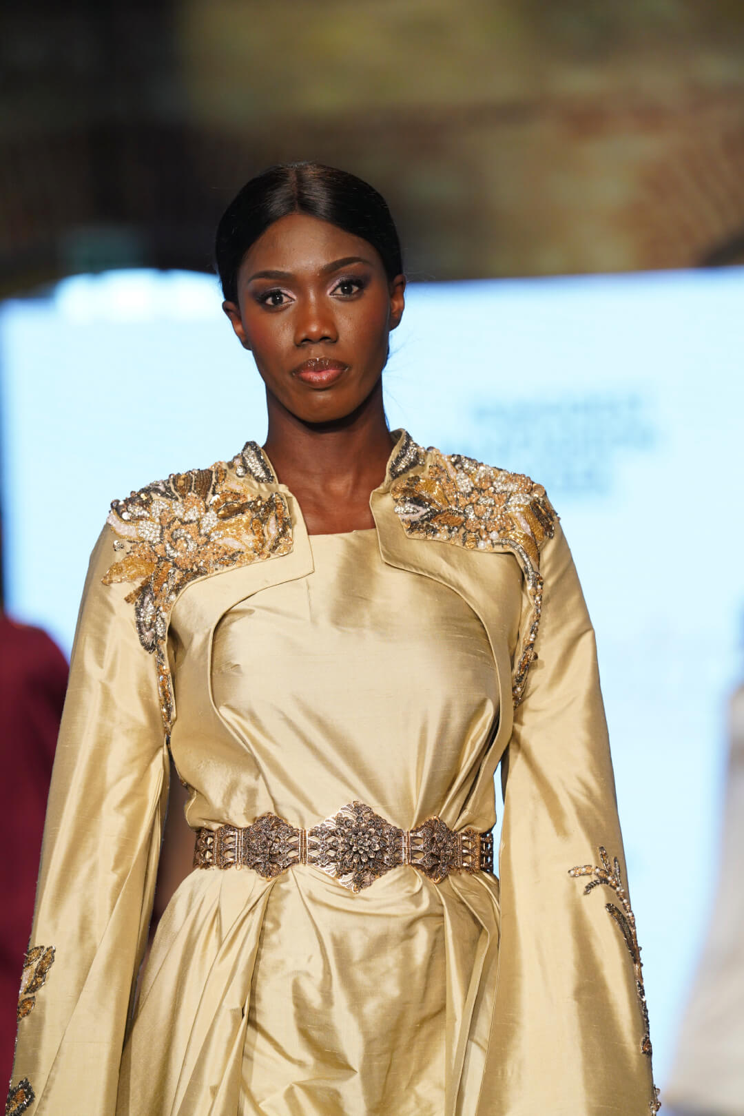 • Details: Handmade embroidery; ornate shoulder embellishments; floor-length statement sleeves; antique gold satin finish