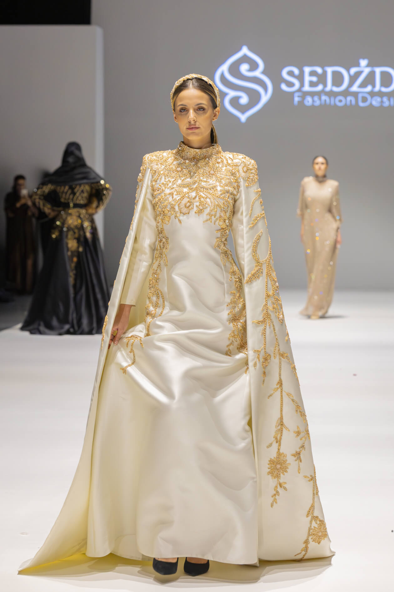 A fairy-tale vision brought to life through couture craftsmanship. This gown is defined by its majestic train and elongated sleeves adorned with intricate floral motifs. Golden threads intertwine with shimmering micro-crystals, creating a luminous surface that moves gracefully with every step. Regal yet ethereal, this design embodies ceremonial elegance and timeless femininity, crafted for moments that demand presence and grandeur.