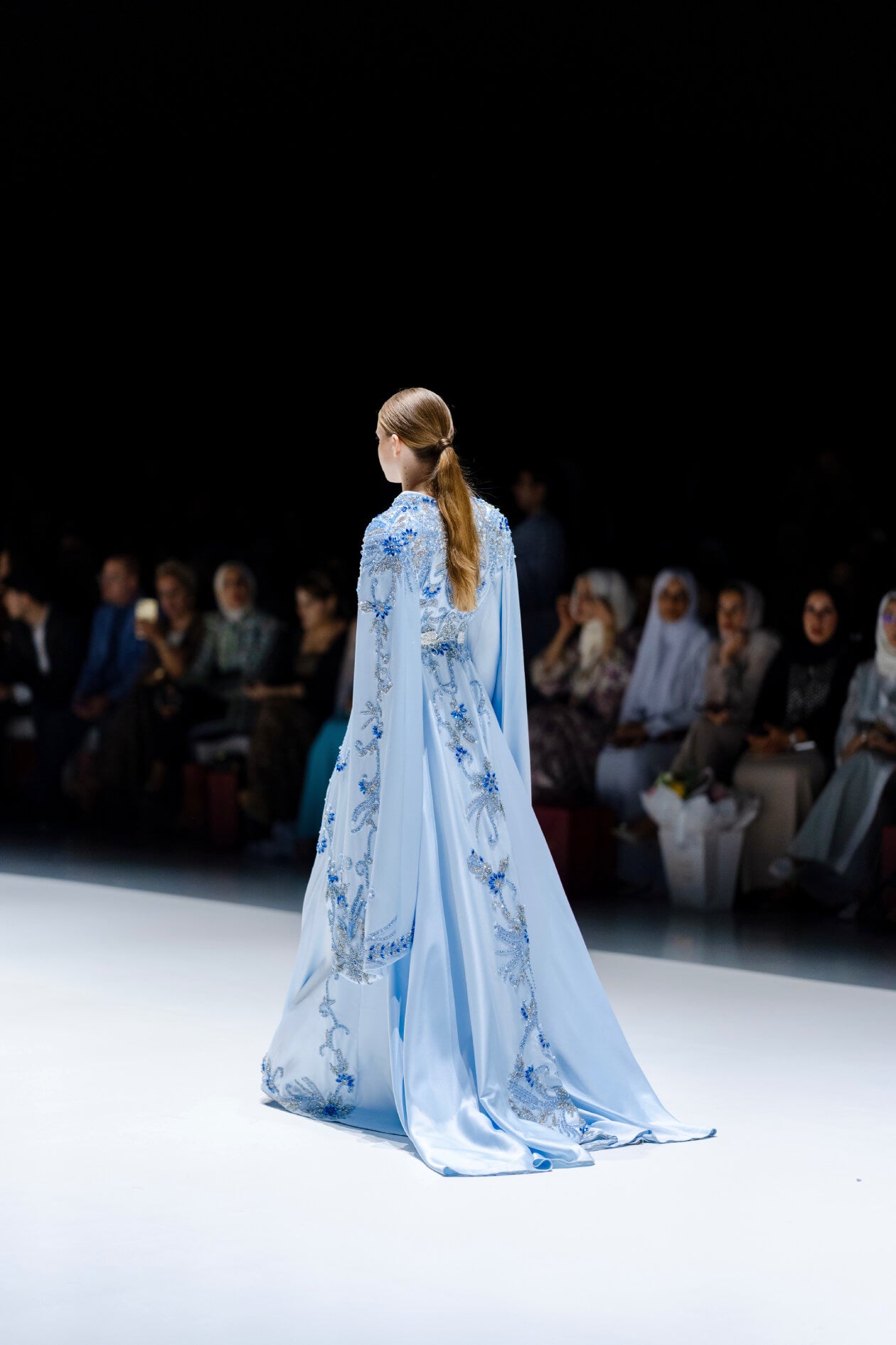 An ethereal gown defined by its flowing silhouette and lavish sleeves, richly adorned with delicate hand embroidery. Floral motifs unfold across the fabric in harmonious rhythm, enhancing the serenity and depth of the soft blue hue. Graceful yet expressive, this design captures ceremonial elegance with a refined couture sensibility - created for moments that call for quiet strength and luminous beauty.