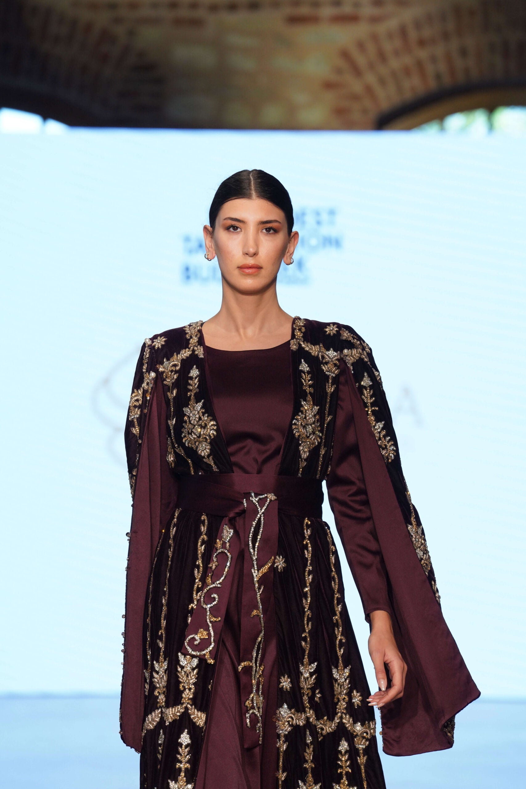 A commanding statement of heritage and power, this kaftan is conceived as a modern heirloom. Designed to evoke imperial grandeur, it is meticulously hand-embroidered from collar to hem, transforming rich velvet into a canvas of historical artistry. Each ornate motif echoes the legacy of palace ateliers, while the elongated silhouette and structured drape create an unmistakable presence—regal, confident, and unapologetically bold.