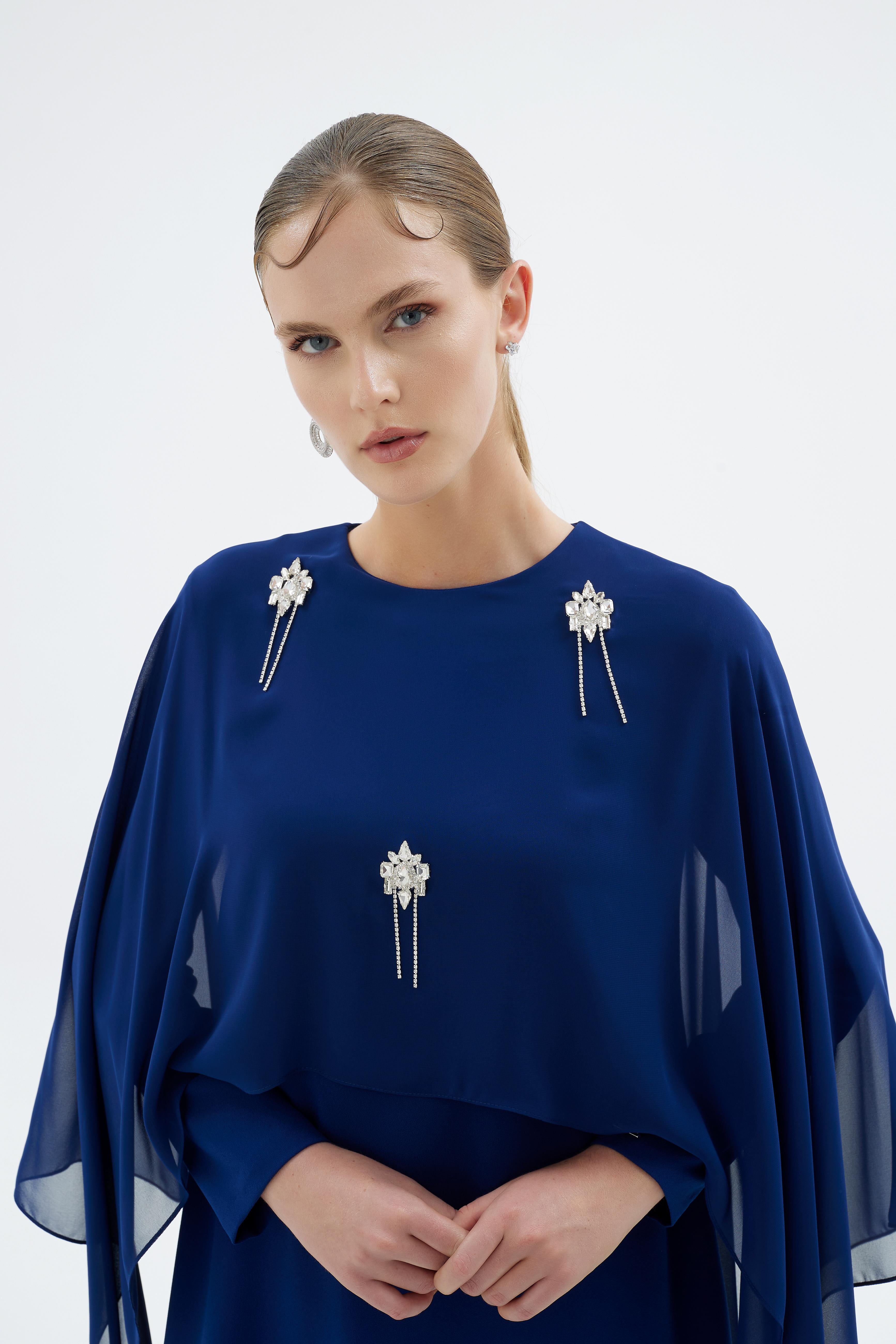 An elegant evening silhouette defined by fluid layering and refined detailing, this dress is complemented by a separate cape overlay that moves with effortless grace. Delicate embellishments at the edges of the cape add a subtle luminosity, enhancing its soft, airy drape.