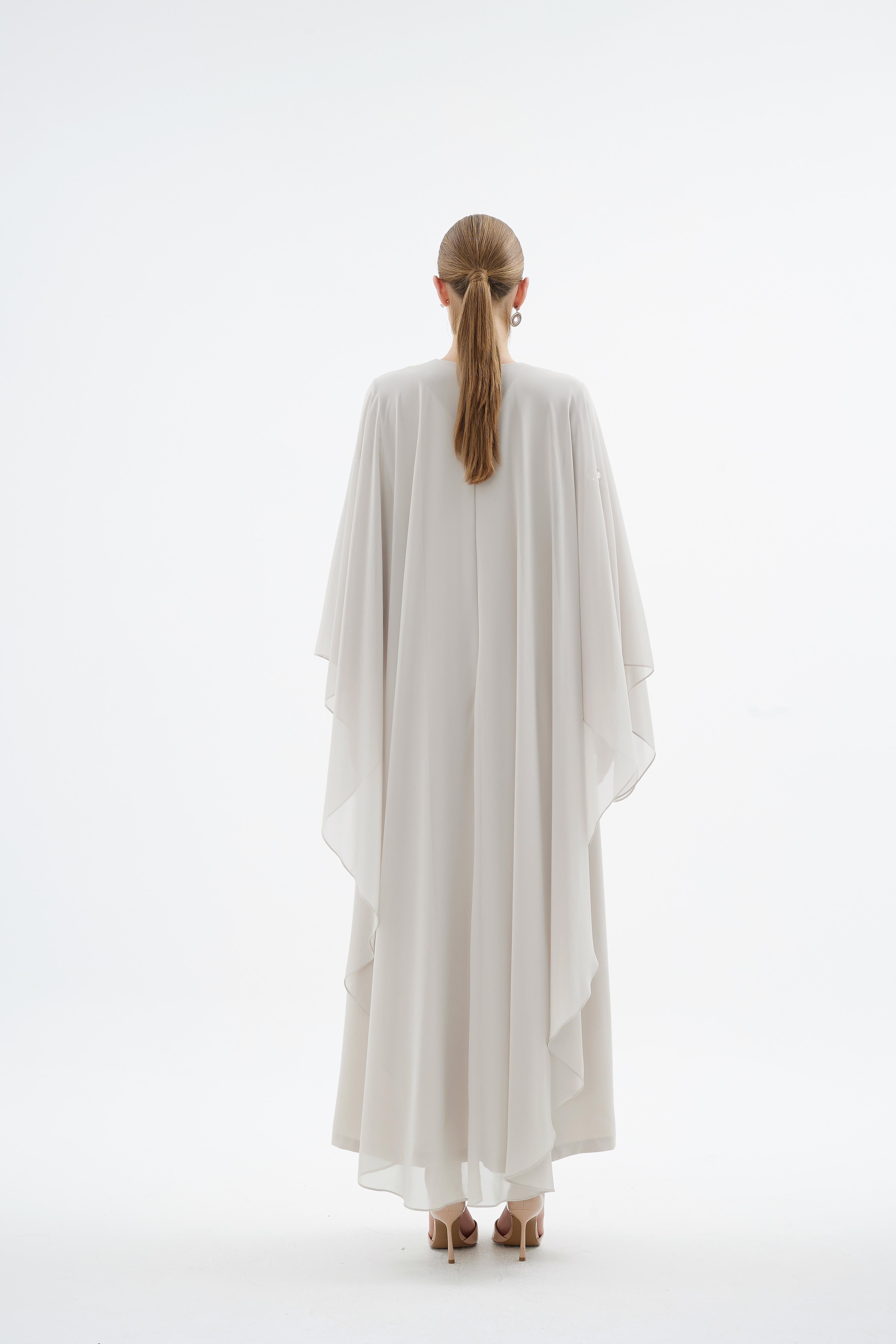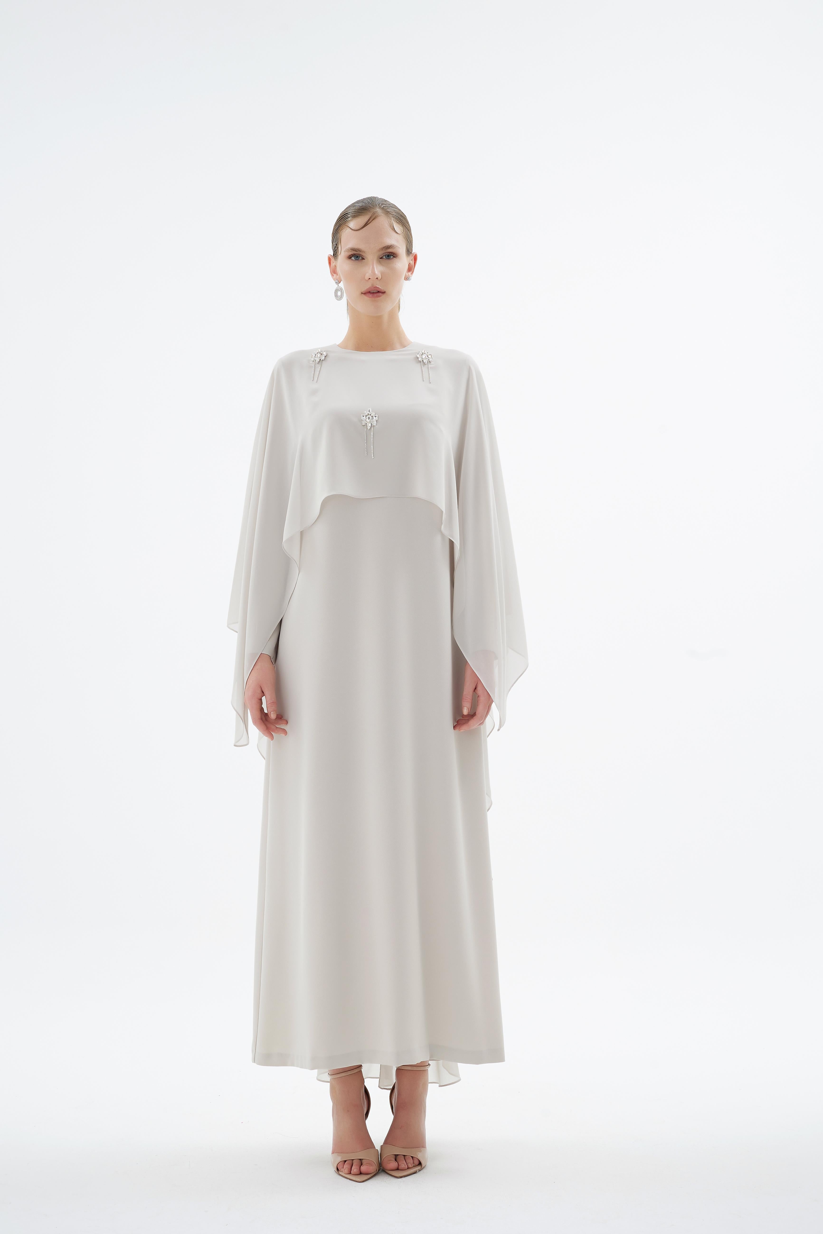 An elegant evening silhouette defined by fluid layering and refined detailing, this dress is complemented by a separate cape overlay that moves with effortless grace. Delicate embellishments at the edges of the cape add a subtle luminosity, enhancing its soft, airy drape.