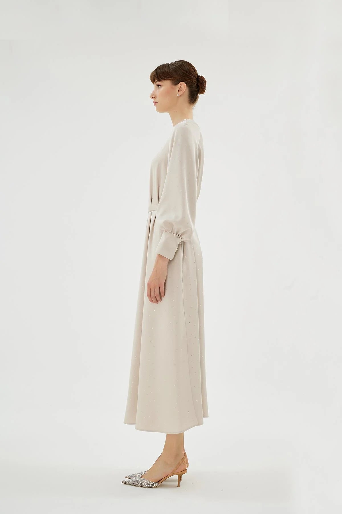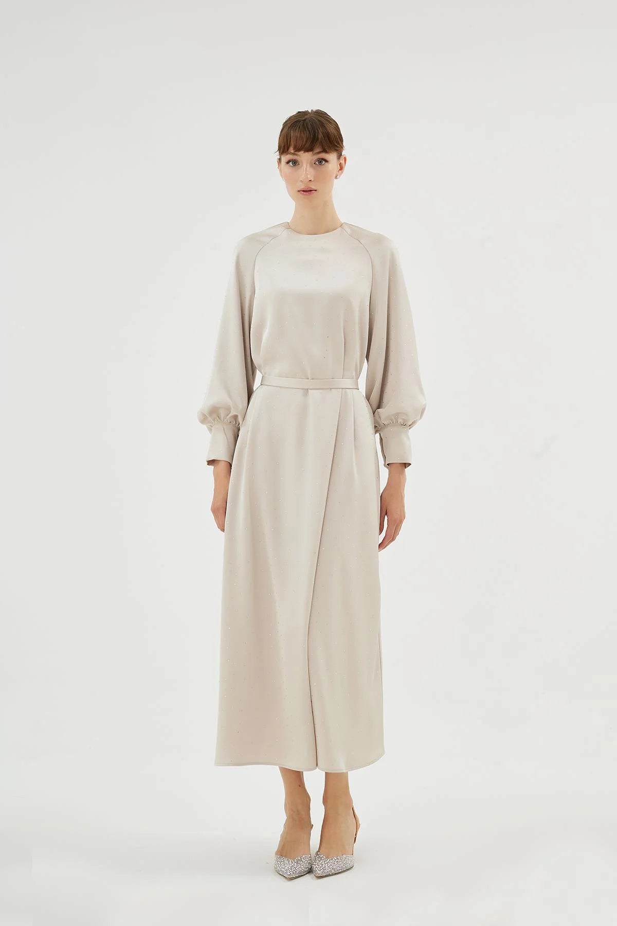 The Eliza Dress combines modern elegance with subtle detailing, featuring a refined raglan sleeve construction that softly defines the shoulder line while ensuring ease of movement. Delicate crystal embellishments are scattered across the fabric, catching light from every angle and adding a soft, understated shimmer.