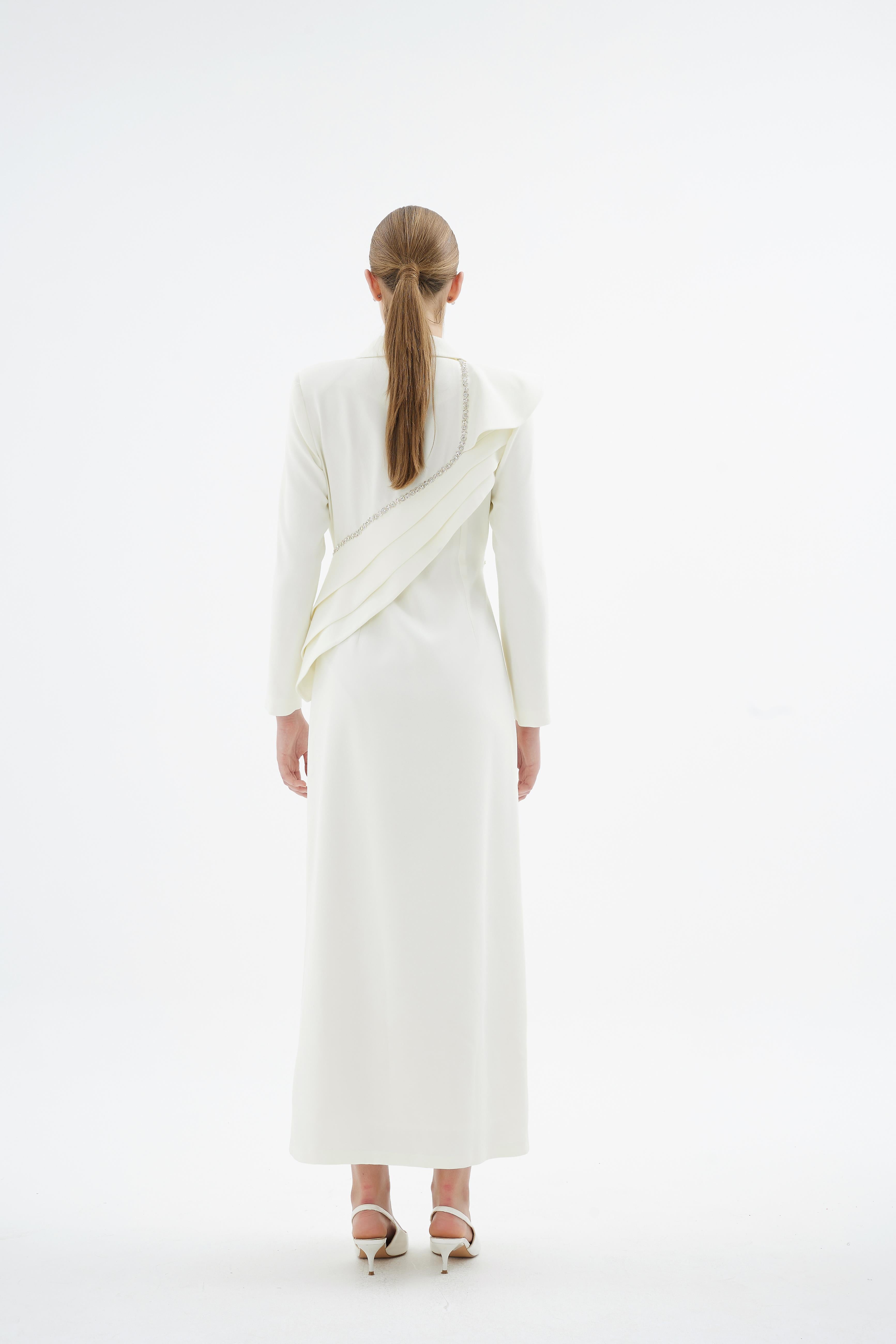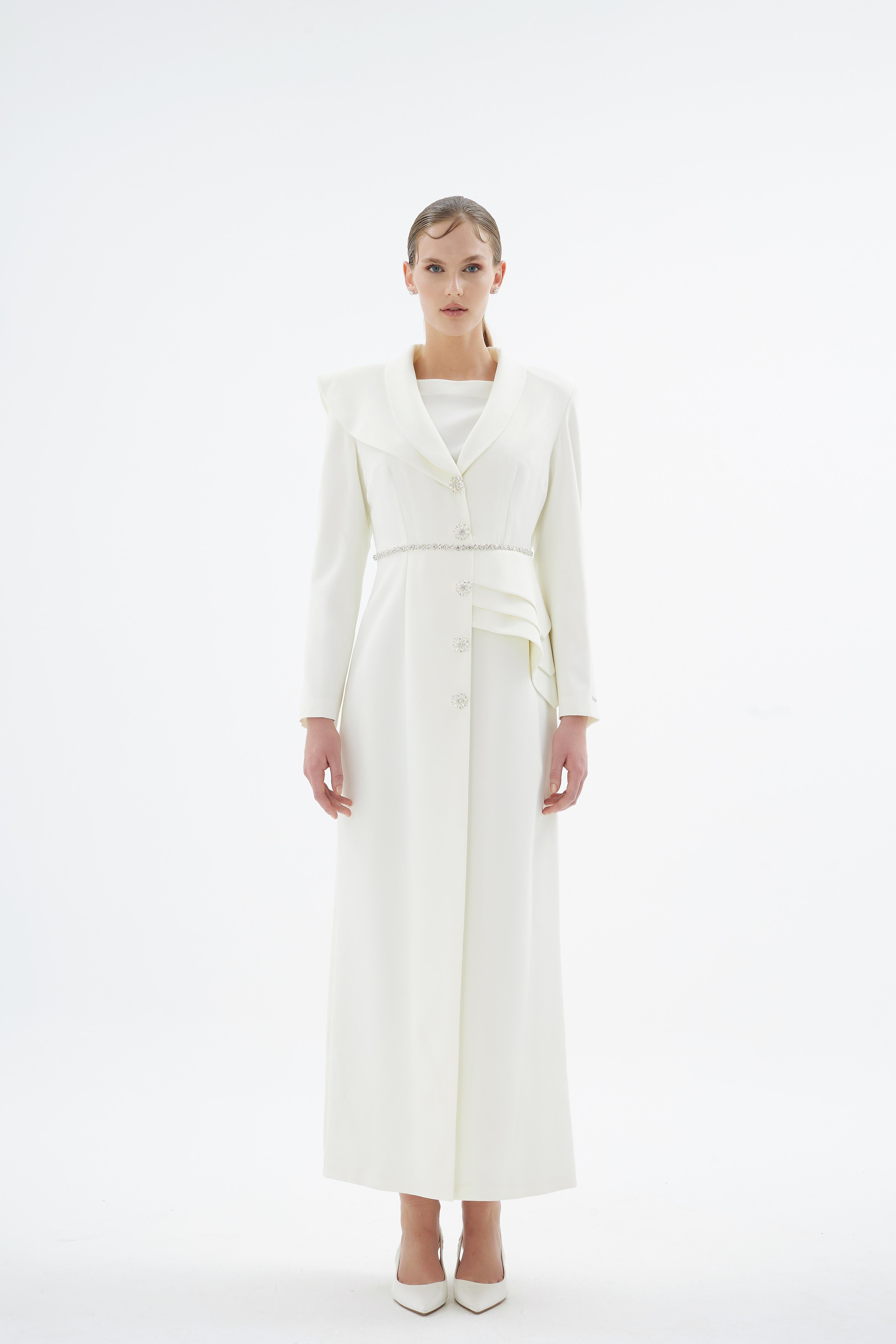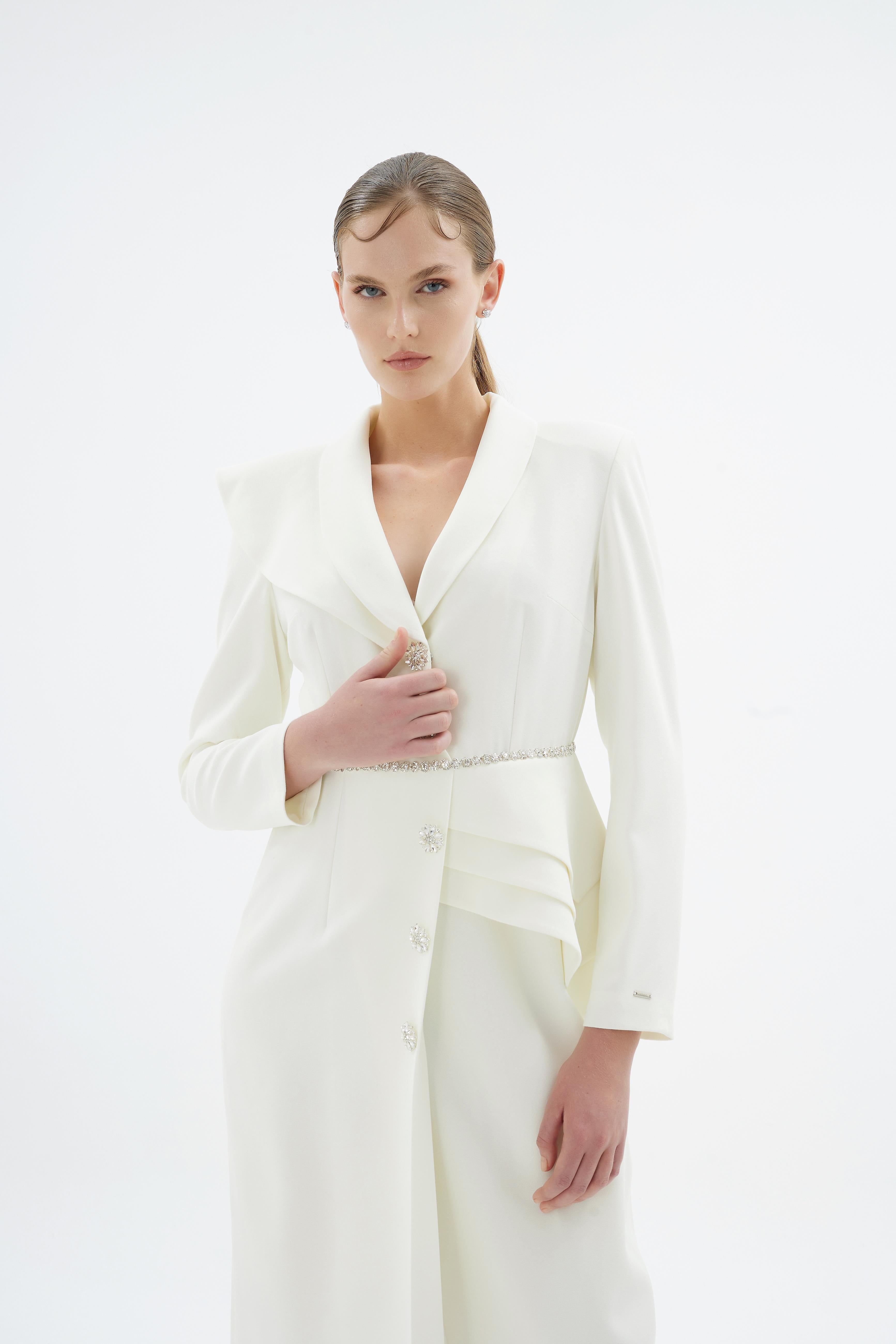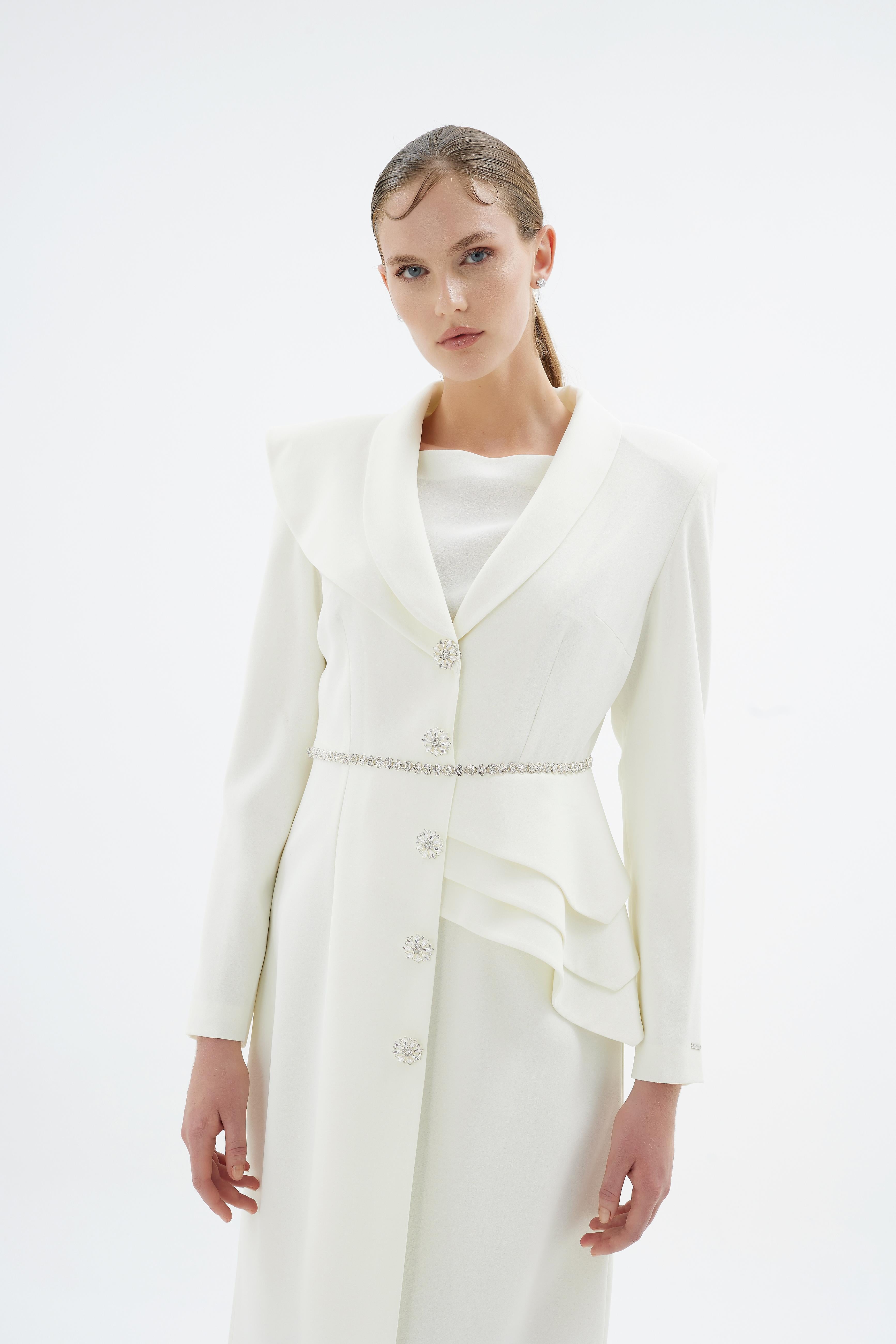 A statement in structured elegance, this jacket-style dress is designed with a sculpted silhouette that enhances presence and poise. The refined crossover-inspired cut is elevated by soft draped detailing at the waist and delicate embellished accents, creating a balanced composition of strength and femininity. Finished with decorative buttons and a defined shoulder line, it offers a polished look suited for formal occasions and special events.