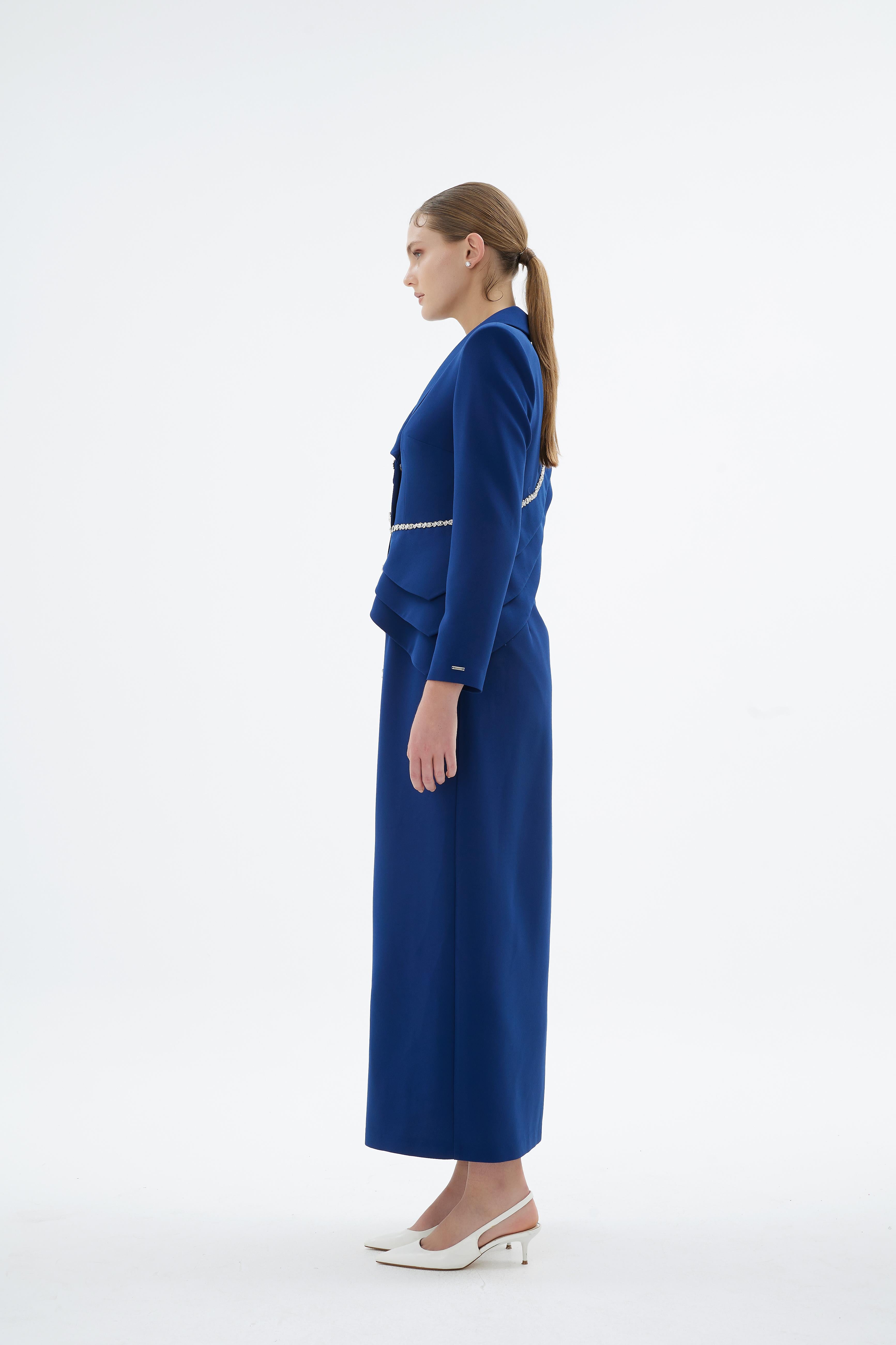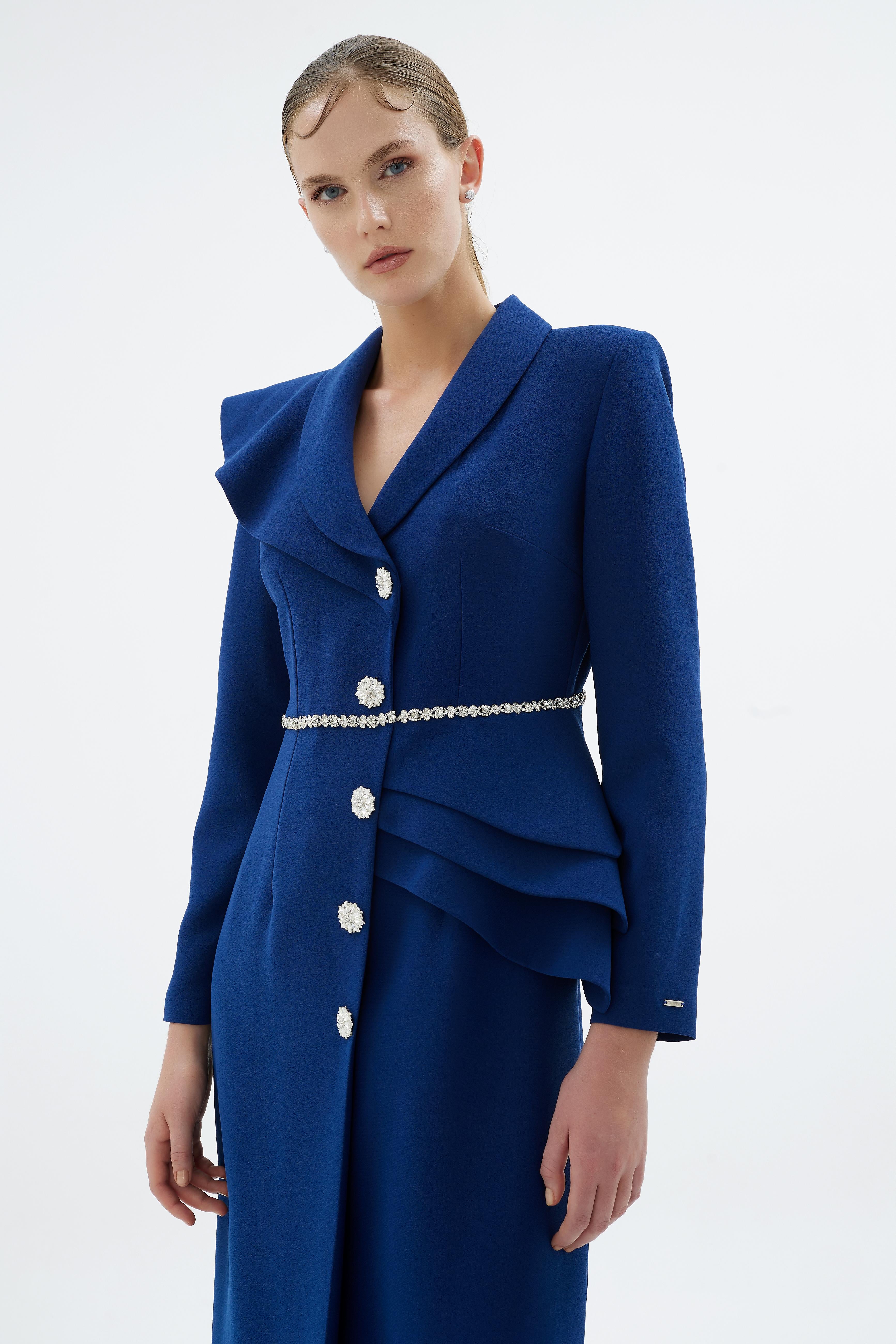 A statement in structured elegance, this jacket-style dress is designed with a sculpted silhouette that enhances presence and poise. The refined crossover-inspired cut is elevated by soft draped detailing at the waist and delicate embellished accents, creating a balanced composition of strength and femininity. Finished with decorative buttons and a defined shoulder line, it offers a polished look suited for formal occasions and special events.