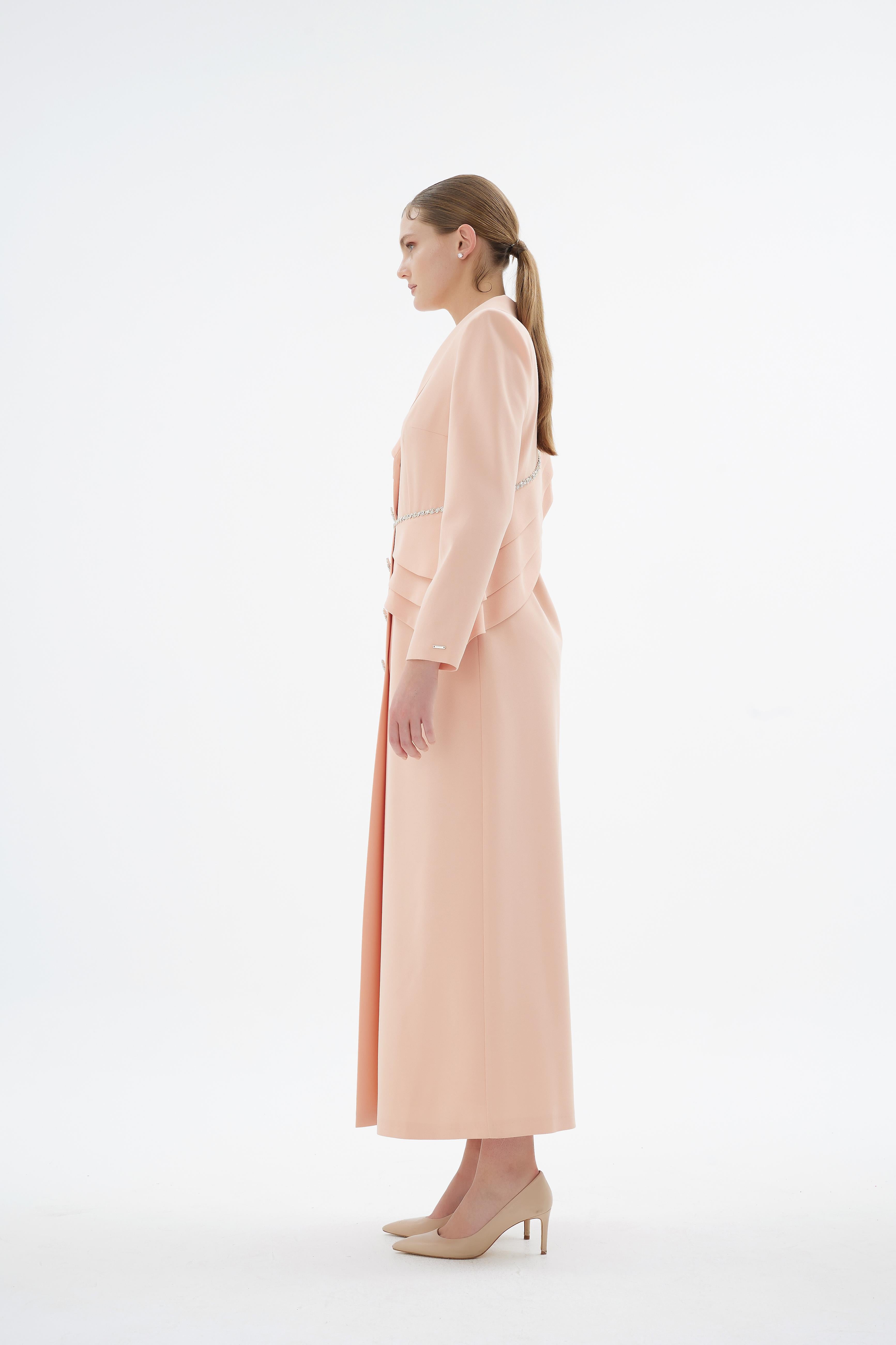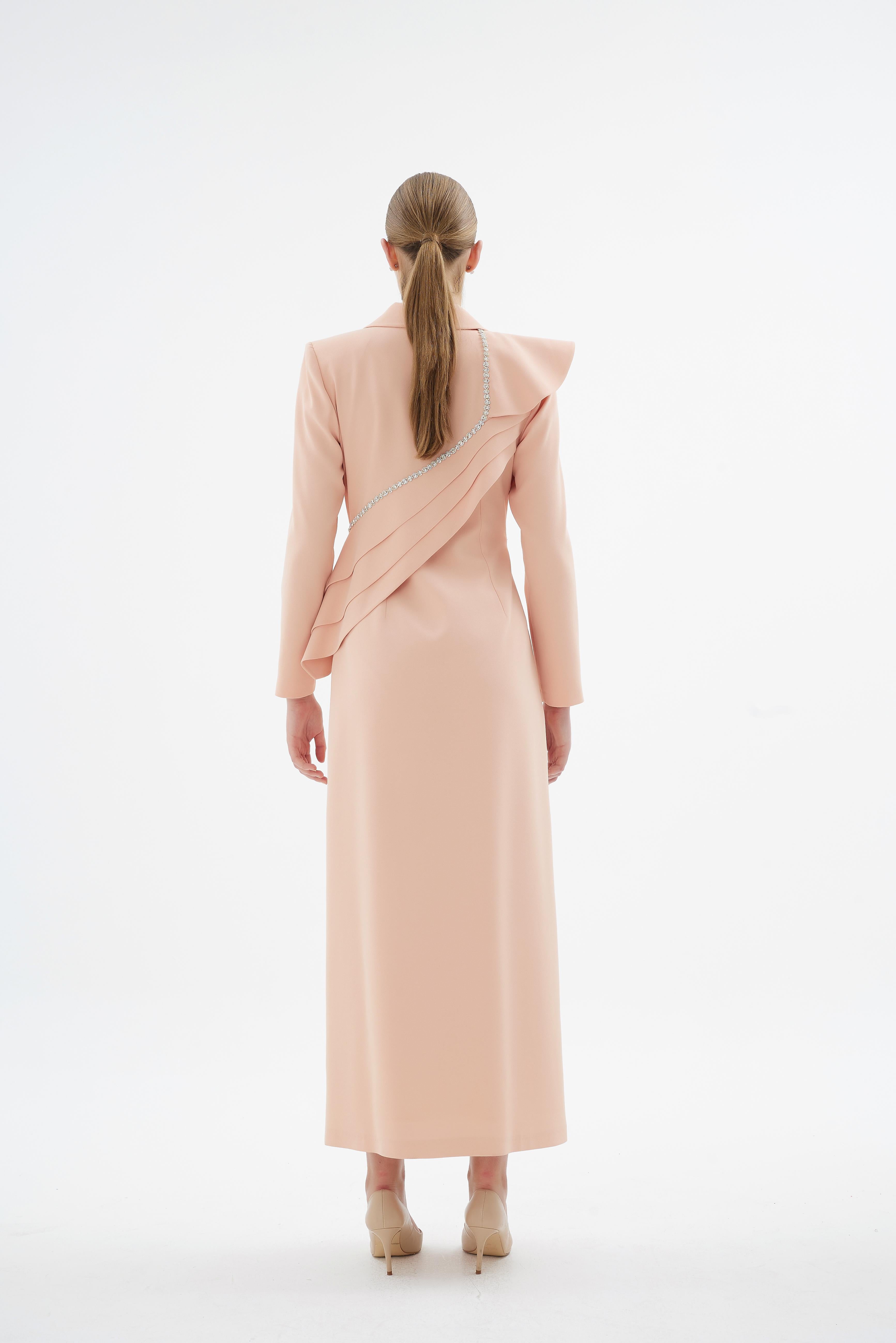 A statement in structured elegance, this jacket-style dress is designed with a sculpted silhouette that enhances presence and poise. The refined crossover-inspired cut is elevated by soft draped detailing at the waist and delicate embellished accents, creating a balanced composition of strength and femininity. Finished with decorative buttons and a defined shoulder line, it offers a polished look suited for formal occasions and special events.