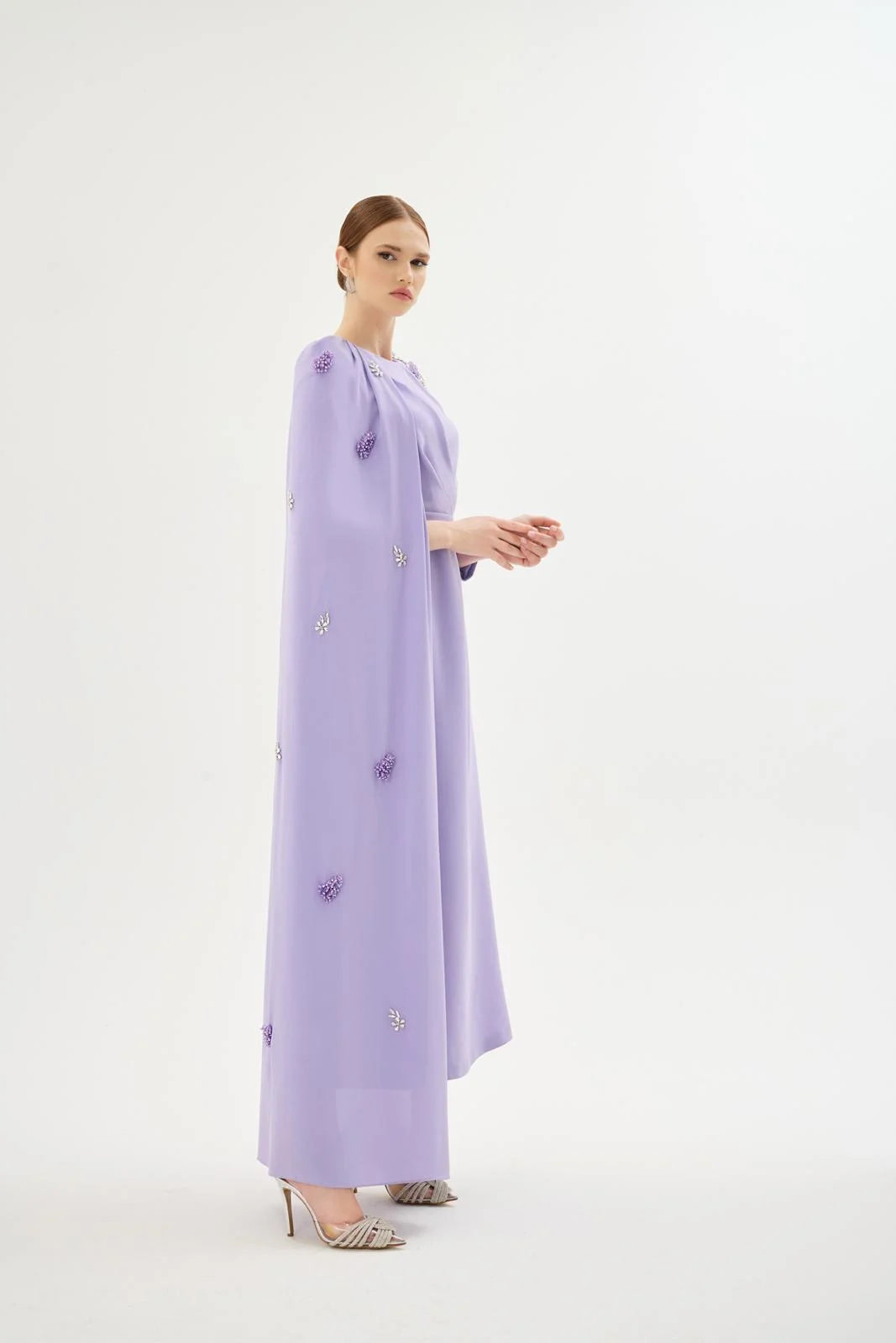 A striking balance of structure and fluidity, this dress is defined by its asymmetric cape overlay and refined tailoring. Intricate embellishments accent the draped layer, creating depth and movement while maintaining a clean, elegant silhouette.