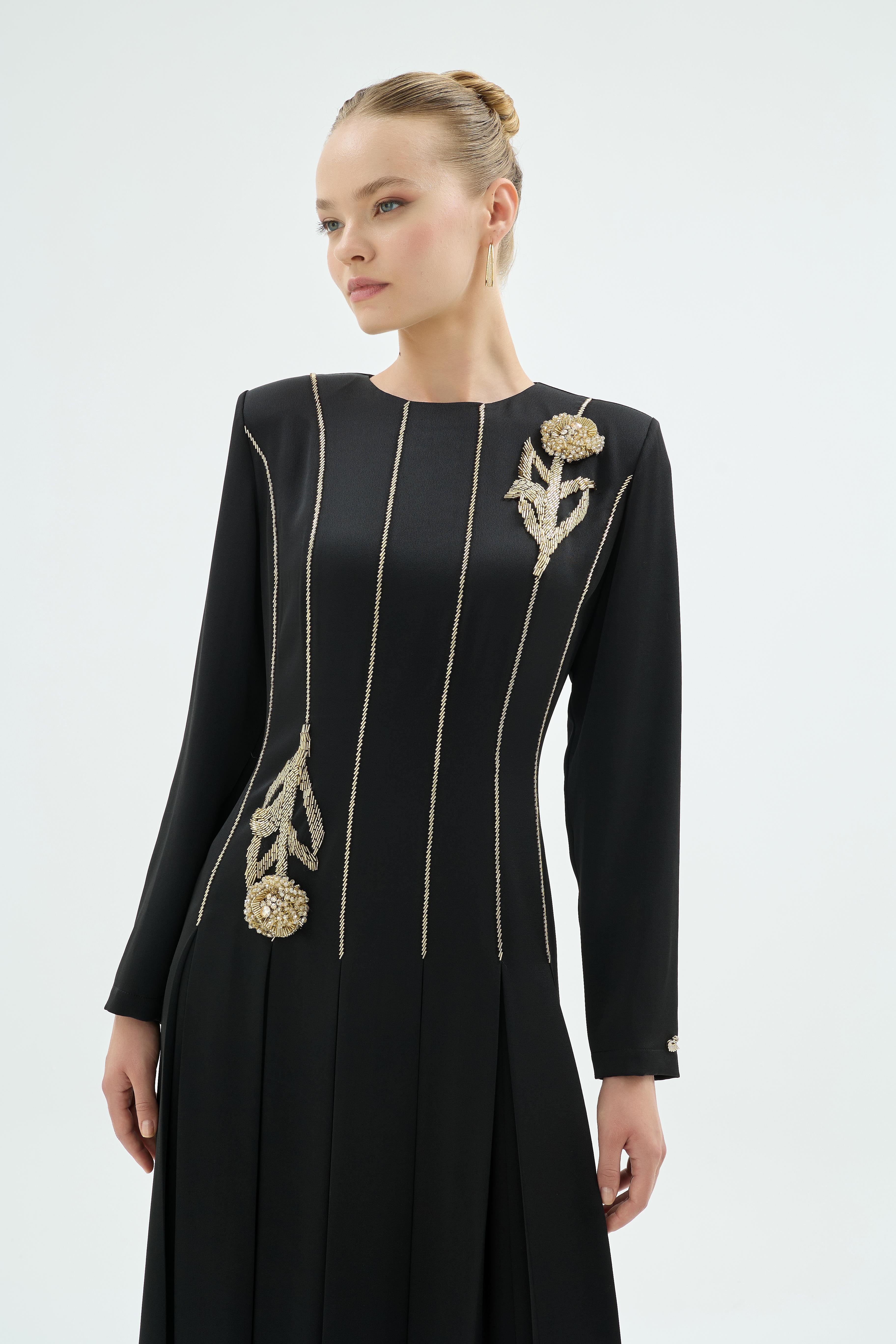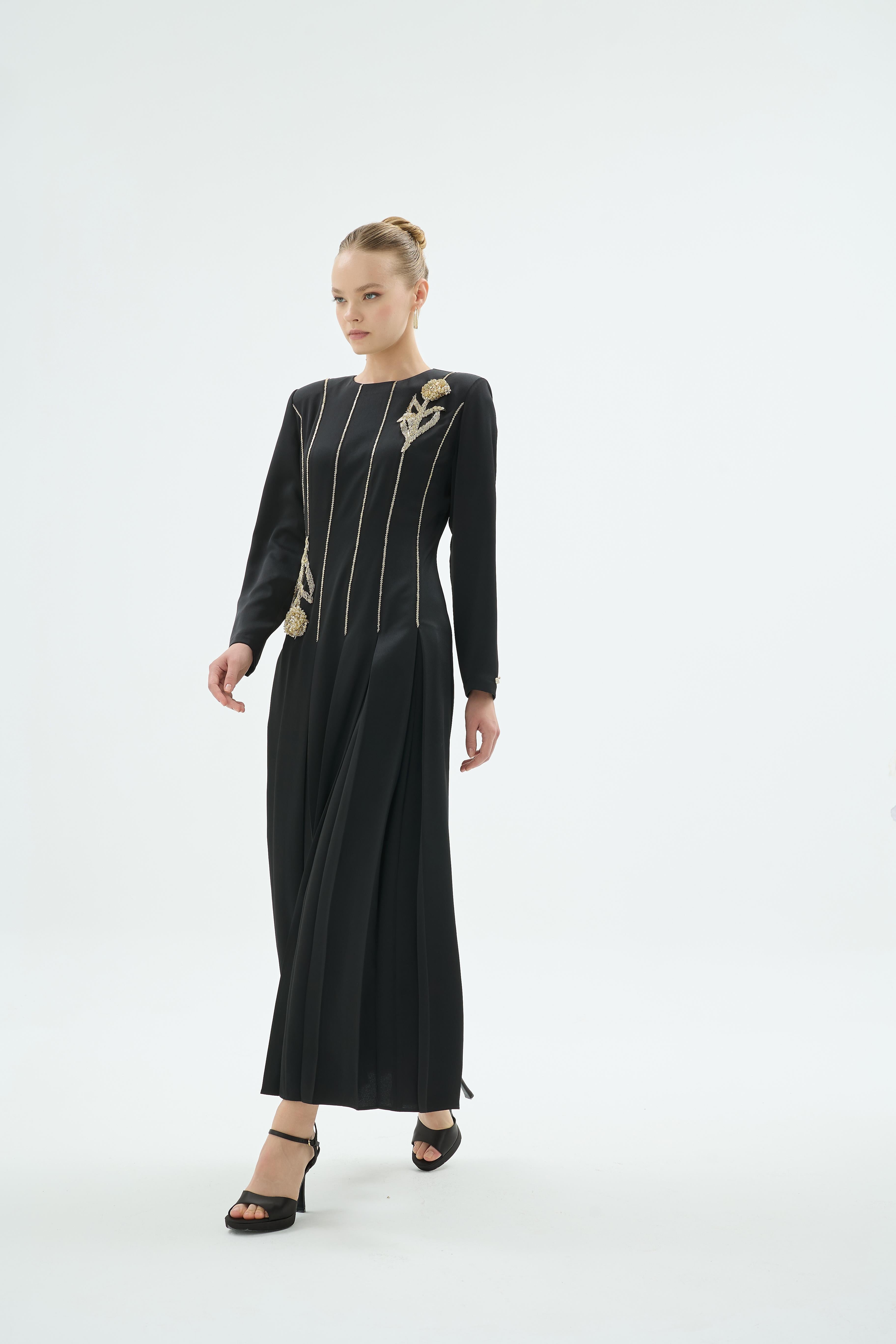 A refined expression of feminine elegance, this evening dress is distinguished by its intricate floral embellishments and elongated silhouette. The structured bodice is enhanced with delicate vertical detailing, while the softly pleated skirt introduces fluid movement and grace. Designed to balance sophistication with comfort, it offers a poised presence for formal occasions and special evenings.