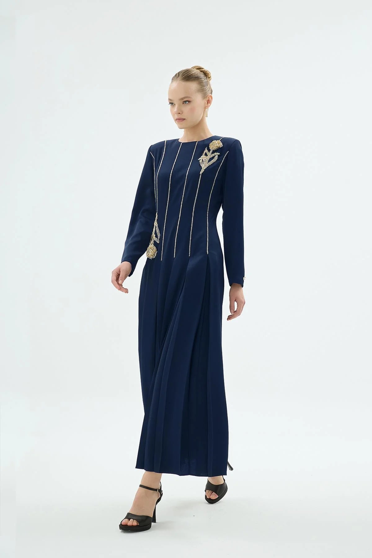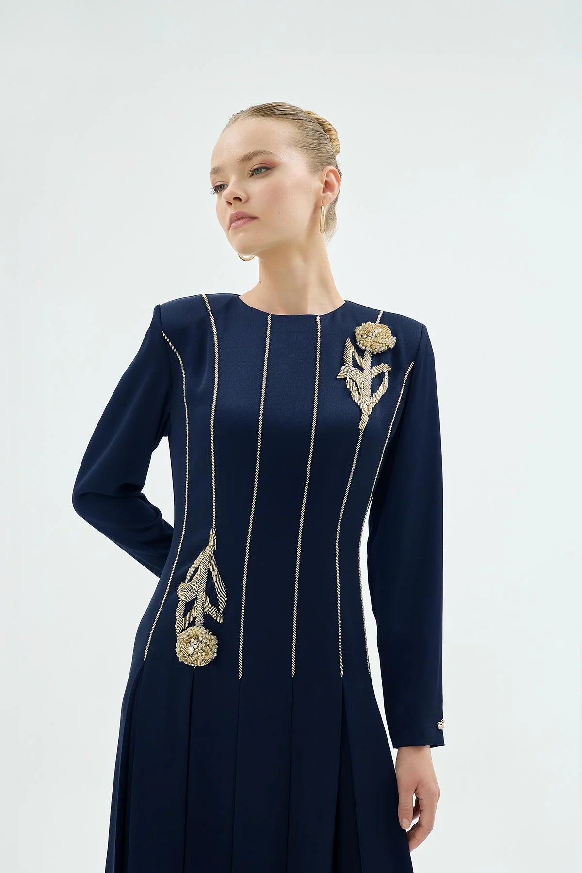 A refined expression of feminine elegance, this evening dress is distinguished by its intricate floral embellishments and elongated silhouette. The structured bodice is enhanced with delicate vertical detailing, while the softly pleated skirt introduces fluid movement and grace. Designed to balance sophistication with comfort, it offers a poised presence for formal occasions and special evenings.
