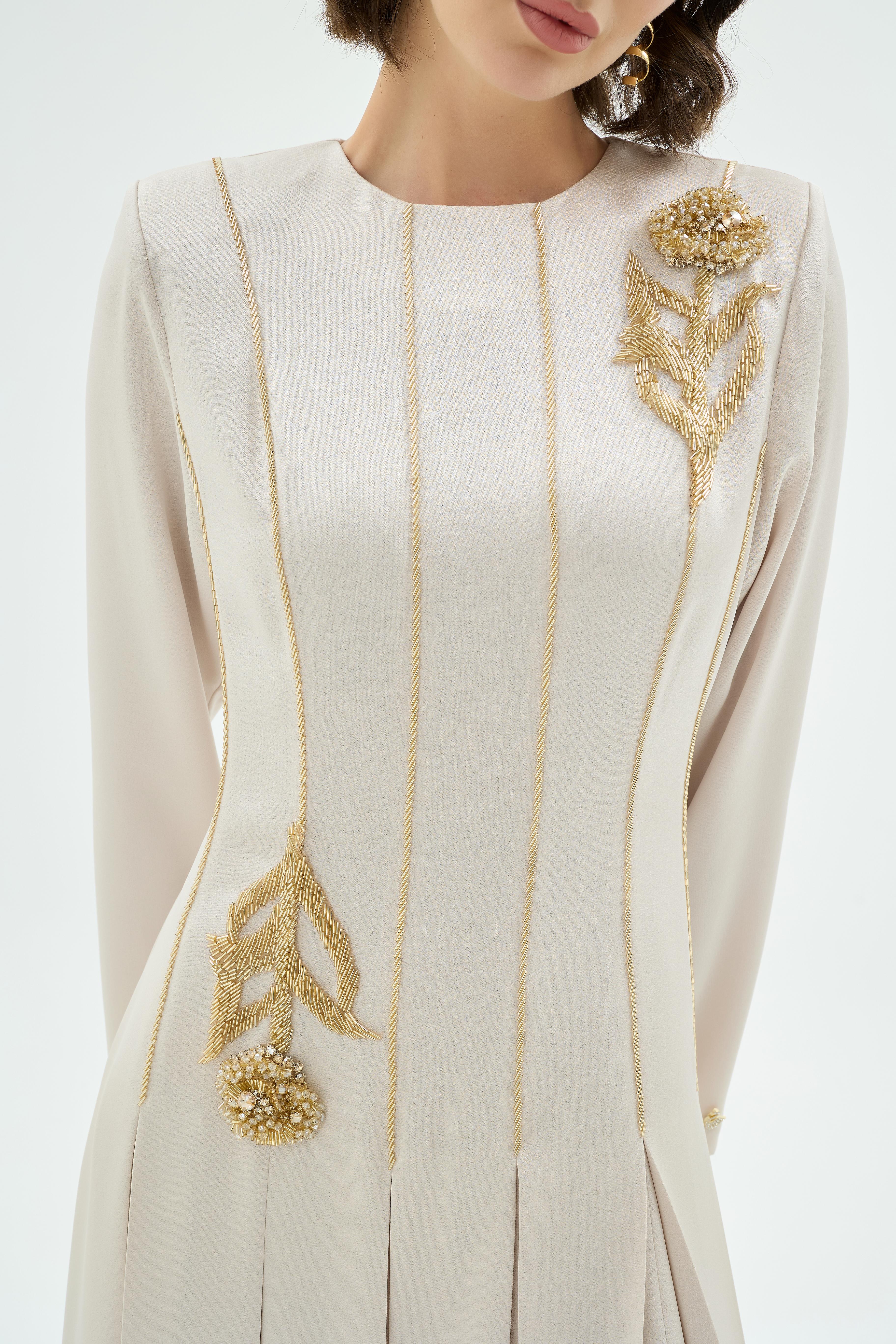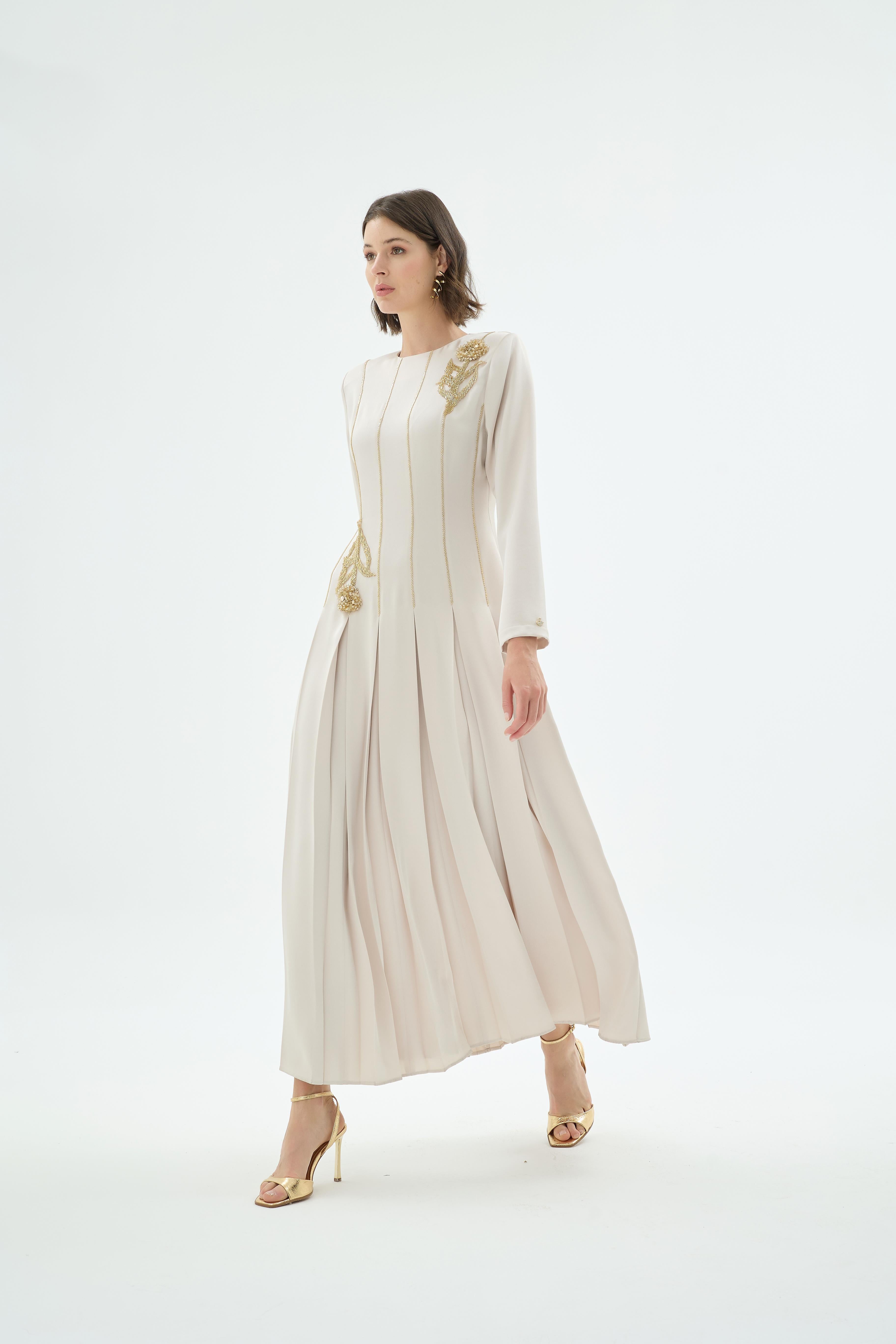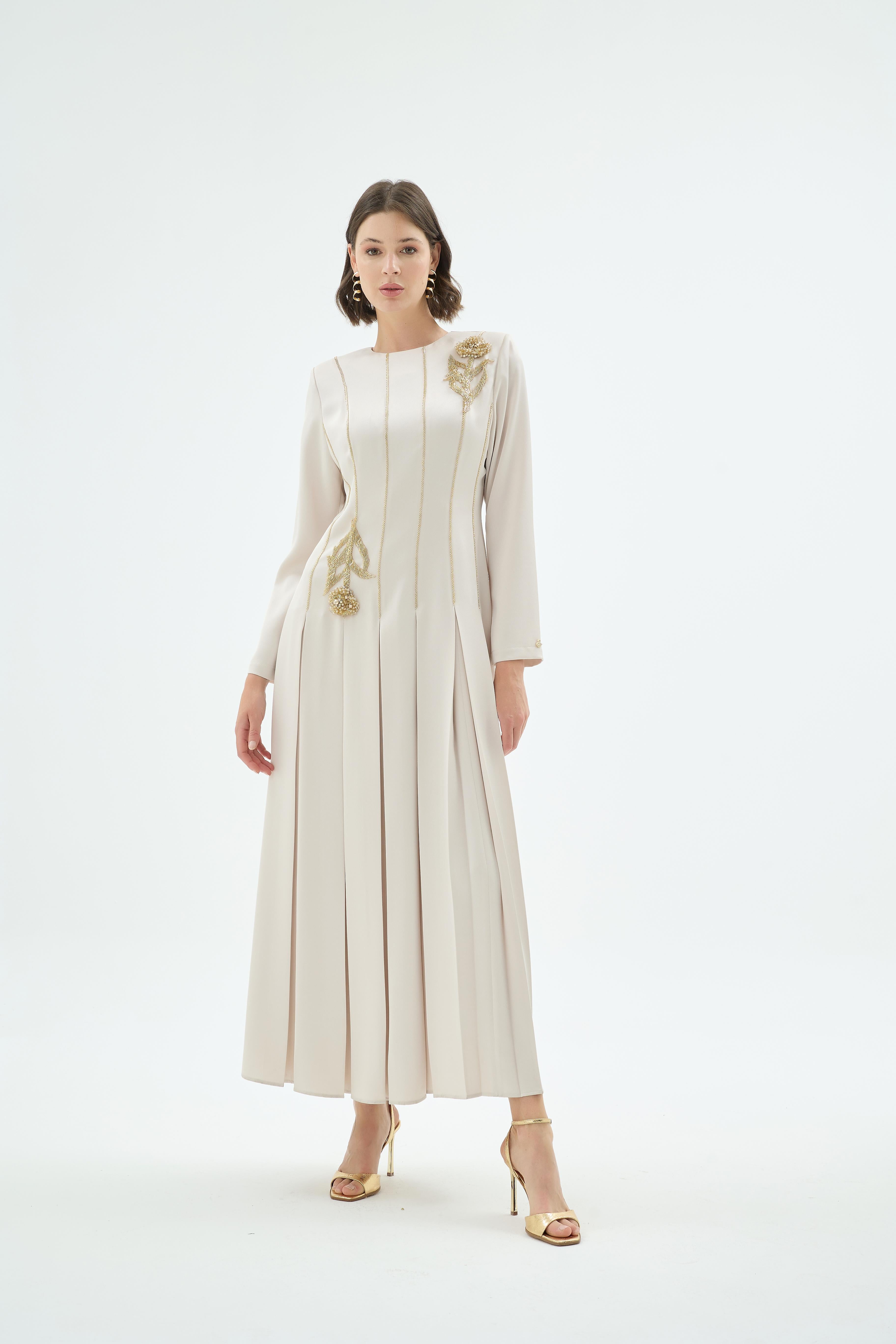 Mia Embroidered Pleated Evening Dress – Stone