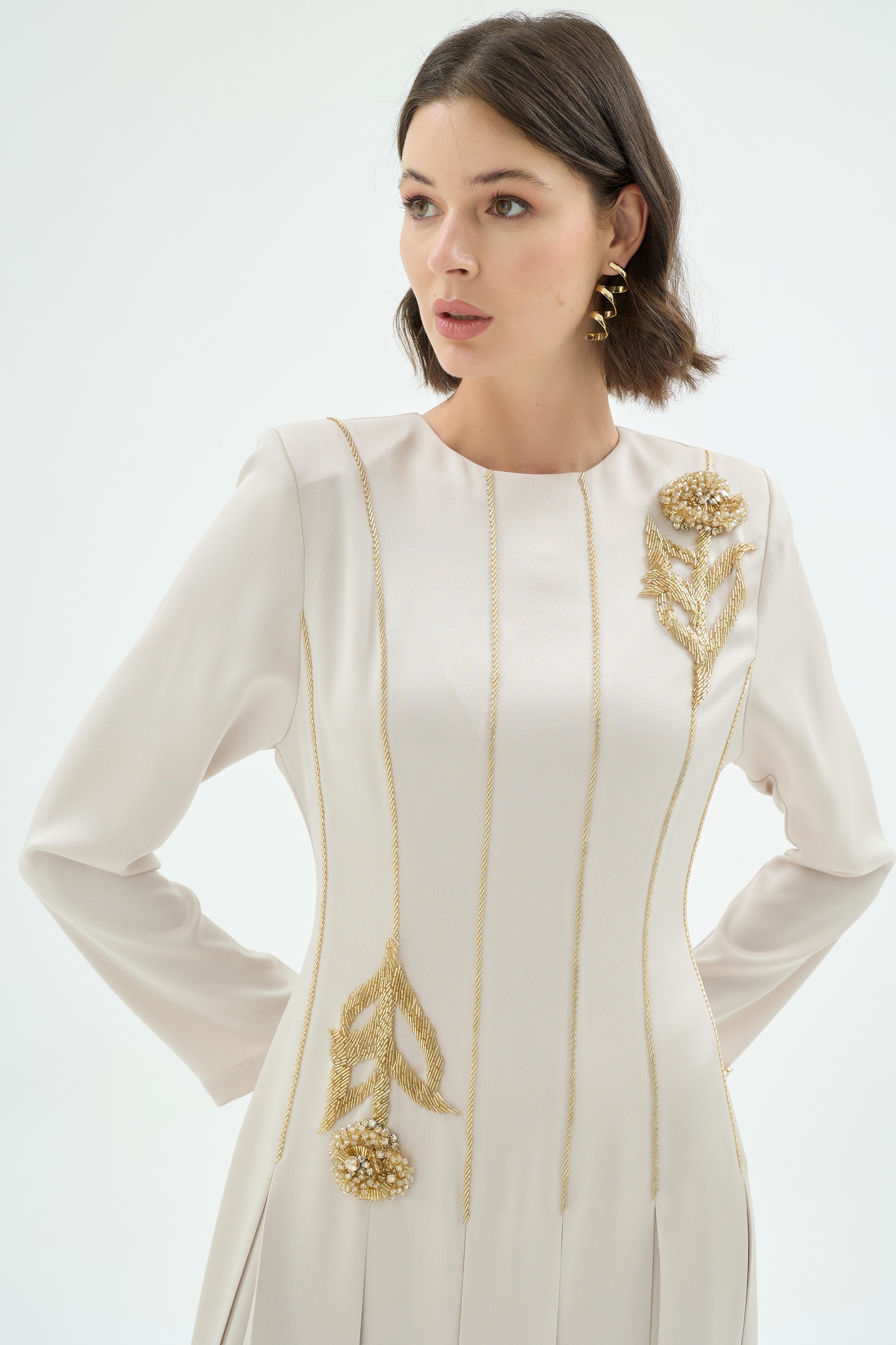 A refined expression of feminine elegance, this evening dress is distinguished by its intricate floral embellishments and elongated silhouette. The structured bodice is enhanced with delicate vertical detailing, while the softly pleated skirt introduces fluid movement and grace. Designed to balance sophistication with comfort, it offers a poised presence for formal occasions and special evenings.