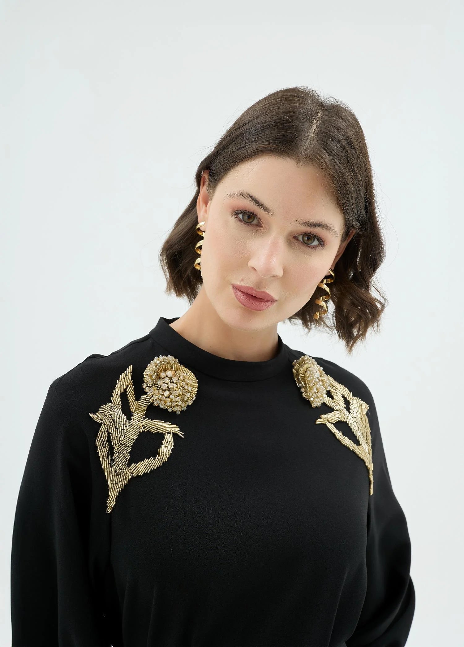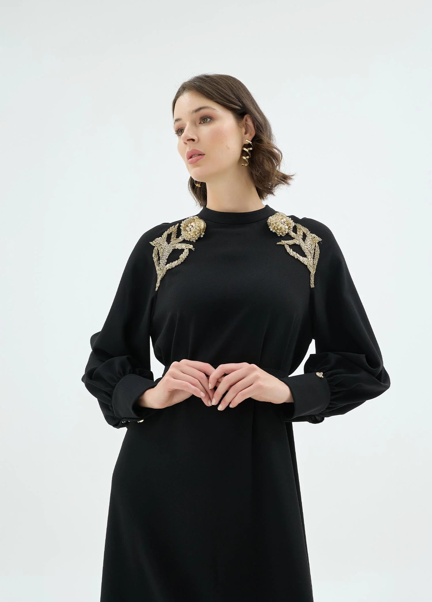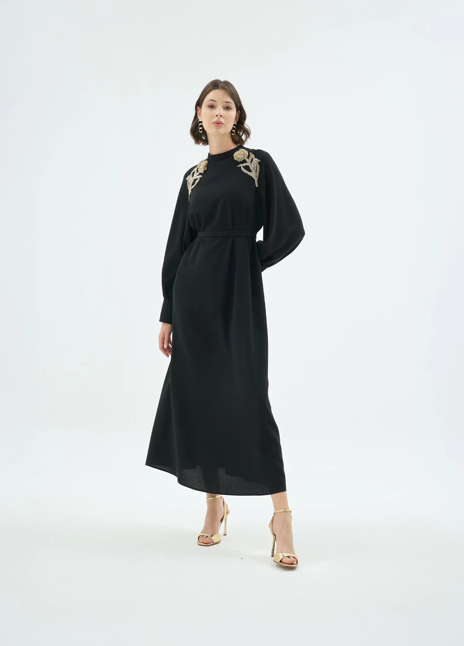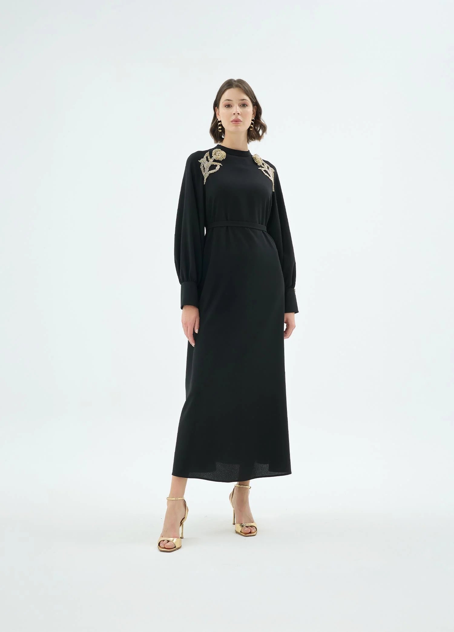 A refined interpretation of modern elegance, this dress is defined by its clean silhouette and statement shoulder detailing. Intricate floral embellishments introduce a sculptural accent, while the fluid structure ensures effortless movement and comfort. Designed for versatility, it transitions seamlessly from day to evening with a composed, sophisticated presence.
