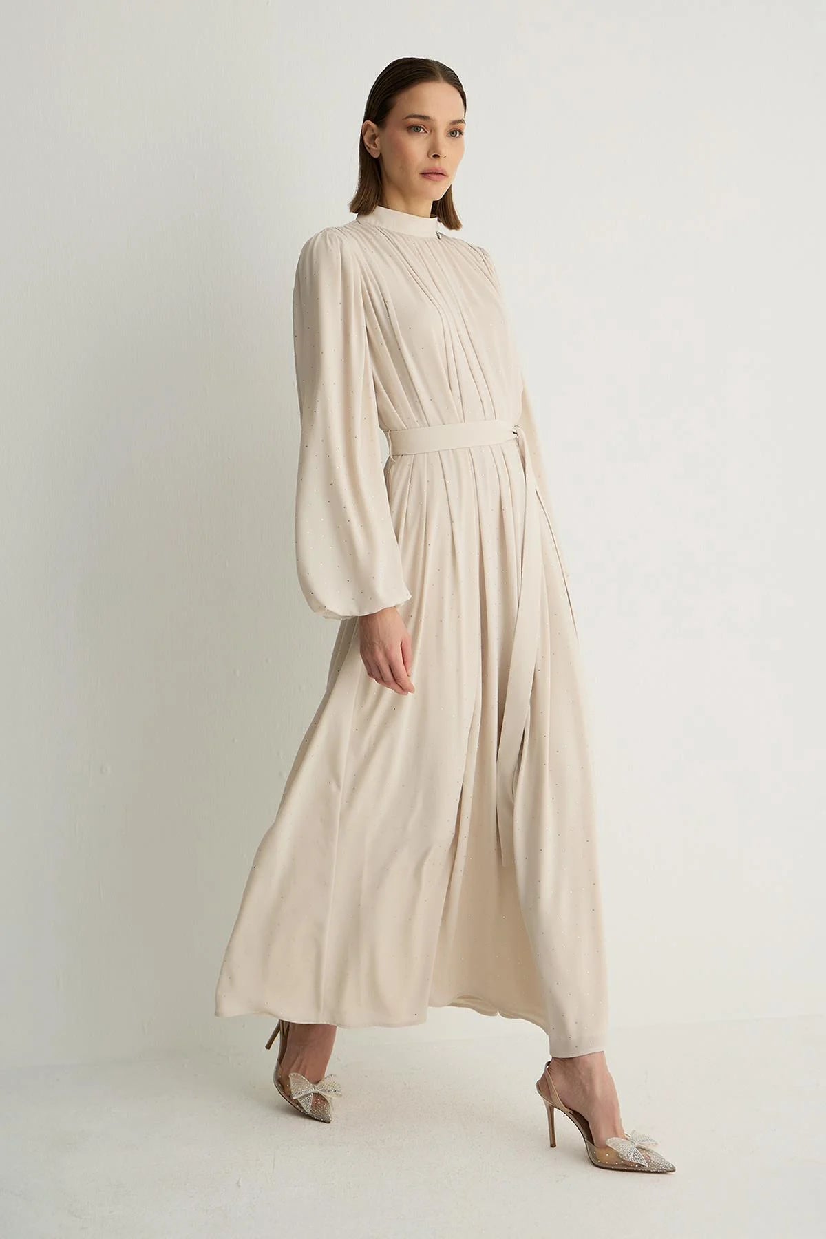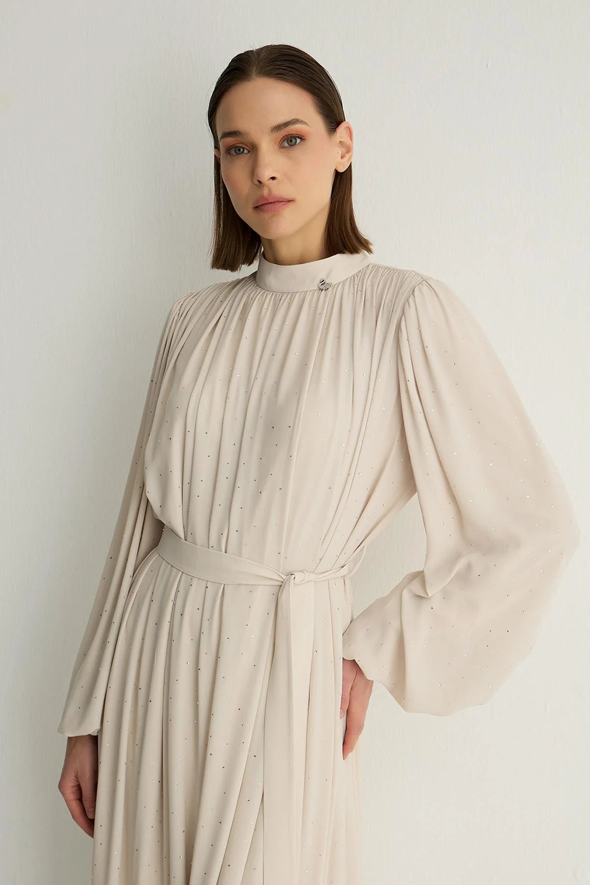 An elegant composition of fluid movement and delicate texture, this dress features soft pleating that flows naturally from the neckline. Subtle embellishments are scattered across the surface, while the тонкий self-tie belt defines the waist with effortless grace.