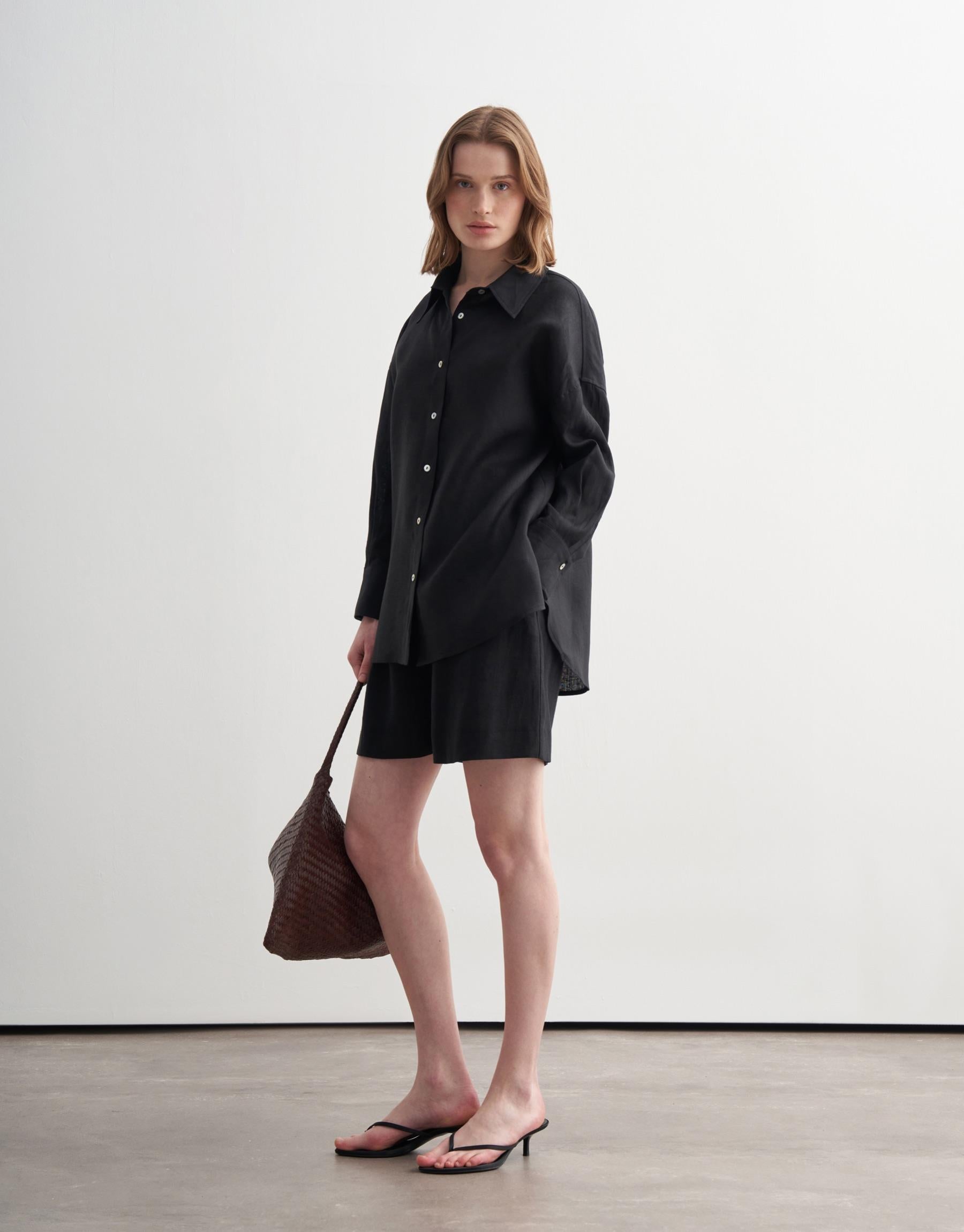 This oversized shirt is crafted from premium European linen, offering a breathable and naturally textured feel. Designed with a relaxed silhouette and dropped shoulders, it features a clean front button closure that enhances its understated, versatile appeal. The fluid drape and elongated back create a refined balance between structure and ease.
