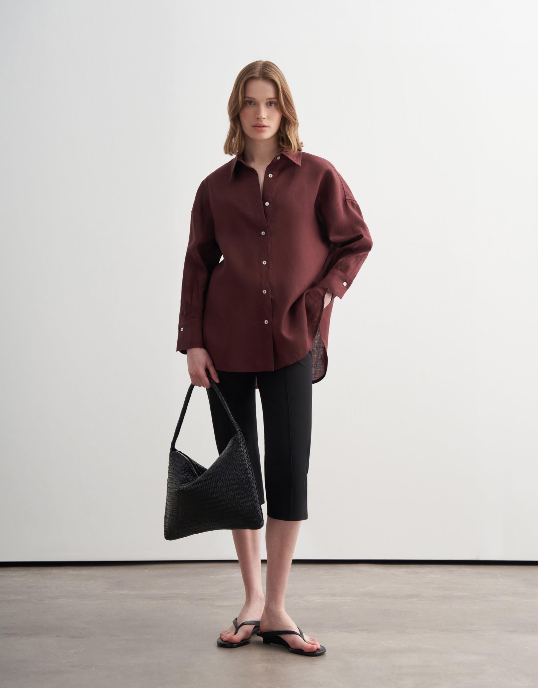 This oversized shirt is crafted from premium European linen, offering a breathable and naturally textured feel. Designed with a relaxed silhouette and dropped shoulders, it features a clean front button closure that enhances its understated, versatile appeal. The fluid drape and elongated back create a refined balance between structure and ease.