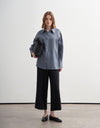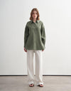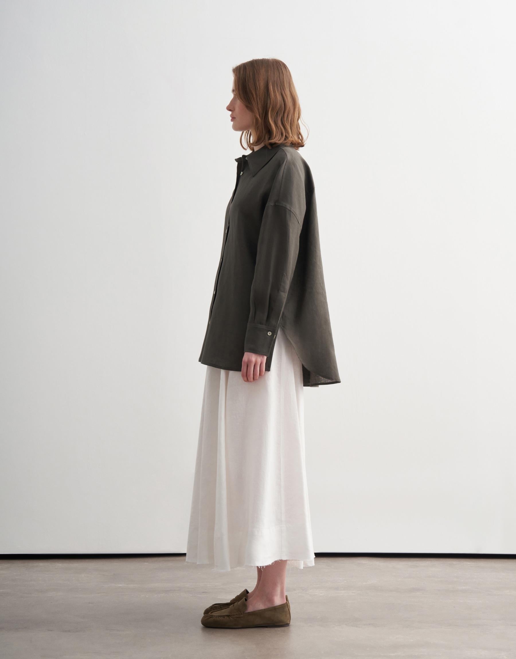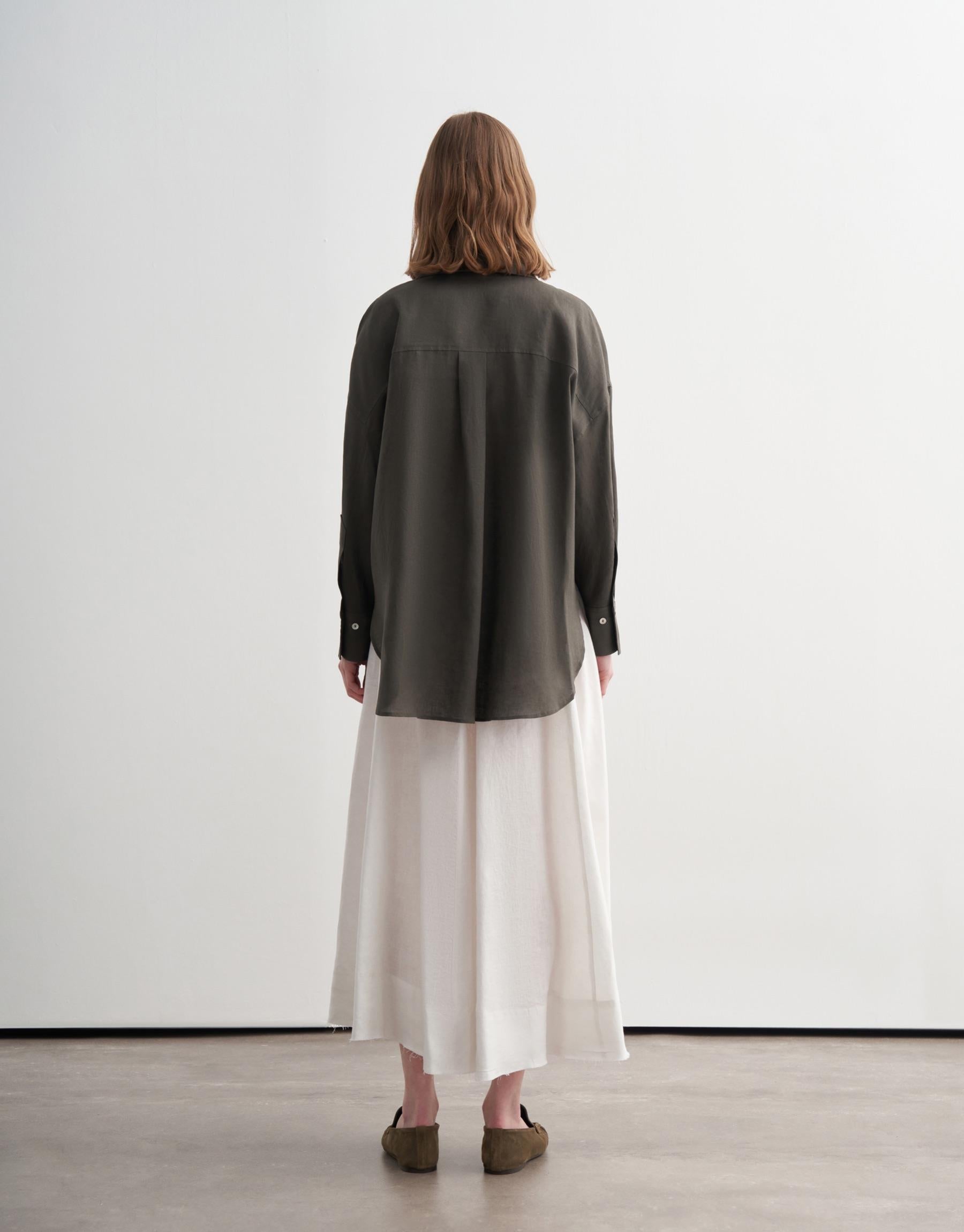 This oversized shirt is crafted from premium European linen, offering a breathable and naturally textured feel. Designed with a relaxed silhouette and dropped shoulders, it features a clean front button closure that enhances its understated, versatile appeal. The fluid drape and elongated back create a refined balance between structure and ease.
