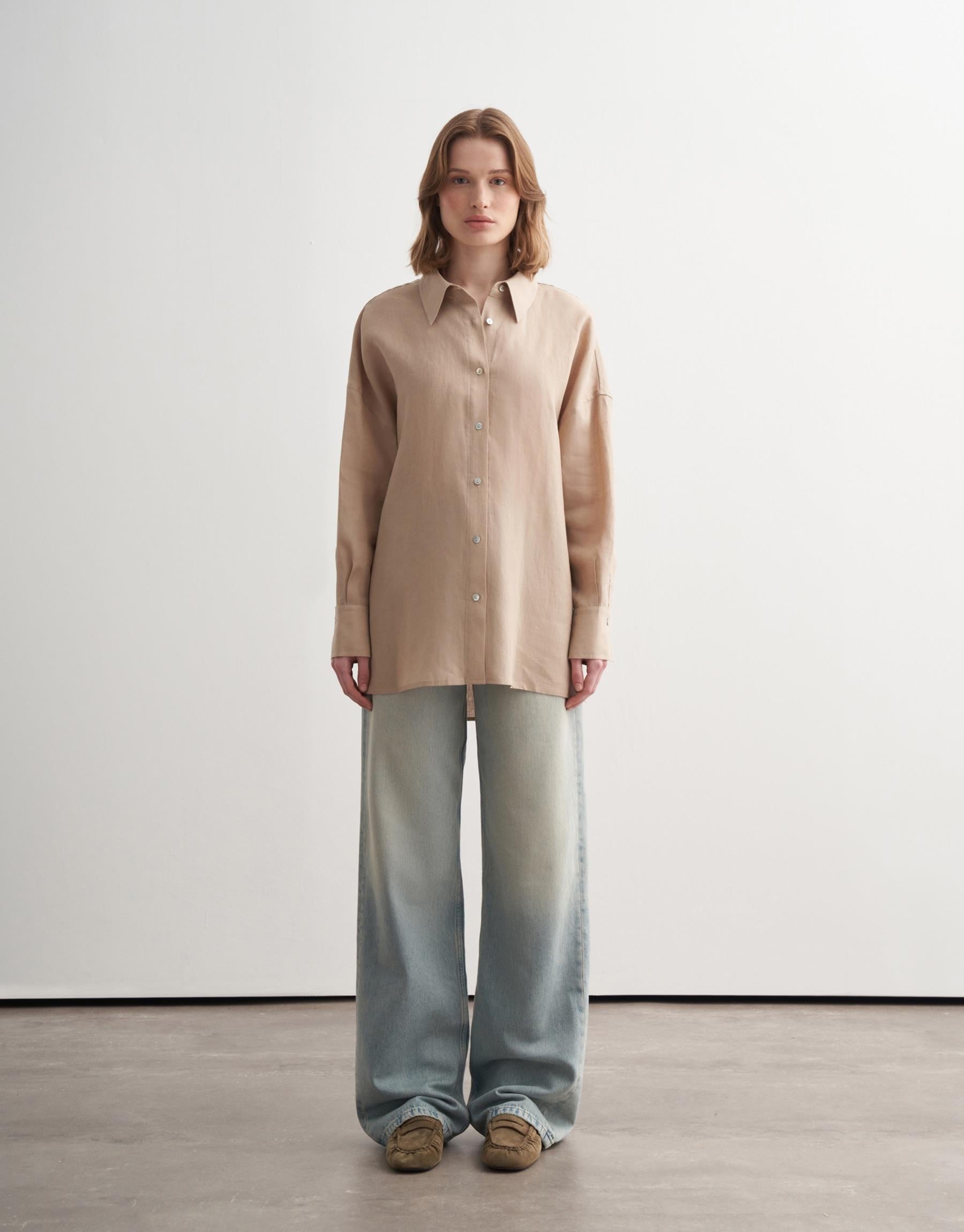 This oversized shirt is crafted from premium European linen, offering a breathable and naturally textured feel. Designed with a relaxed silhouette and dropped shoulders, it features a clean front button closure that enhances its understated, versatile appeal. The fluid drape and elongated back create a refined balance between structure and ease.