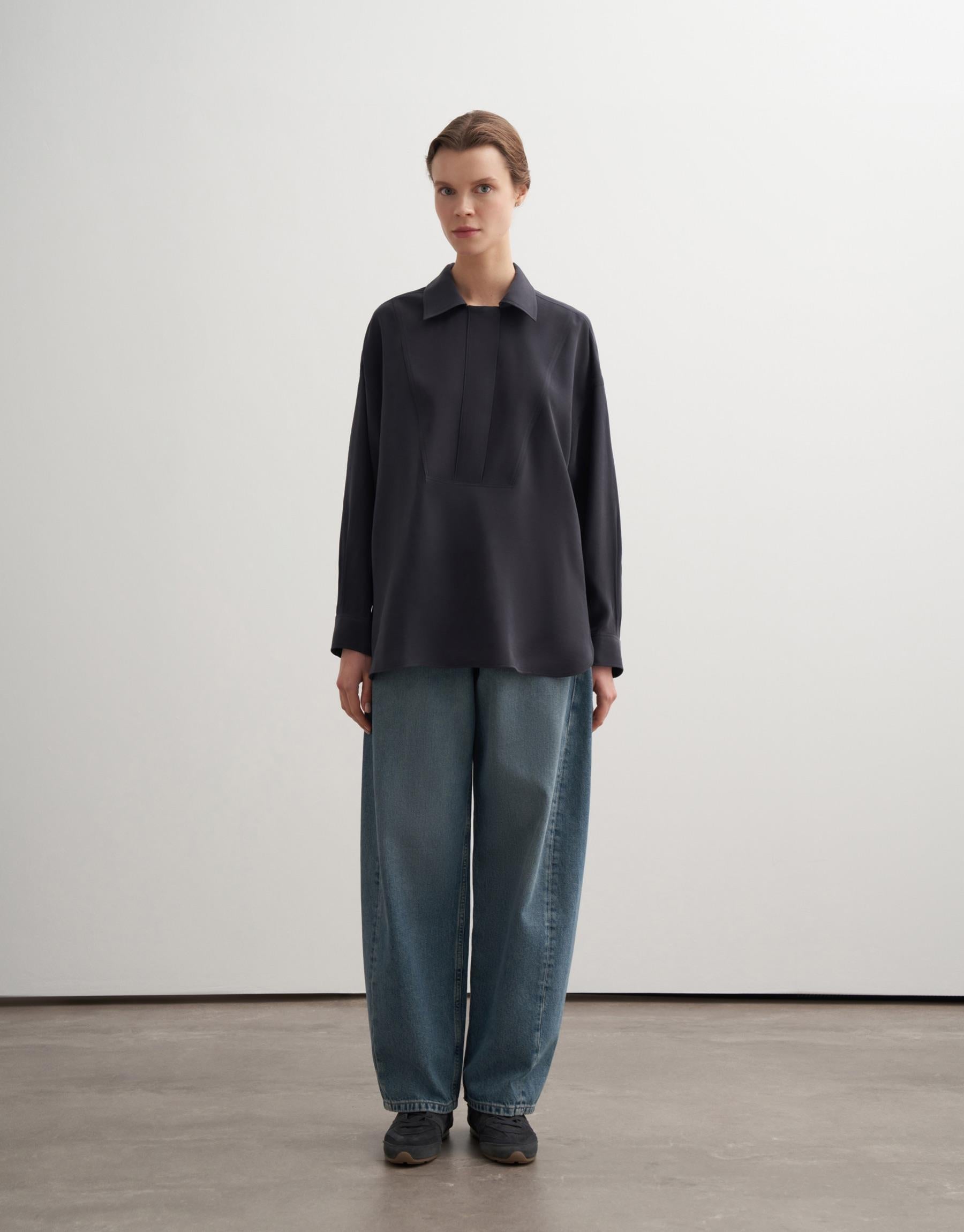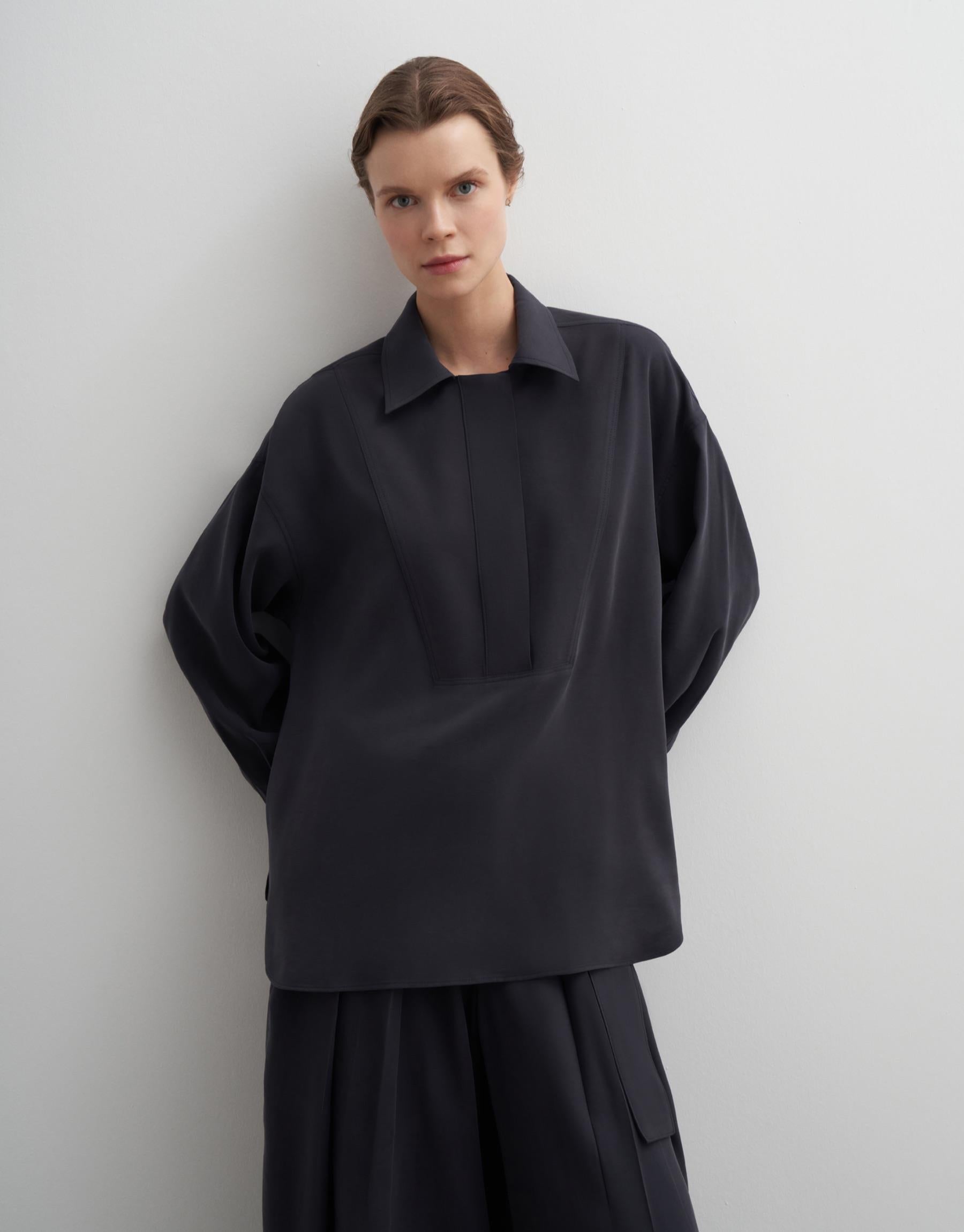 A clean, contemporary silhouette defined by fluid drape and understated structure, this shirt features a concealed placket with a front zipper closure for a refined, minimal finish. The modal-rich fabric offers a smooth, soft hand feel and elegant movement, while the relaxed cut enhances comfort without compromising on polish. Designed for versatile styling, it transitions seamlessly from everyday wear to elevated combinations.