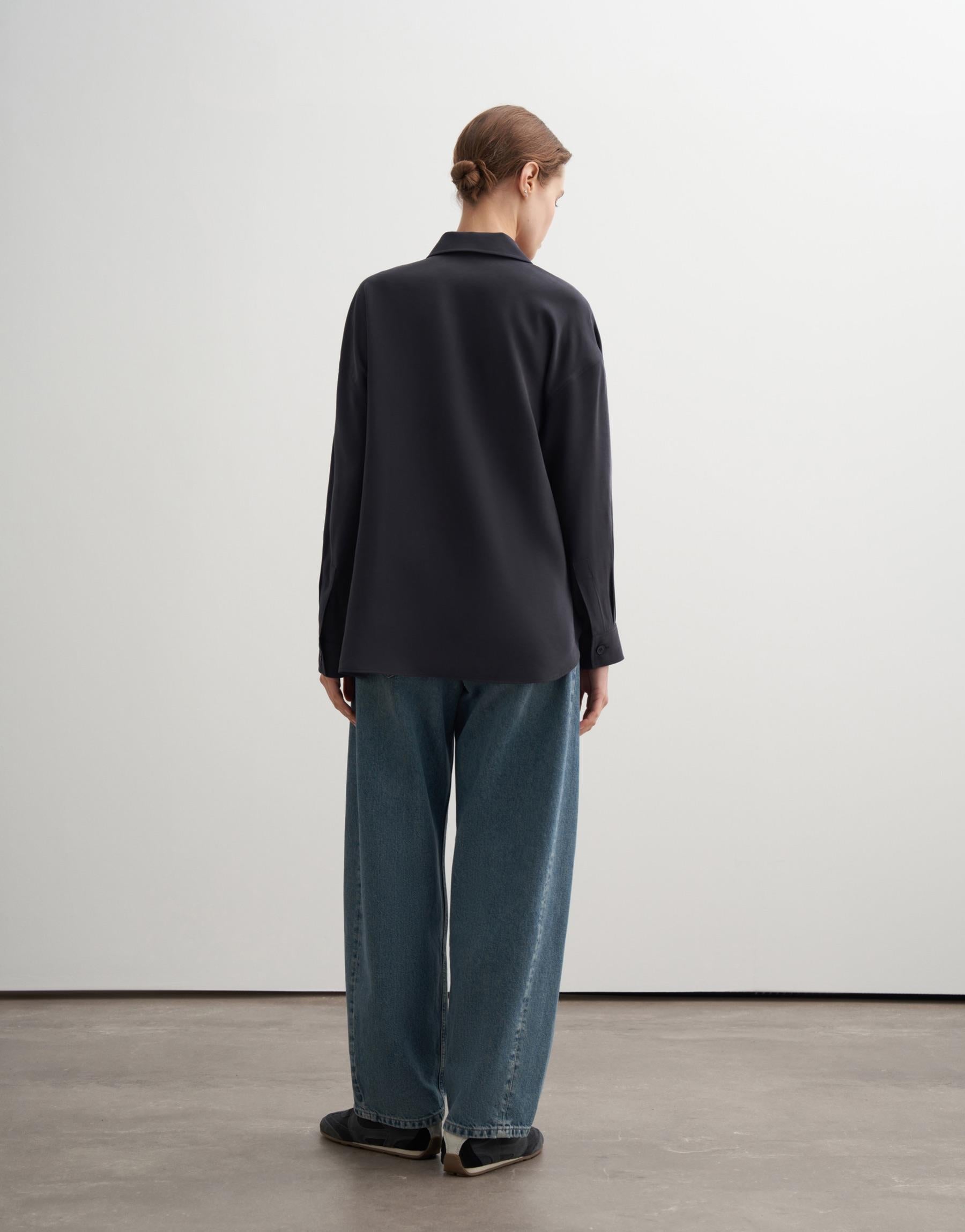 Fit: Relaxed, fluid silhouette with concealed placket and zipper closure