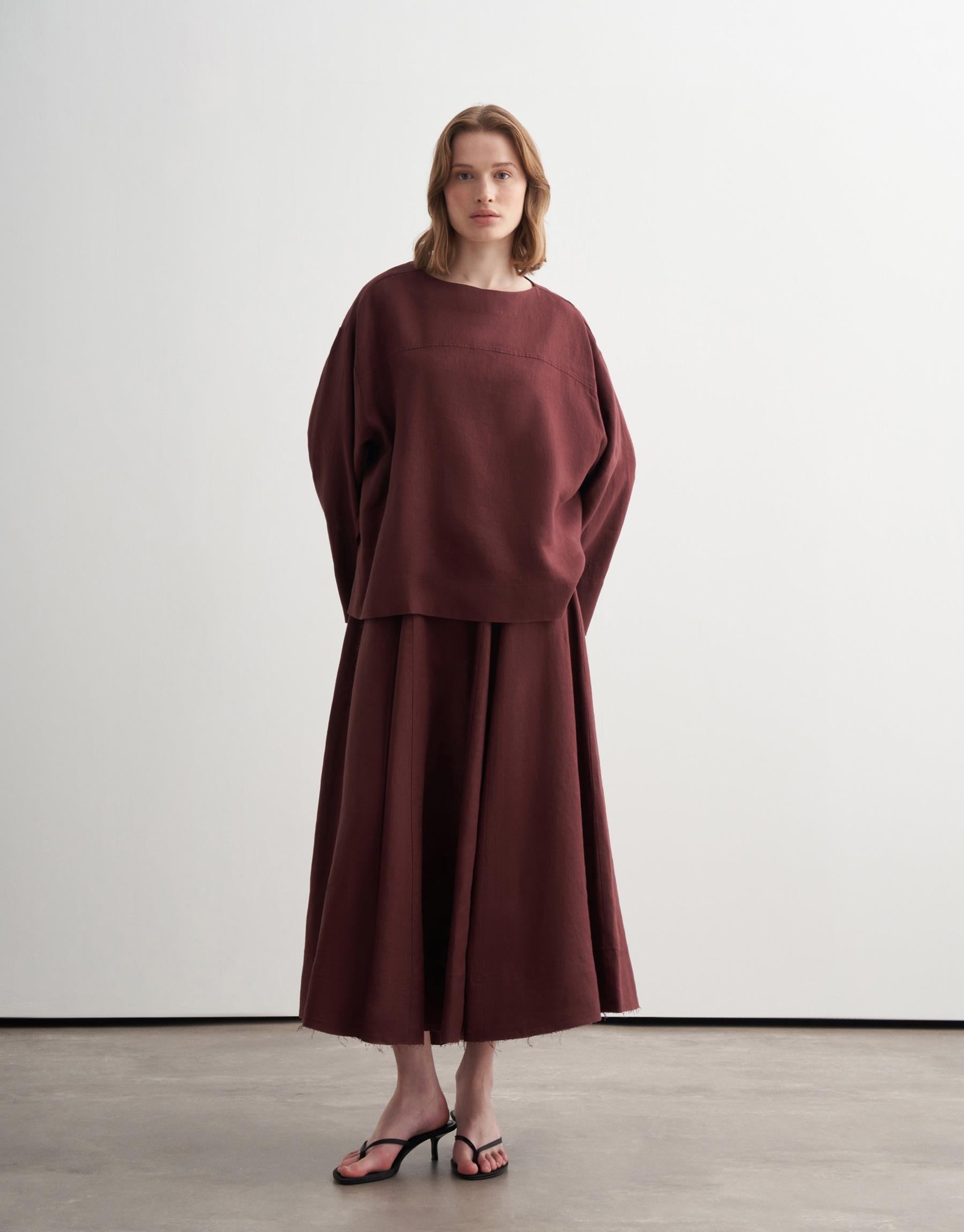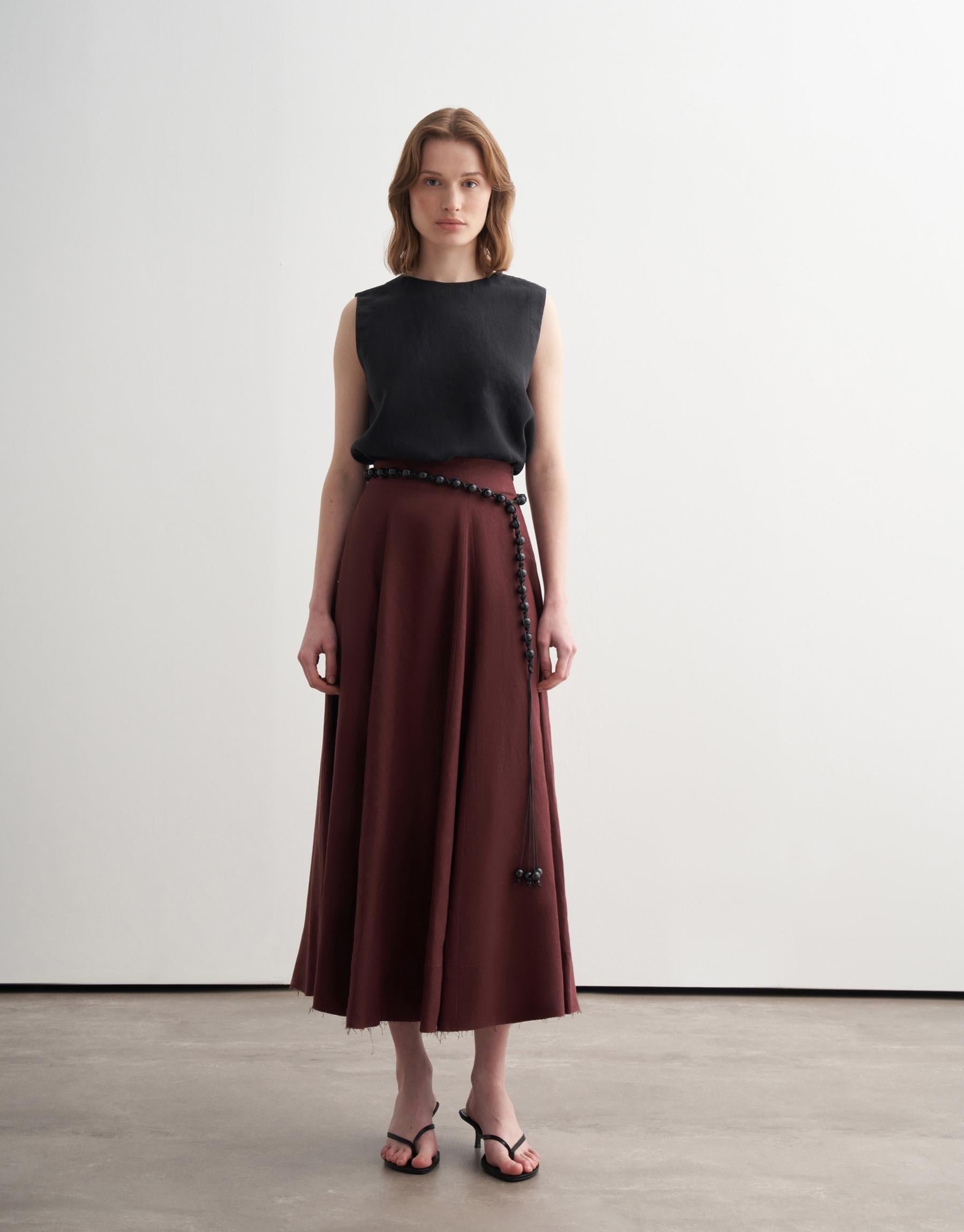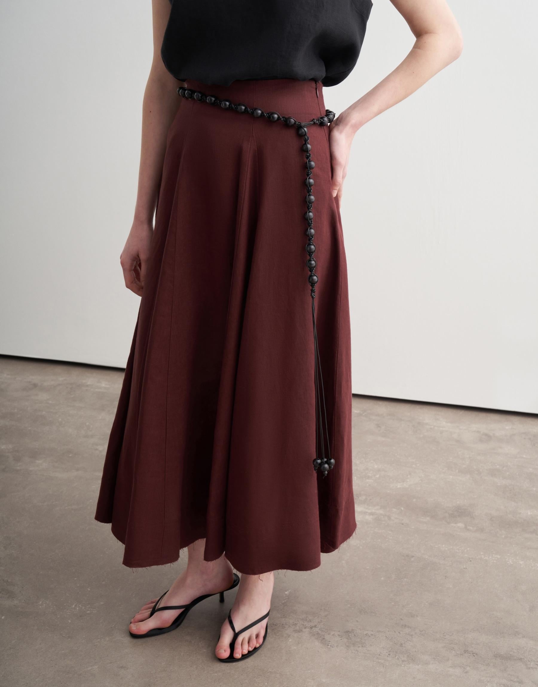 A refined composition of structure and movement, this paneled skirt is crafted from premium linen with a naturally breathable texture. The segmented construction enhances volume and flow, while the clean waistband and concealed zip closure maintain a polished silhouette. Subtle raw-edge detailing at the hem adds a modern, understated character.