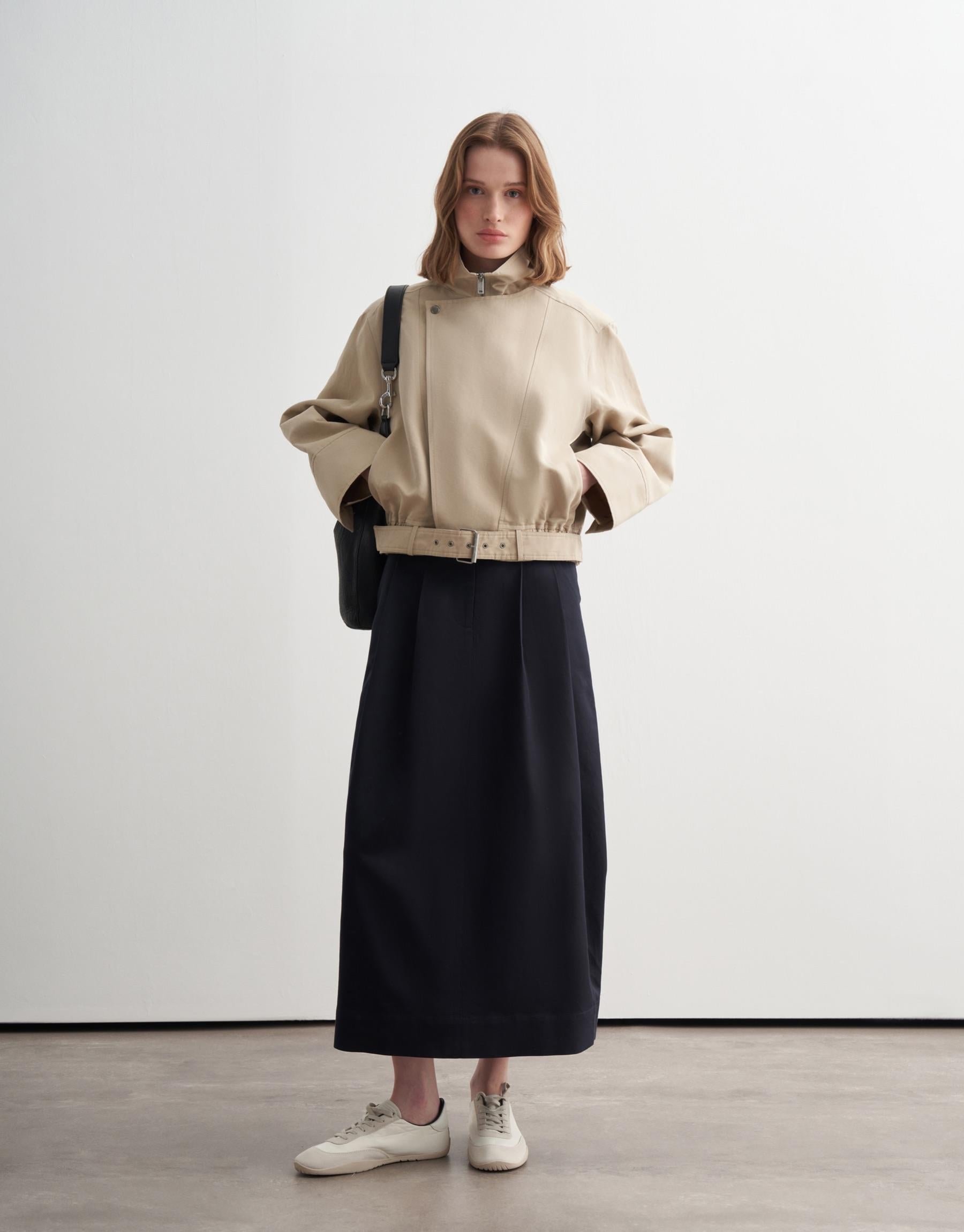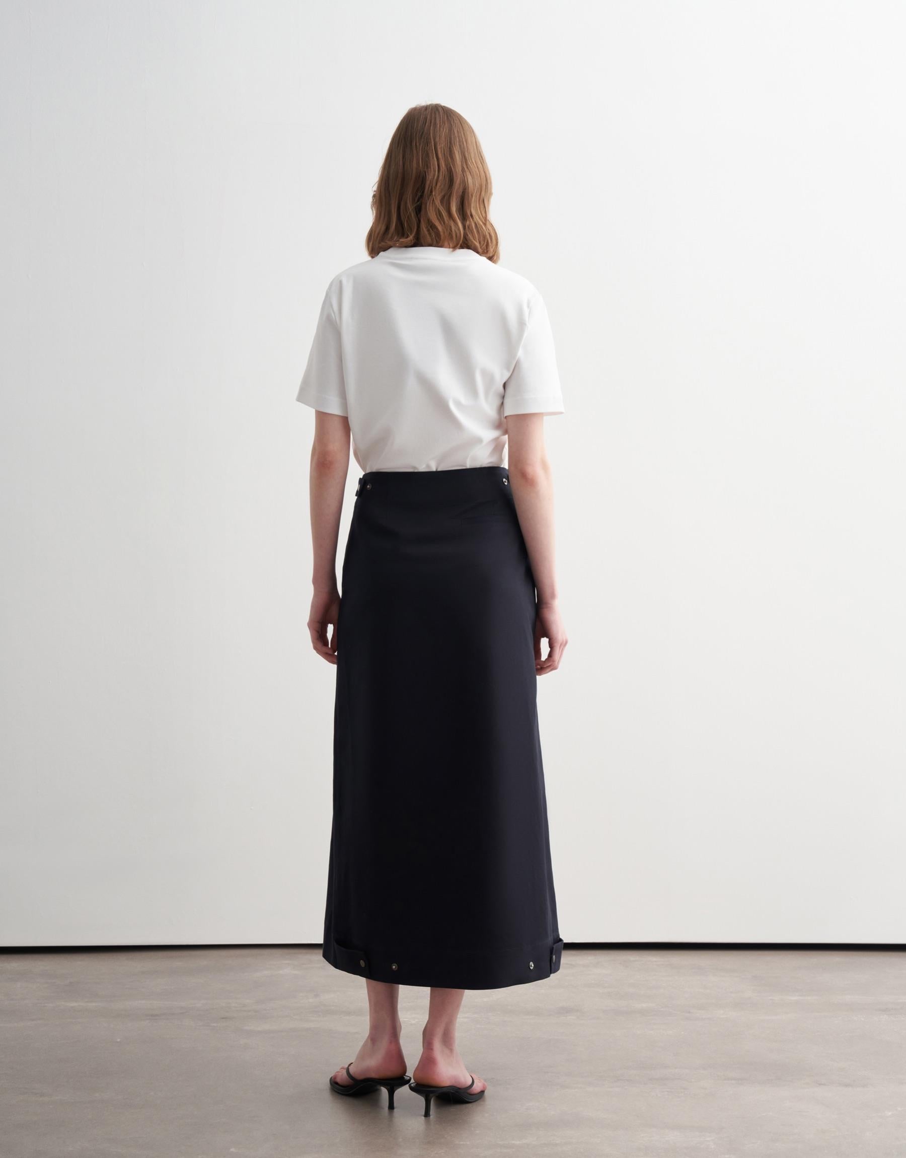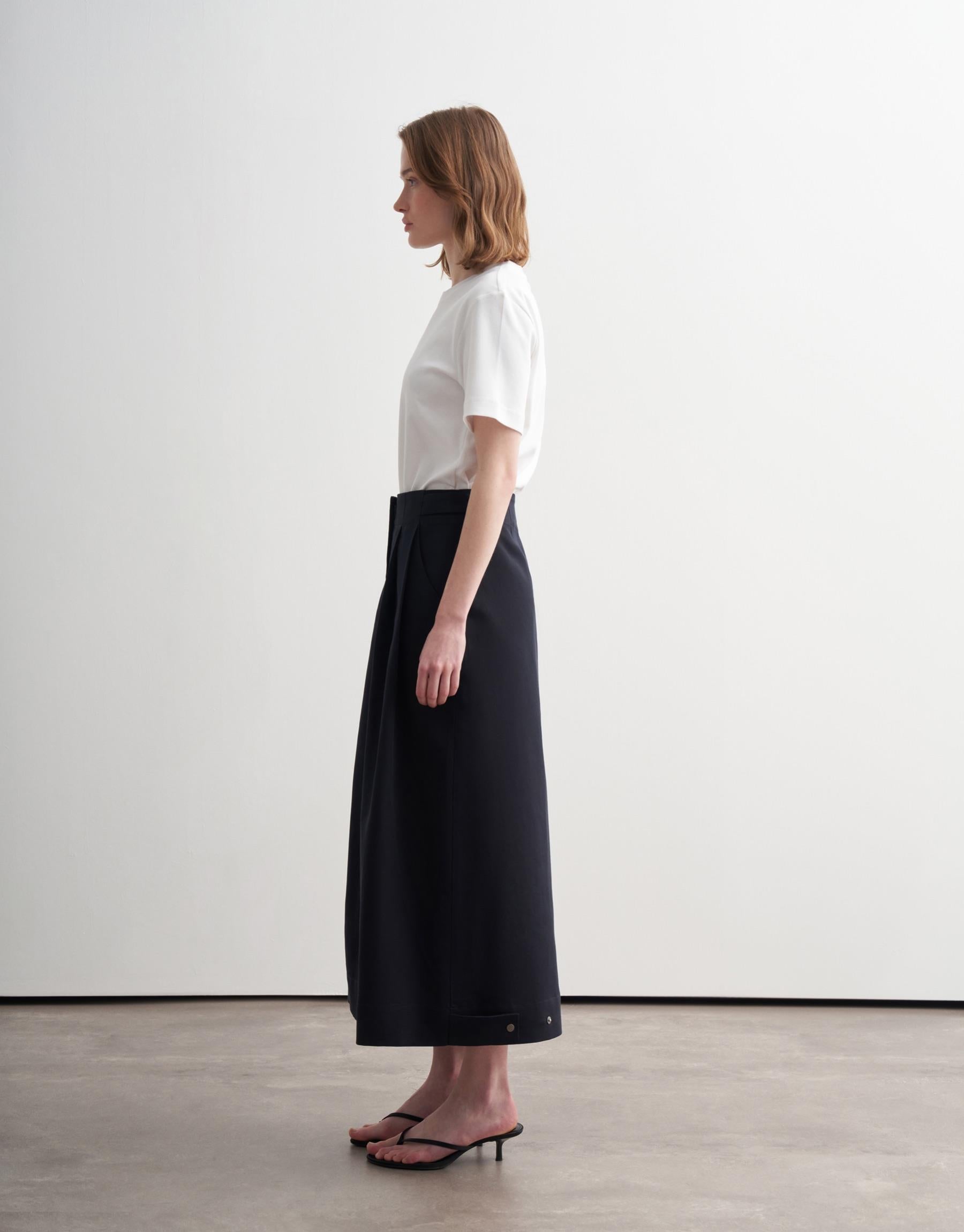 A structured yet versatile piece defined by clean pleats and functional detailing. Designed with adjustable snap buttons at the waist and hem, this skirt allows subtle customization of shape and volume, offering both practicality and a refined silhouette. The fabric blend provides a balanced texture — breathable with a gentle structure suitable for everyday wear.