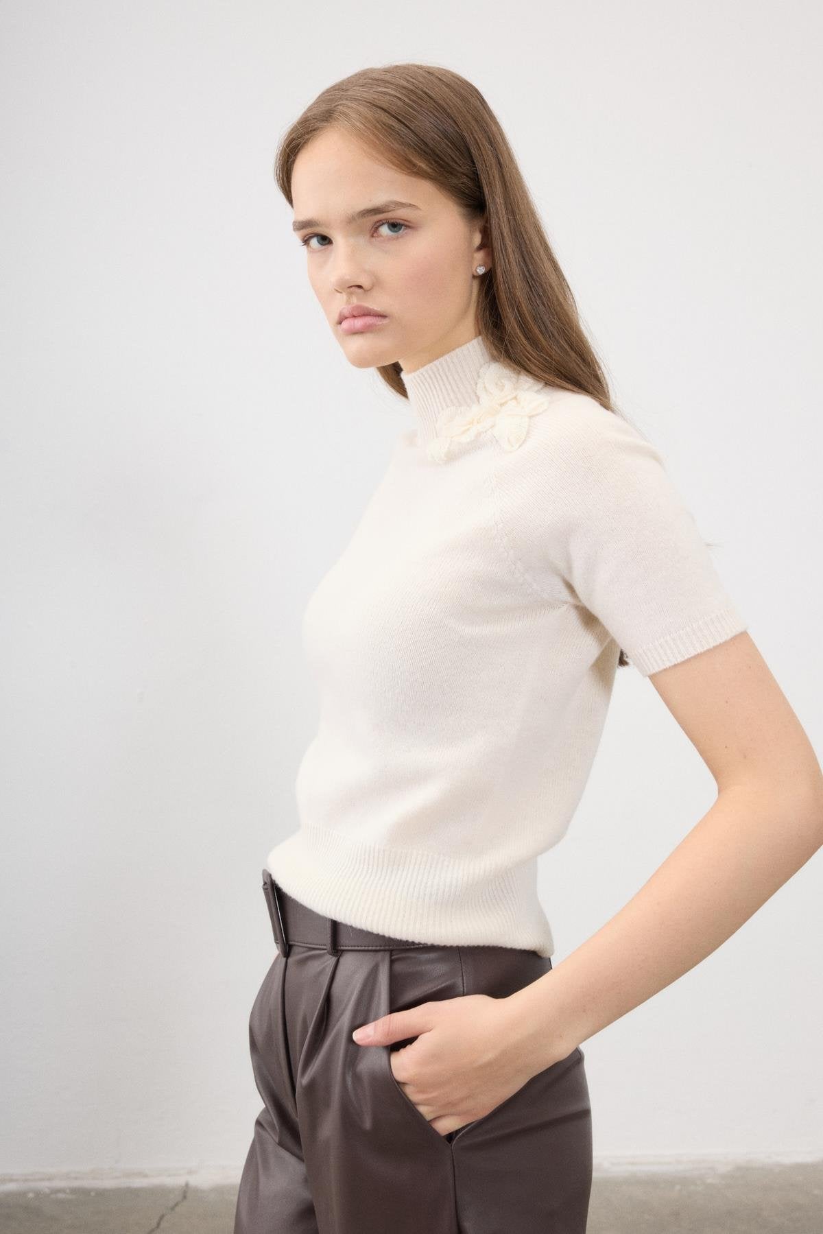 Designed for refined autumn–winter styling, the Hir blouse presents a clean, elegant silhouette with subtle artisanal detailing. Crafted from 100% wool knit, this short-sleeve design offers natural warmth and a soft, breathable feel against the skin. The structured high neckline is accented with delicate floral knit embellishments on one shoulder, adding a quiet statement without overpowering the minimalist aesthetic. A ribbed hem and sleeves ensure a polished finish, making Hir an effortless choice for workwear, refined daytime looks, or elevated layering under jackets and coats.