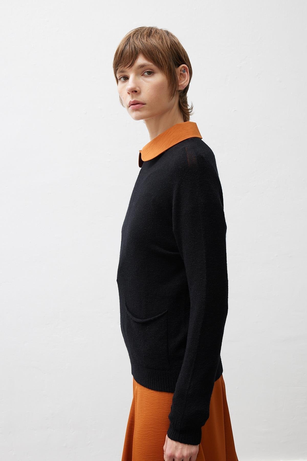 Fit: Relaxed straight silhouette; long sleeves; functional front pockets with decorative metal accents; soft knit texture; designed for autumn–winter layering