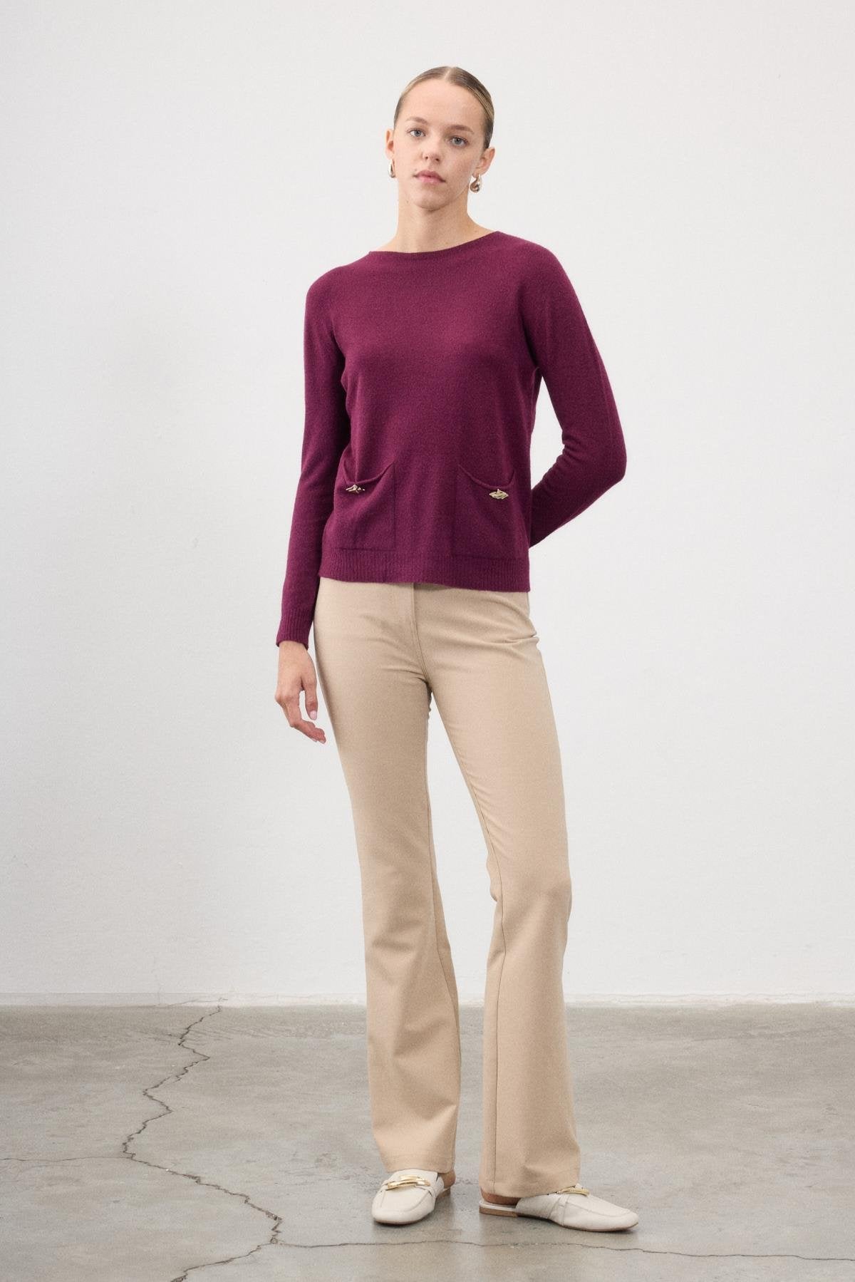 Designed for autumn–winter wear, the Yasemin knit sweater offers a refined balance of everyday comfort and understated elegance. Crafted from a soft imported knit blend, this design features a clean, minimalist silhouette enriched with functional front pockets accented by subtle metallic details. The smooth texture and lightweight warmth make it ideal for layering or standalone styling, while the relaxed structure ensures effortless wear from day to evening. A versatile essential for modern wardrobes, Yasemin delivers timeless simplicity with a polished finish.