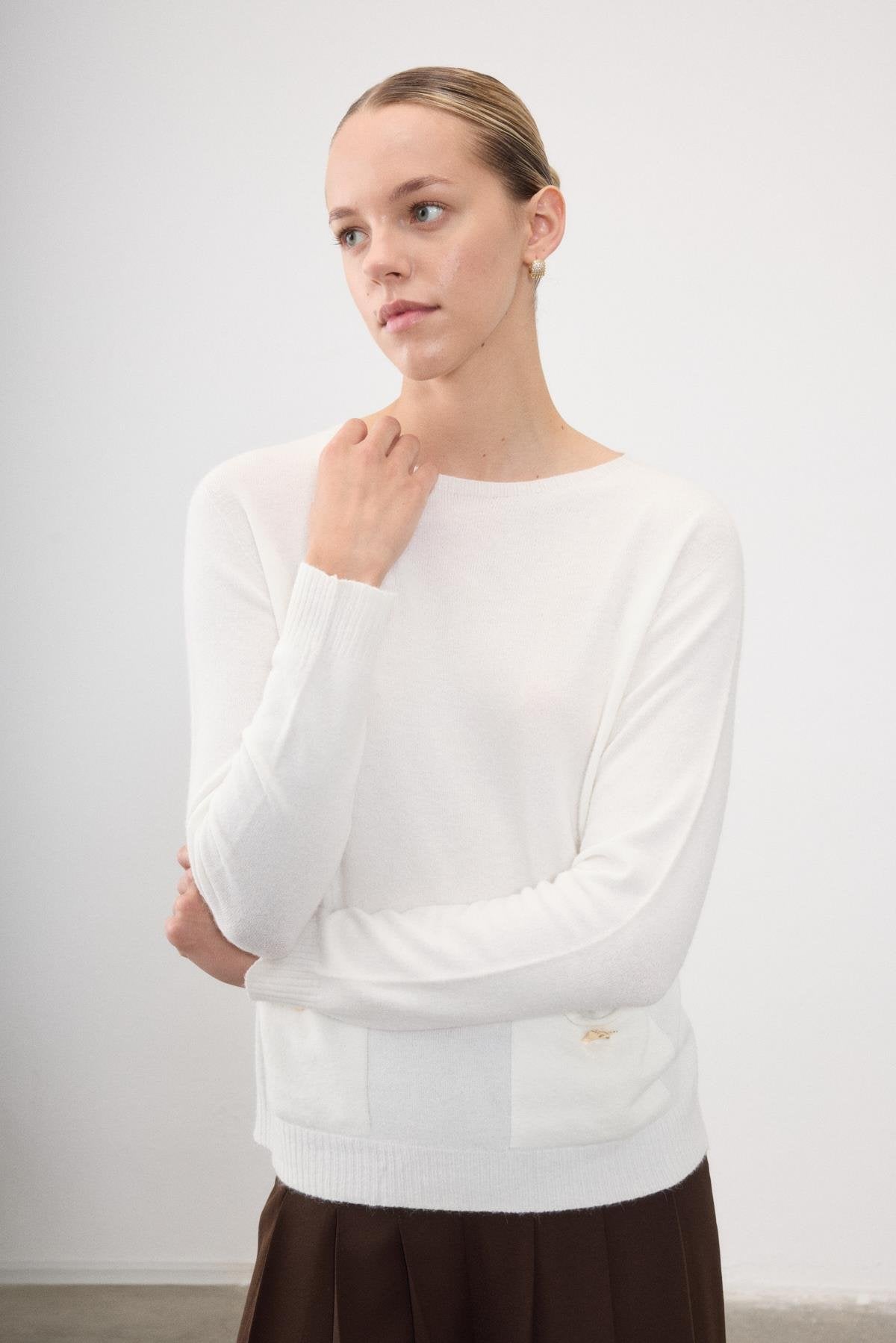 Fit: Relaxed straight silhouette; long sleeves; functional front pockets with decorative metal accents; soft knit texture; designed for autumn–winter layering