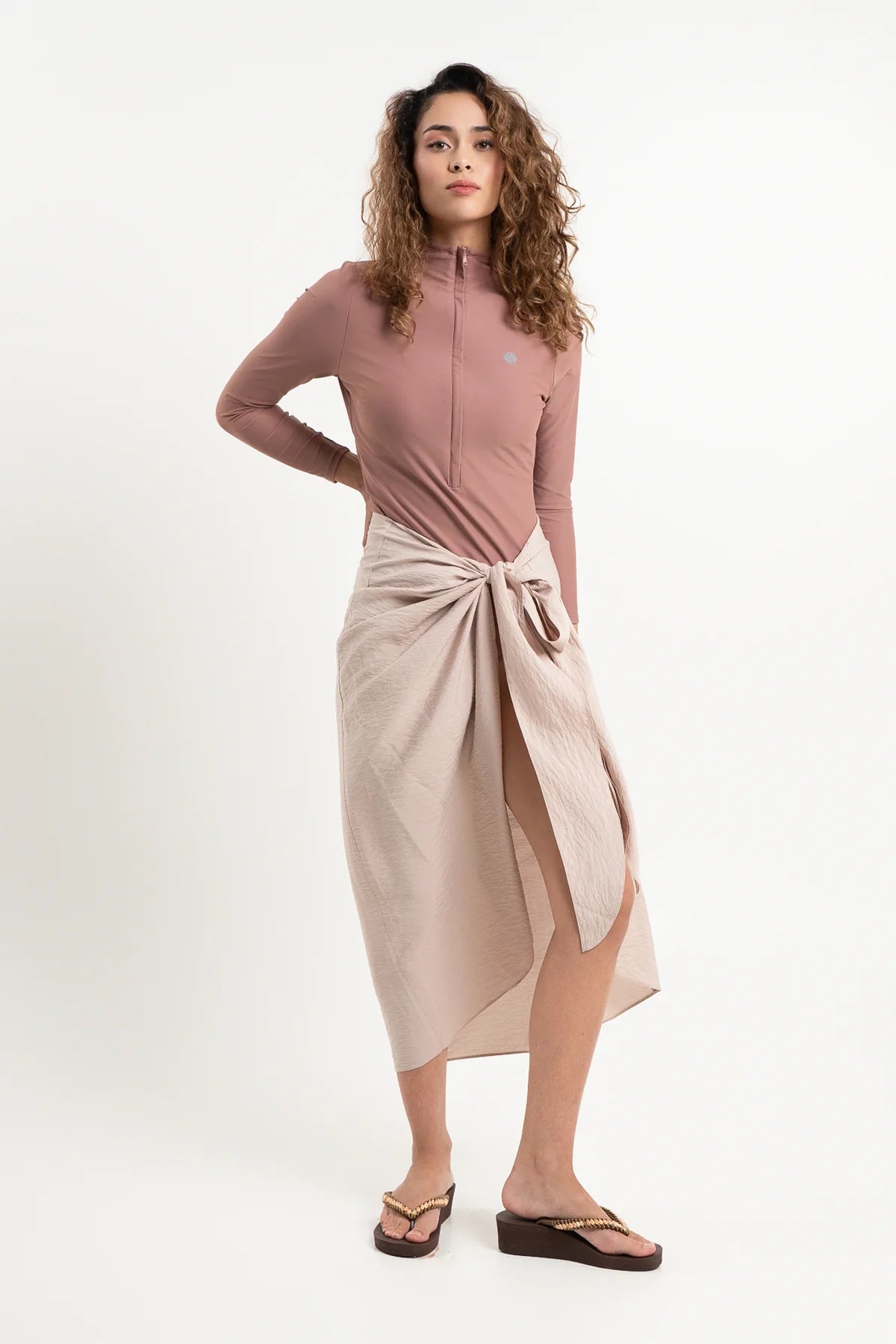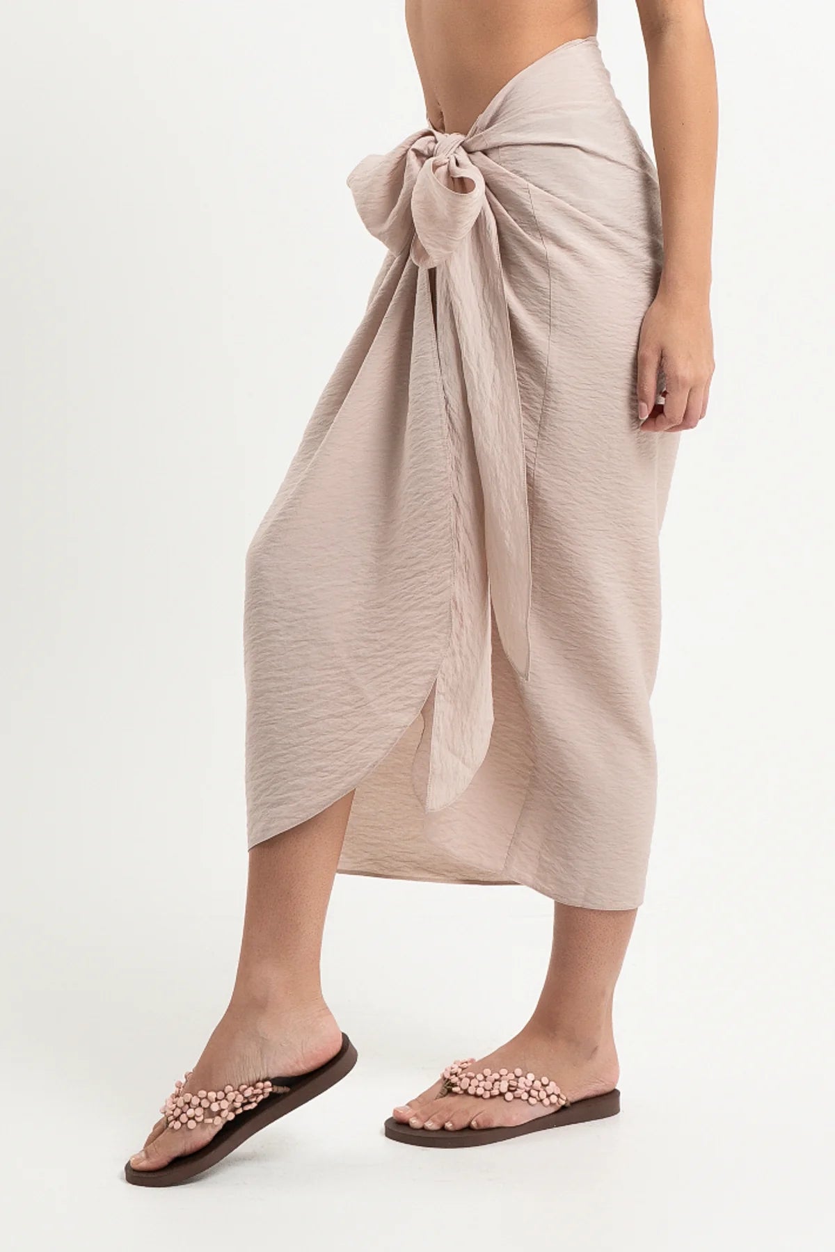 Designed for resort and warm-weather wear, the Clea sarong embodies effortless elegance with a refined, versatile character. Crafted from a lightweight sustainable fabric blend, this wrap skirt offers a soft, breathable feel with a fluid drape that moves naturally with the body. The multi-way design allows the draped ties to be wrapped and styled in different ways, creating an elegant knot effect or a flattering double-twist with gentle ruching. Chic yet functional, Clea is designed to elevate swim looks while remaining polished enough for beachside walks or relaxed resort styling.