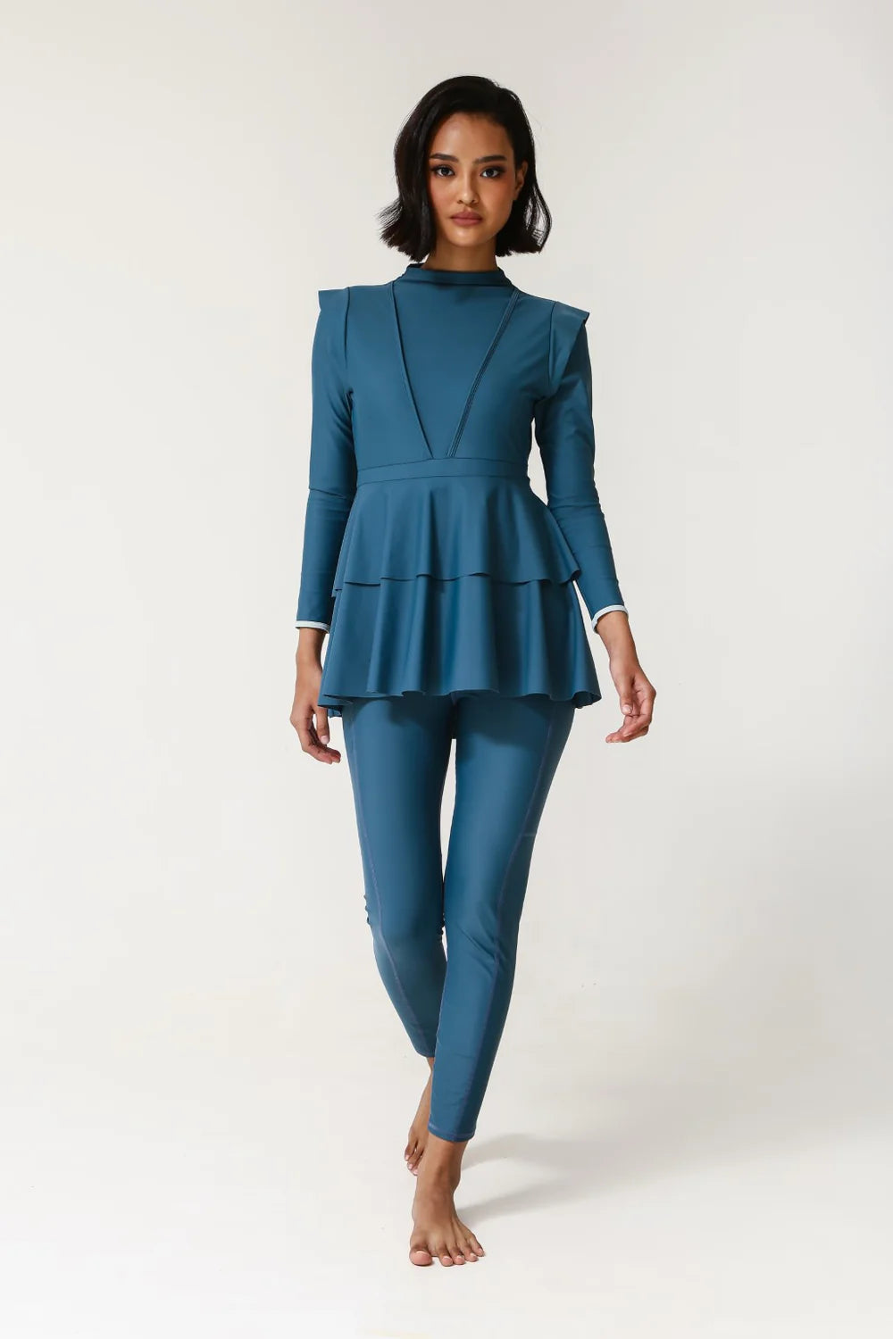 The Serena Swim Dress features long sleeves, a high neck, and an empire waist with a double-layer peplum skirt for a flattering silhouette. The cap sleeves and adjustable back zip add style. Fully lined with removable padded cups, it pairs well with Lanuuk Swim Tights or Capri Tights