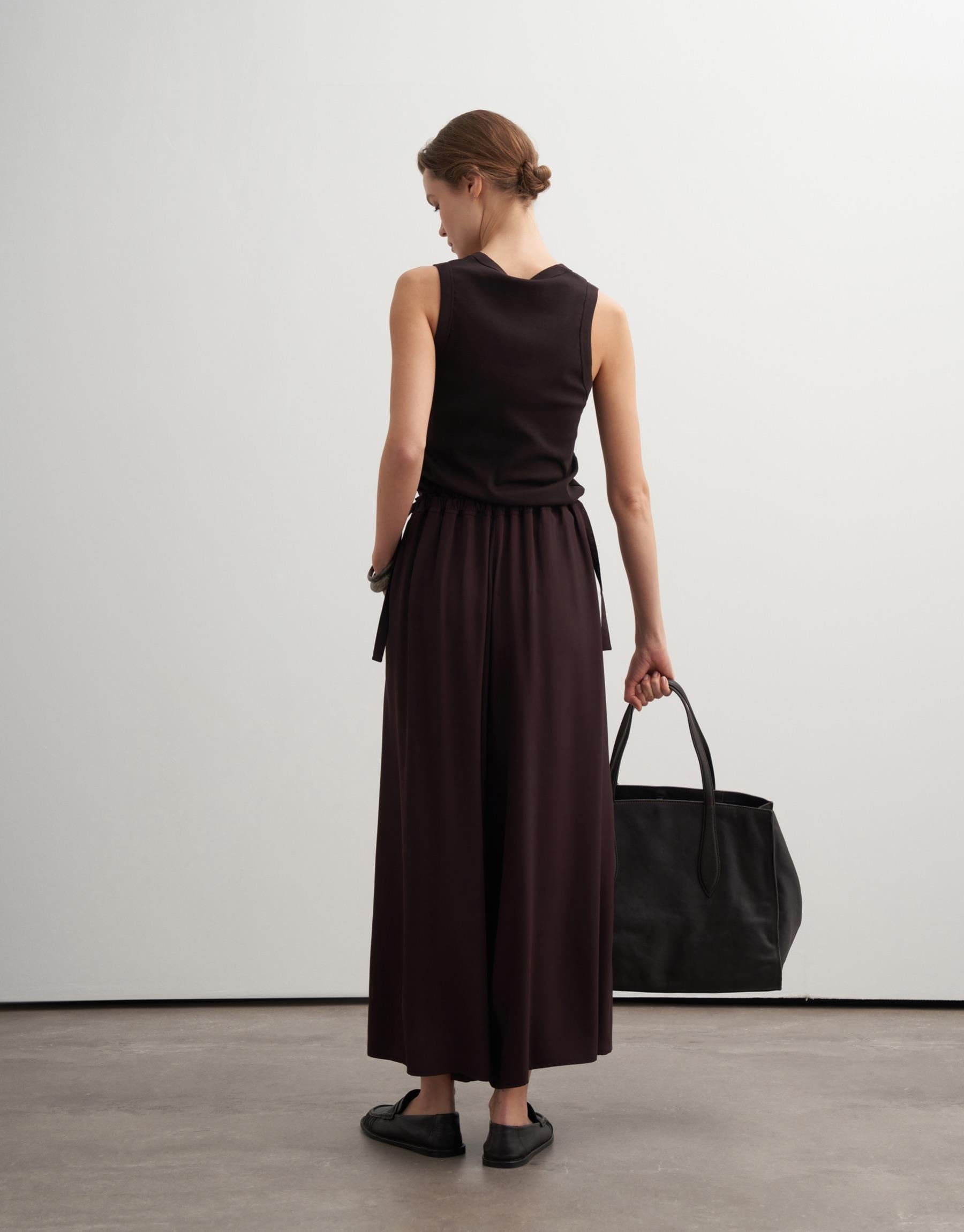 A refined interpretation of fluid tailoring, these trousers combine the elegance of a skirt with the practicality of pants. Designed with a high-rise, adjustable elastic waistband, the silhouette falls into a soft, voluminous shape that moves effortlessly with the body. The lightweight viscose fabric enhances the drape, creating a graceful and elongated line.