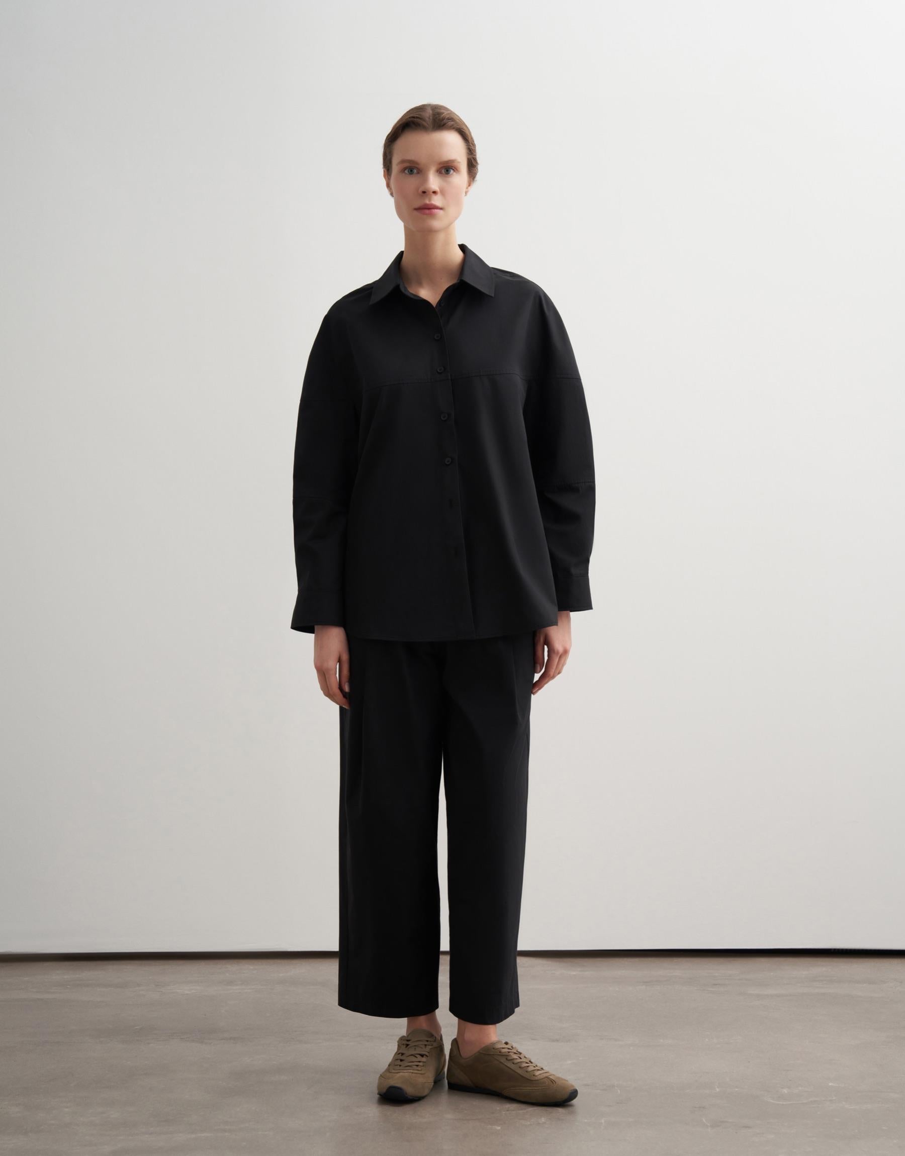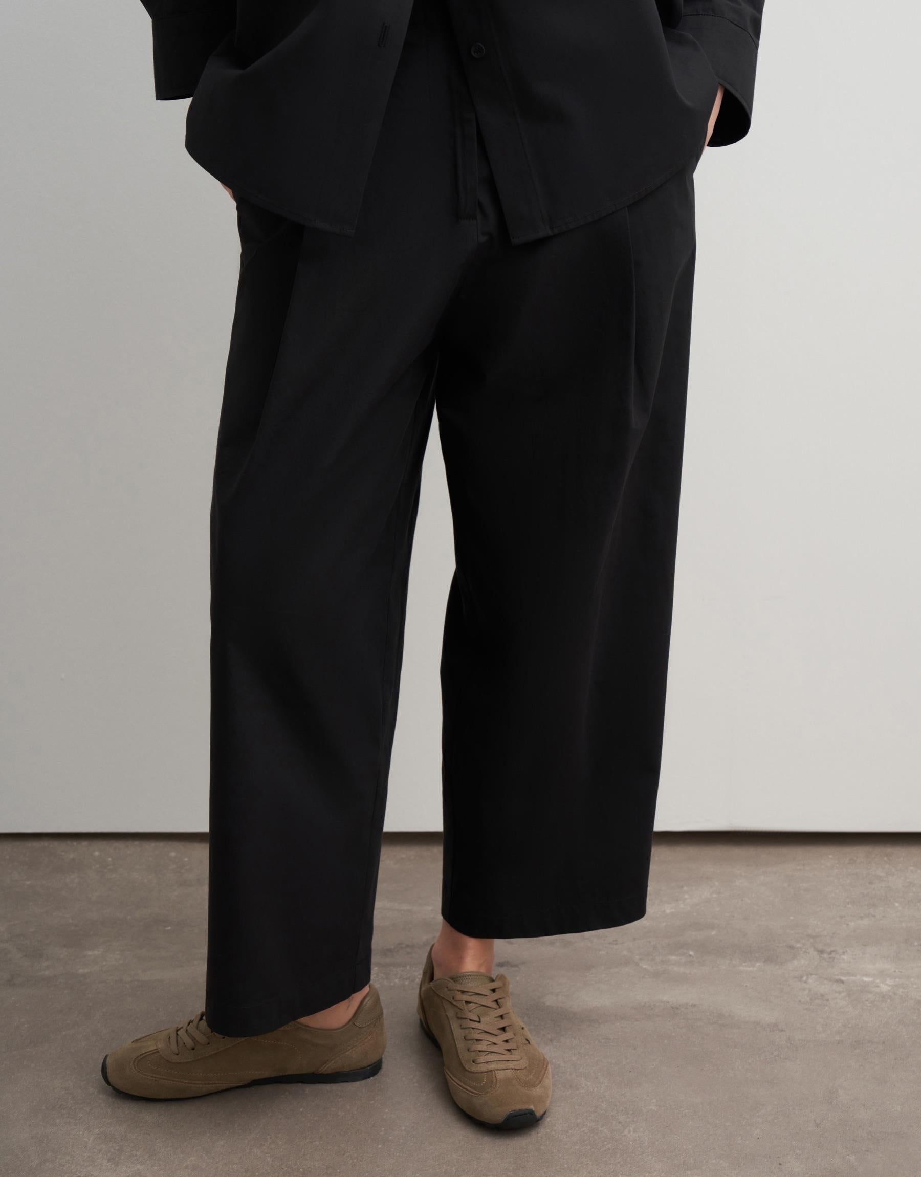 A structured yet refined piece designed to elevate everyday dressing. Tailored from pure cotton, these trousers feature front pleats that create a clean silhouette while offering ease of movement. The carrot-cut shape gently tapers, delivering a modern balance between sharp tailoring and relaxed wearability.