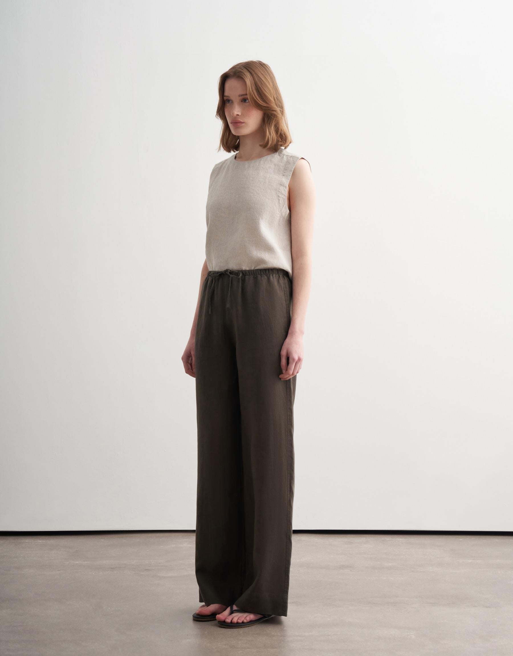 A refined essential defined by ease and natural texture, these palazzo trousers offer a fluid silhouette with understated elegance. Crafted from premium European flax linen, they feature a soft elasticated waistband and a relaxed wide-leg cut, delivering breathable comfort with a polished, minimalist finish.