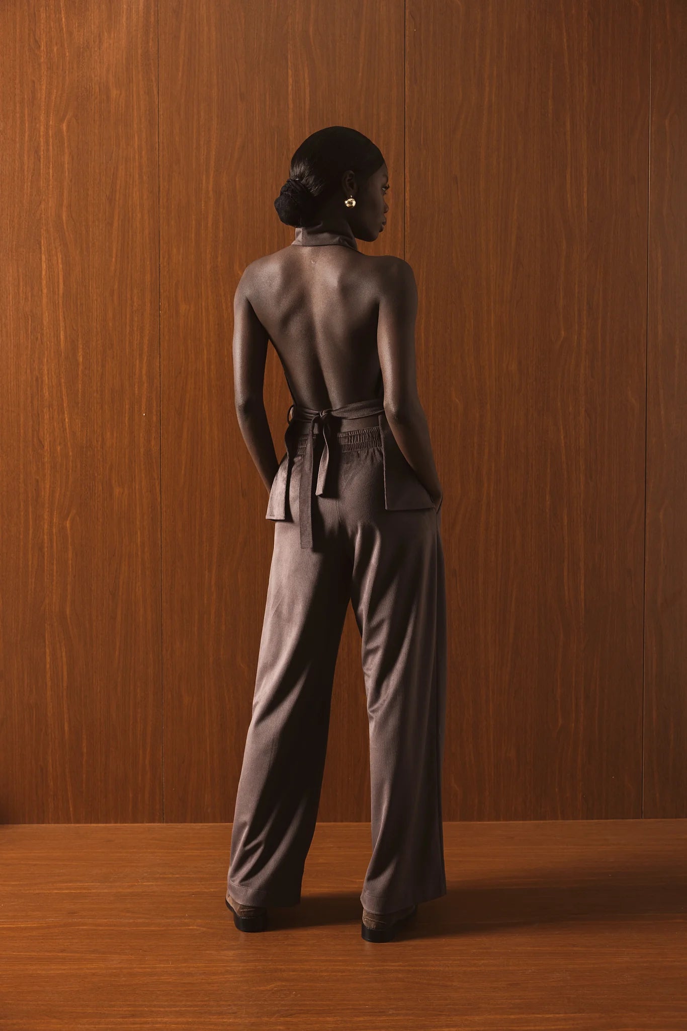Designed with a relaxed silhouette and fluid drape, these velvet trousers embody effortless sophistication. The wide-leg cut creates an elongated, modern line, while the elasticated waistband ensures day-long comfort. Finished with side pockets and a soft velvet texture, they balance ease with refined structure.