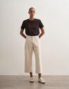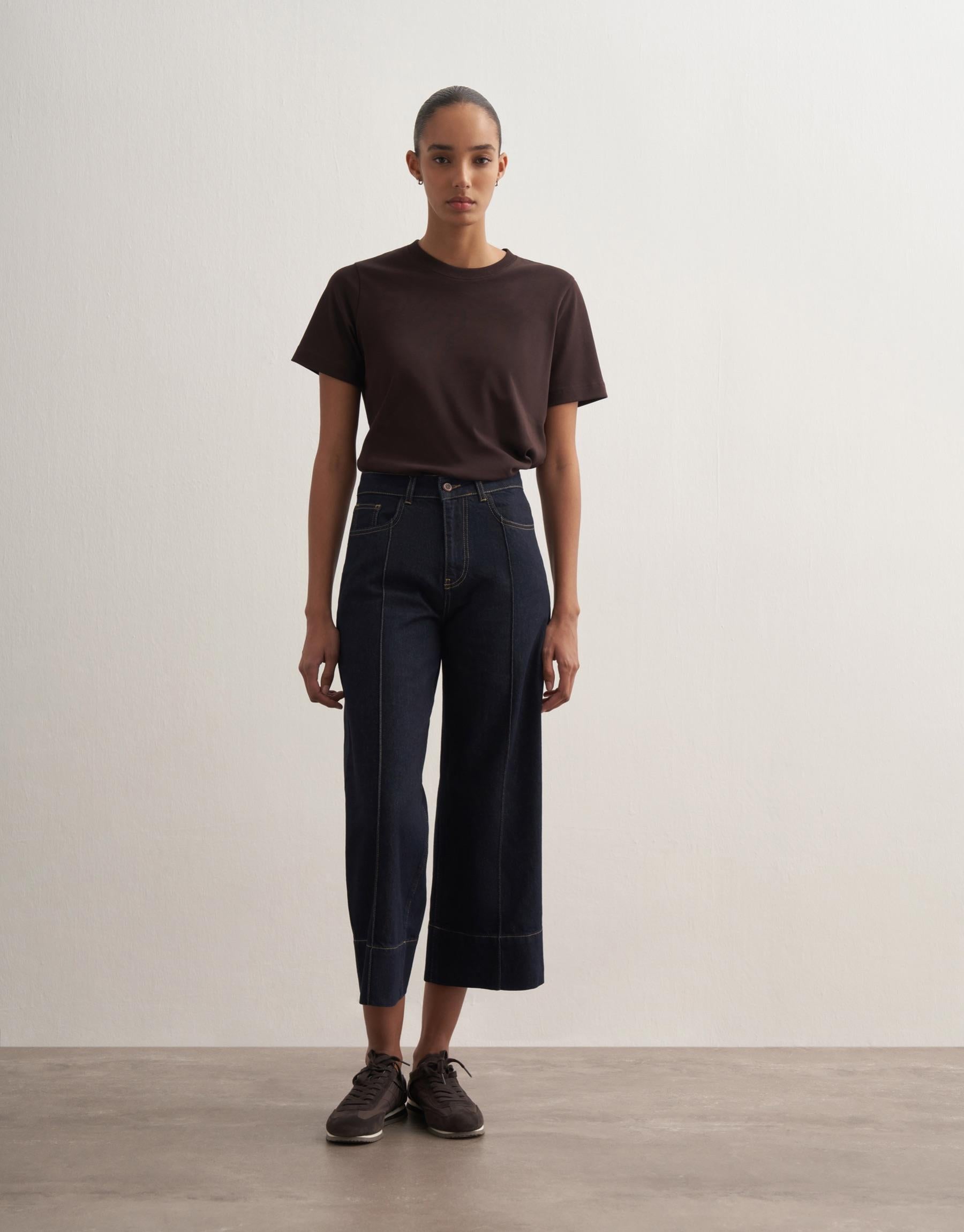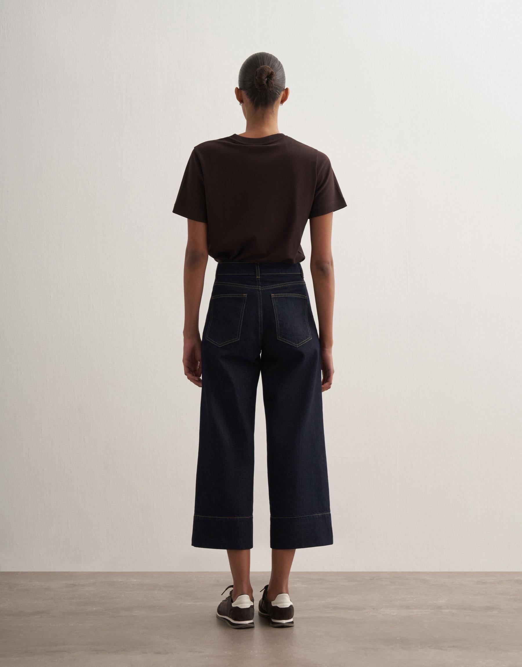 A structured yet relaxed silhouette defines this cropped denim, offering a modern interpretation of classic wide-leg jeans. Crafted from pure cotton, the fabric holds its shape while softening over time, creating a naturally refined look. The cropped length adds a contemporary edge, making it versatile for both casual and elevated styling.