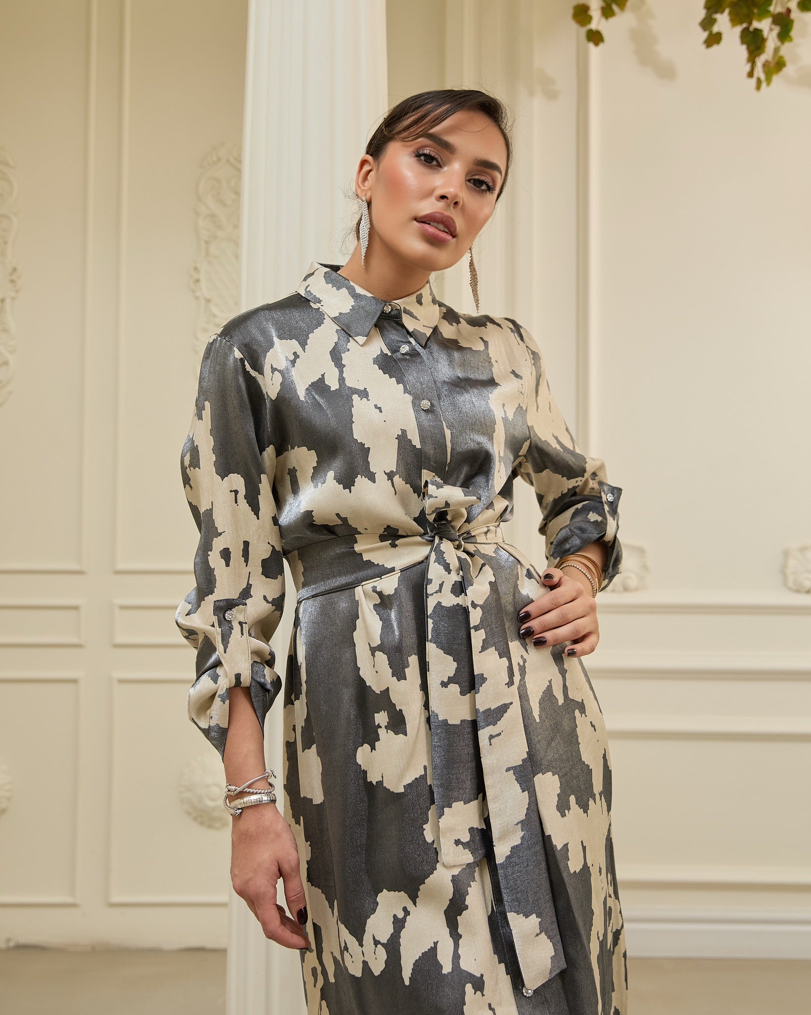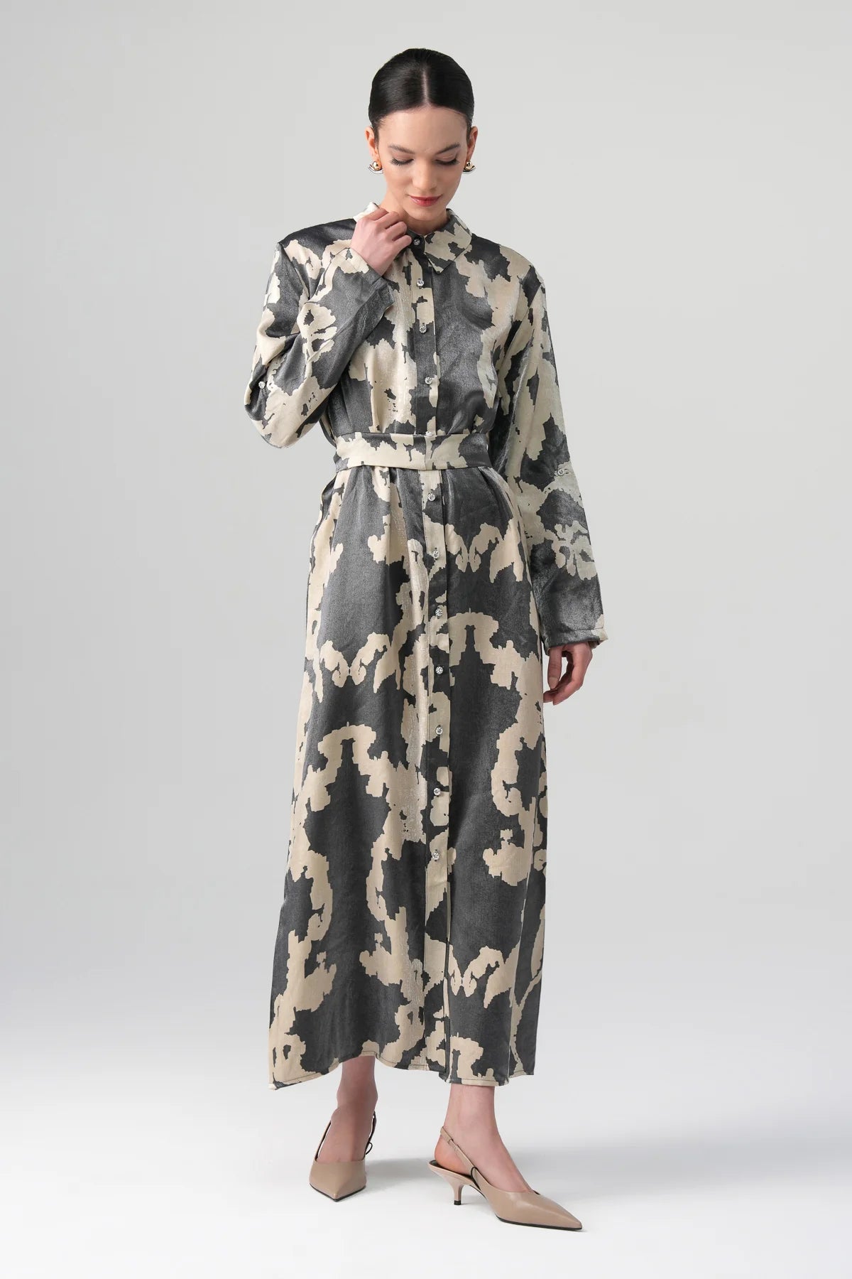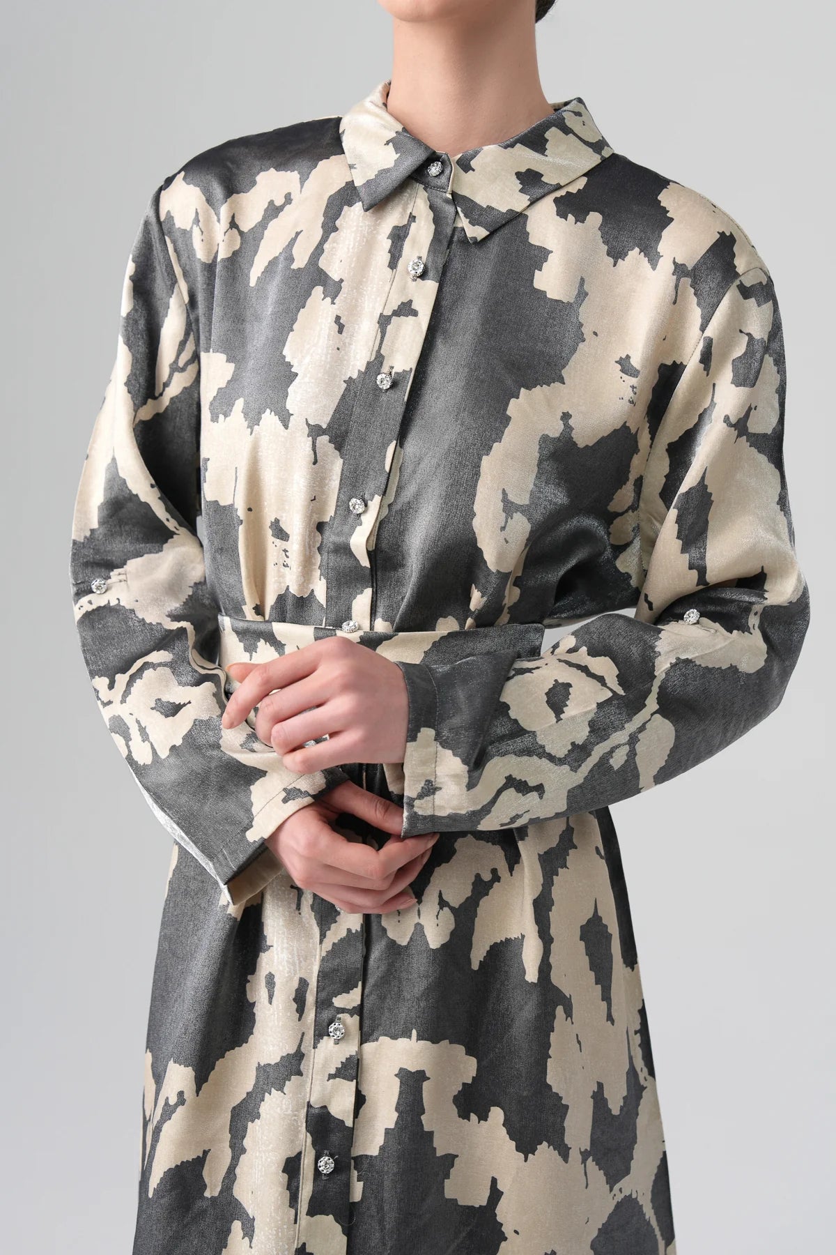 This shirt dress is crafted from lightweight metallic satin, offering a subtle sheen that elevates its refined silhouette. It features a pointed collar, crystal-embellished button details, and a detachable waist tie for versatile styling. The soft drape of the fabric enhances movement, while the abstract two-tone pattern adds a modern artistic touch — ideal for evening occasions or elevated daytime looks.
