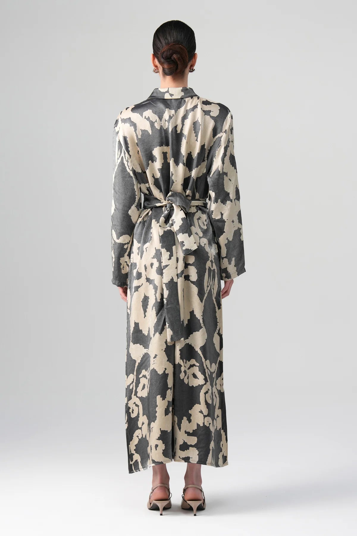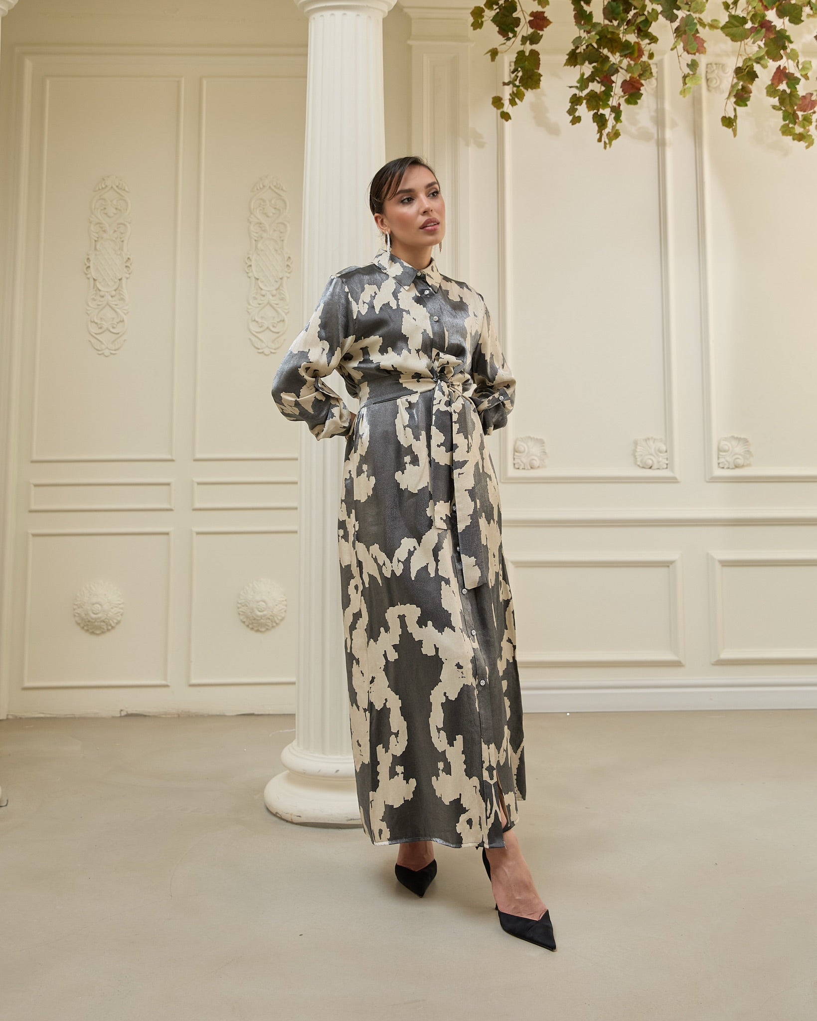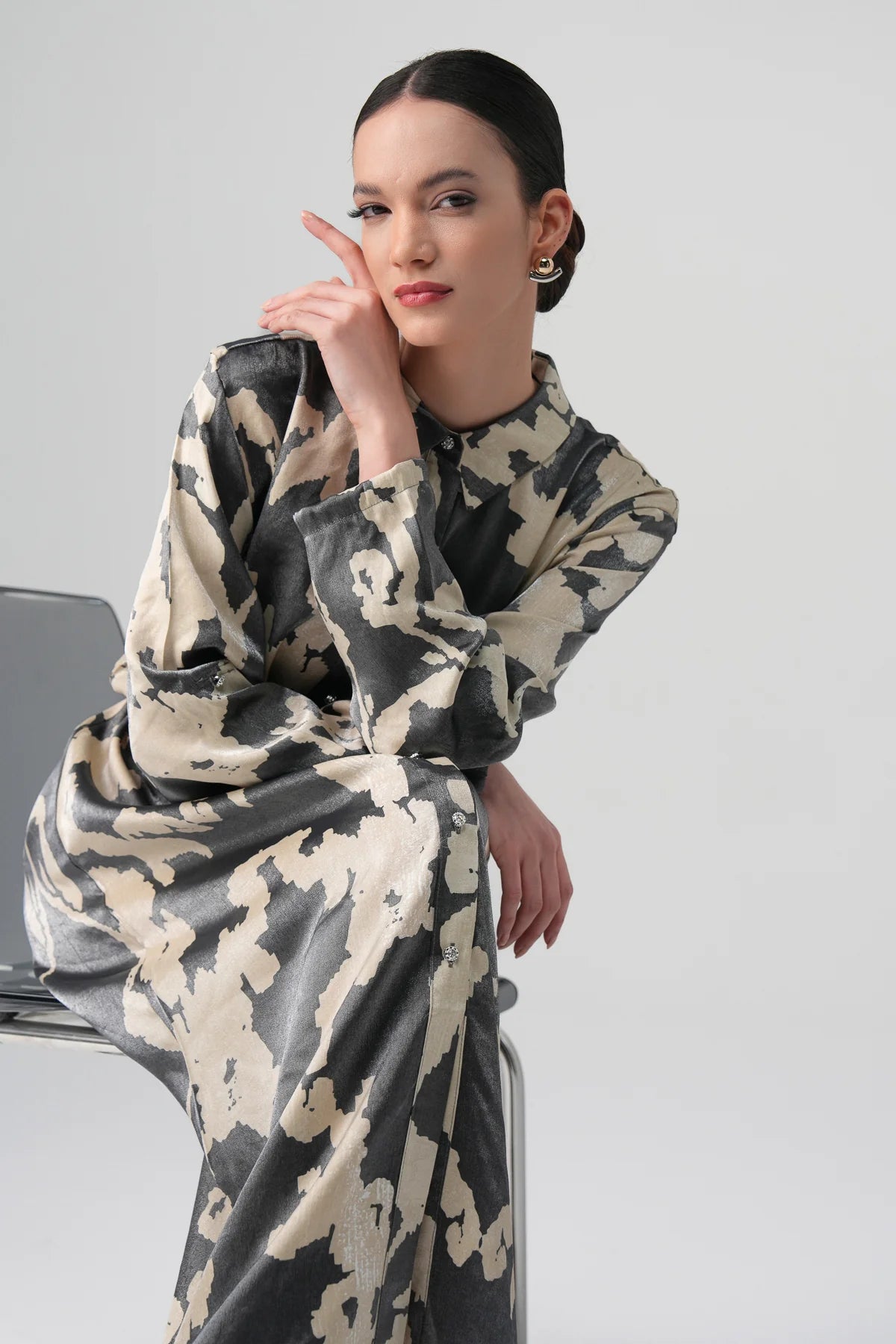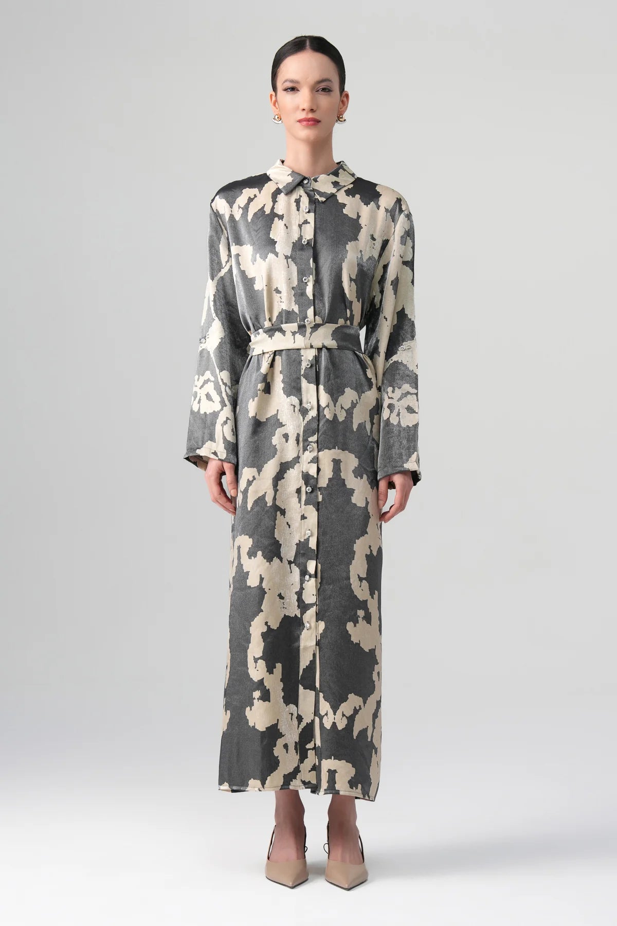 This shirt dress is crafted from lightweight metallic satin, offering a subtle sheen that elevates its refined silhouette. It features a pointed collar, crystal-embellished button details, and a detachable waist tie for versatile styling. The soft drape of the fabric enhances movement, while the abstract two-tone pattern adds a modern artistic touch — ideal for evening occasions or elevated daytime looks.